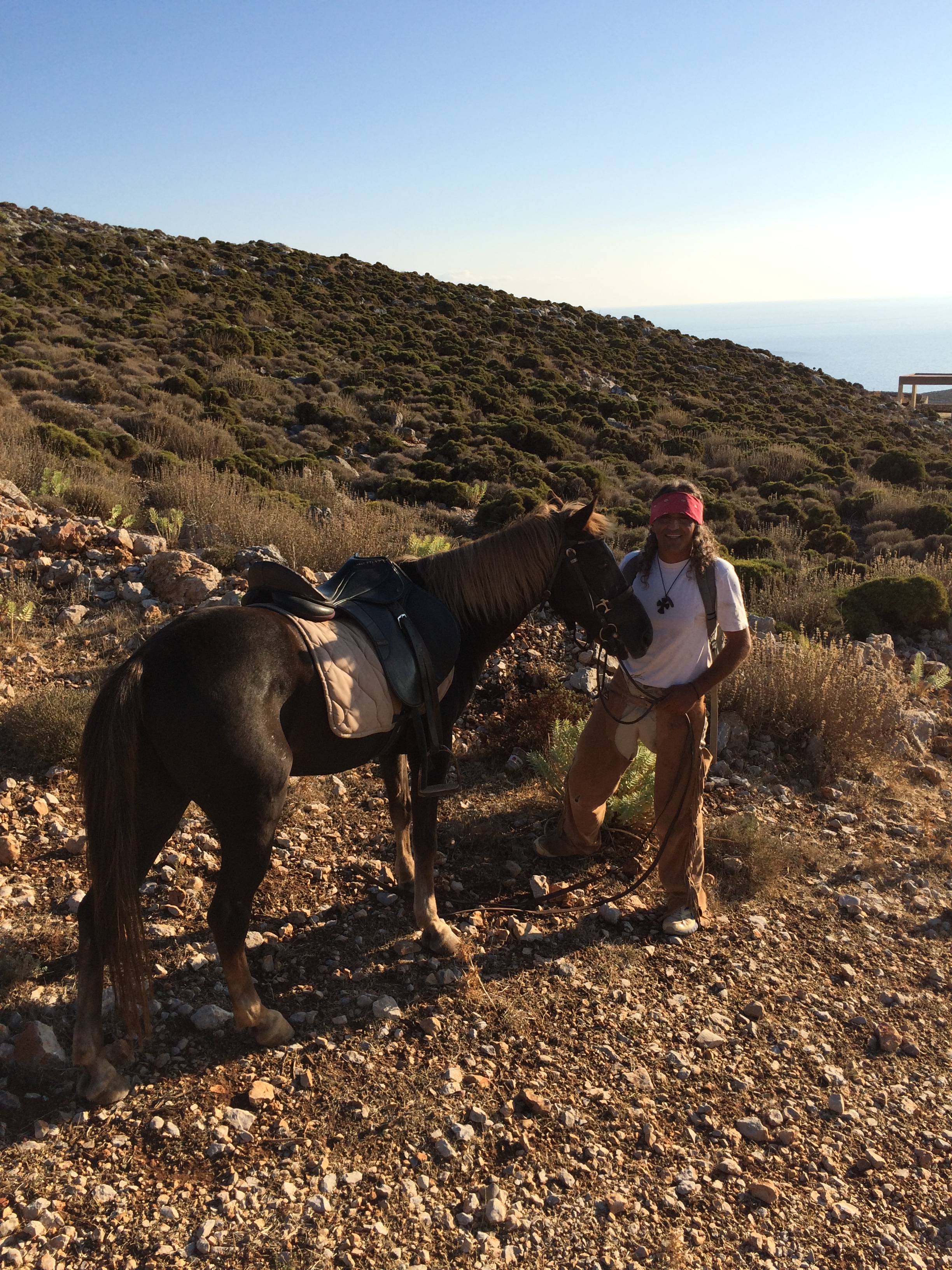 Retki alkoi kiipeilykaupalta. Intiaanin näköinen kaveri oli jo odottelemassa meitä kaupan terassilla. Ajelimme saaren toiselle puolelle Pothian taakse. Perillä meitä odotti kolme hevosta valmisteltuna ratsastusta varten. Yksi pieni, joka oli kuulemma kreikkalainen maalaishevonen, pieni ja sitkeä, sekä kaksi isompaa hevosta. Homma alkoi vähän huonosti, kun minulle tarkoitettu hevonen jostain syystä säikähti minua kun olin nousemassa selkään. Epäilimme aurinkolaseja joissa oli peilimäinen pinta, ehkä joku heijastus säikäytti. Lopulta polle rauhoittui, mutta retken vetäjän otti aluksi vikuroivan hepan ja minä sain pienen maatiaisratsun. Sinänsä vähän hassua, kun minun jalat ylettyivät melkein maahan asti. Hieman epäluuloisena se kaveri katselikin, mutta enhän minä nyt niin painava kuitenkaan ole…