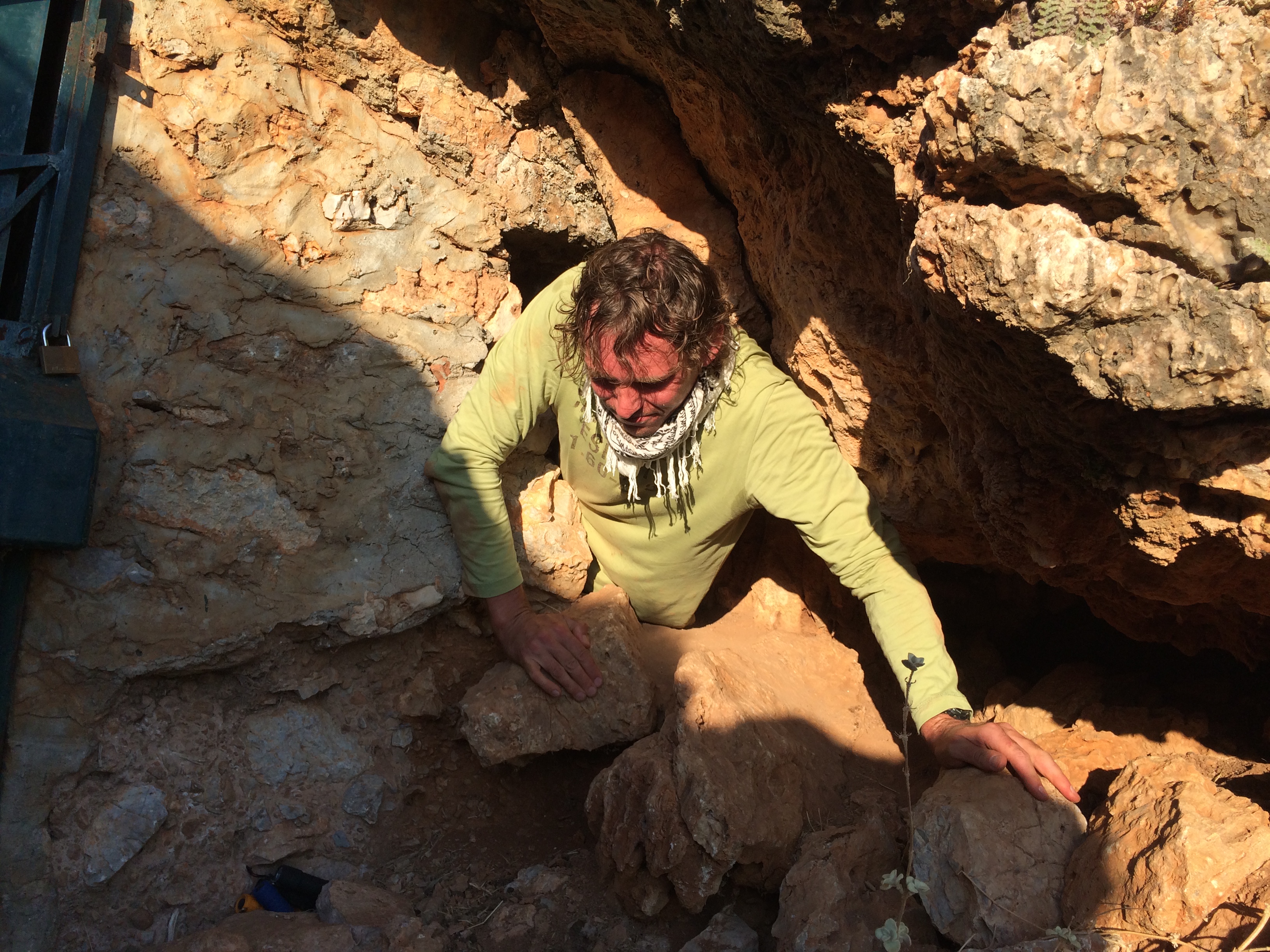 Puolessa välissä pysähdyimme tippukiviluolalla. Vauhko ori katseli minua edelleen epäluuloisena, mutta ilmeisen tyytyväisenä, että pysyin turvallisen välimatkan päässä. Jätimme ratsut lepäilemään ja kävelimme jonkin matkaa polkua kohti meren rantaa upeissa maisemissa. Polun päästä löytyi lukittu rautaovi, jossa oli paikallisten turistiviranomaisten ilmoitus aukioloajoista tms. Oletimme tietysti, että oppaallamme on oveen avain, mutta mitä vielä. Meidän reitti kulki juuri ja juuri ihmisen mentävän noin metrin mittaisen pölyisen aukon kautta taskulamppujen kanssa ryömimällä…eikä sisäpuolelle pinotut kypärätkään meitä varten olleet…no Massourin pääkadun varrella olevassa mainoksessa kuitenkin selkeästi sanottiin, että luolassa käynti kuuluu ohjelmaan, että kaippa tämä ihan virallista…