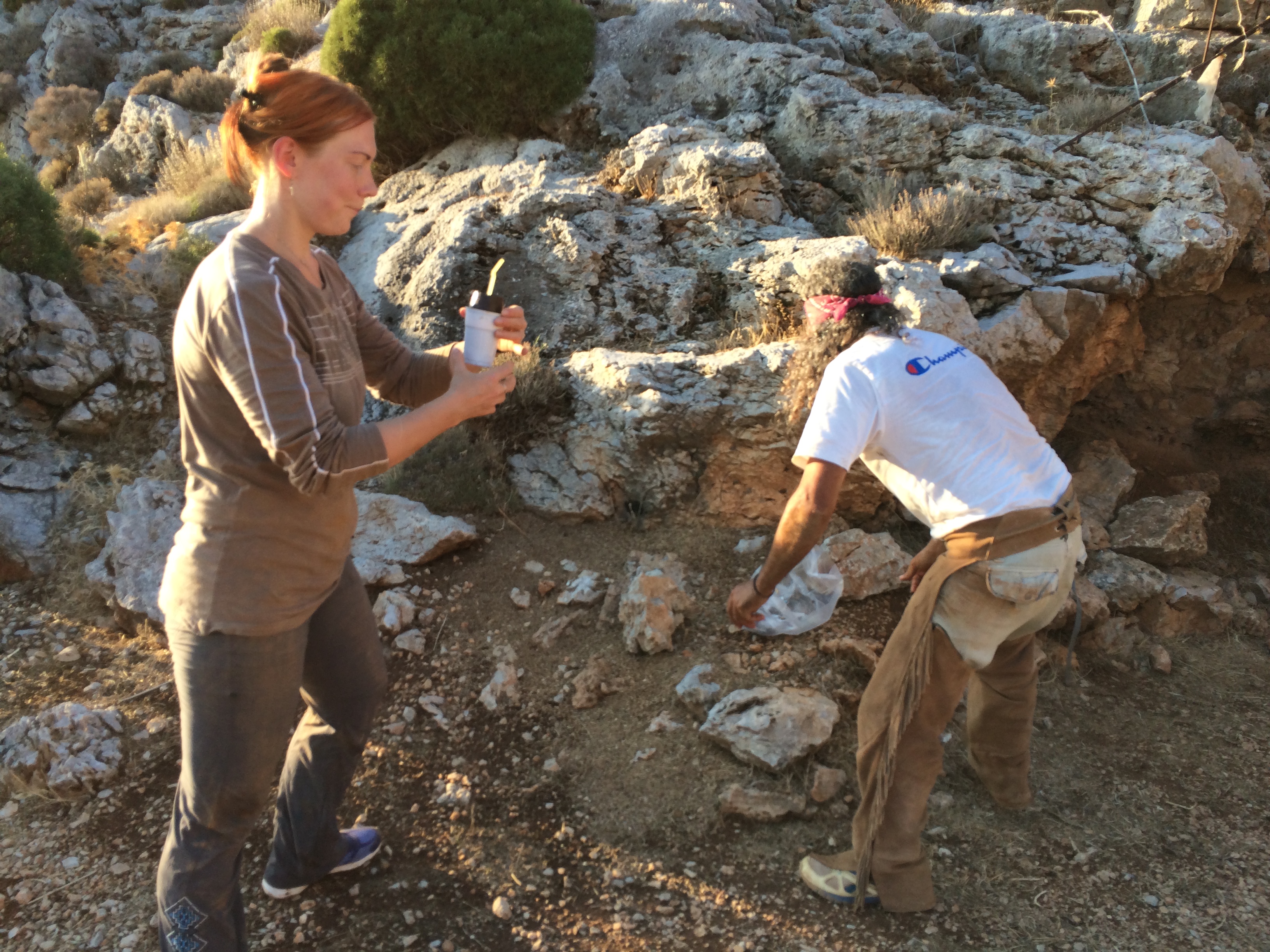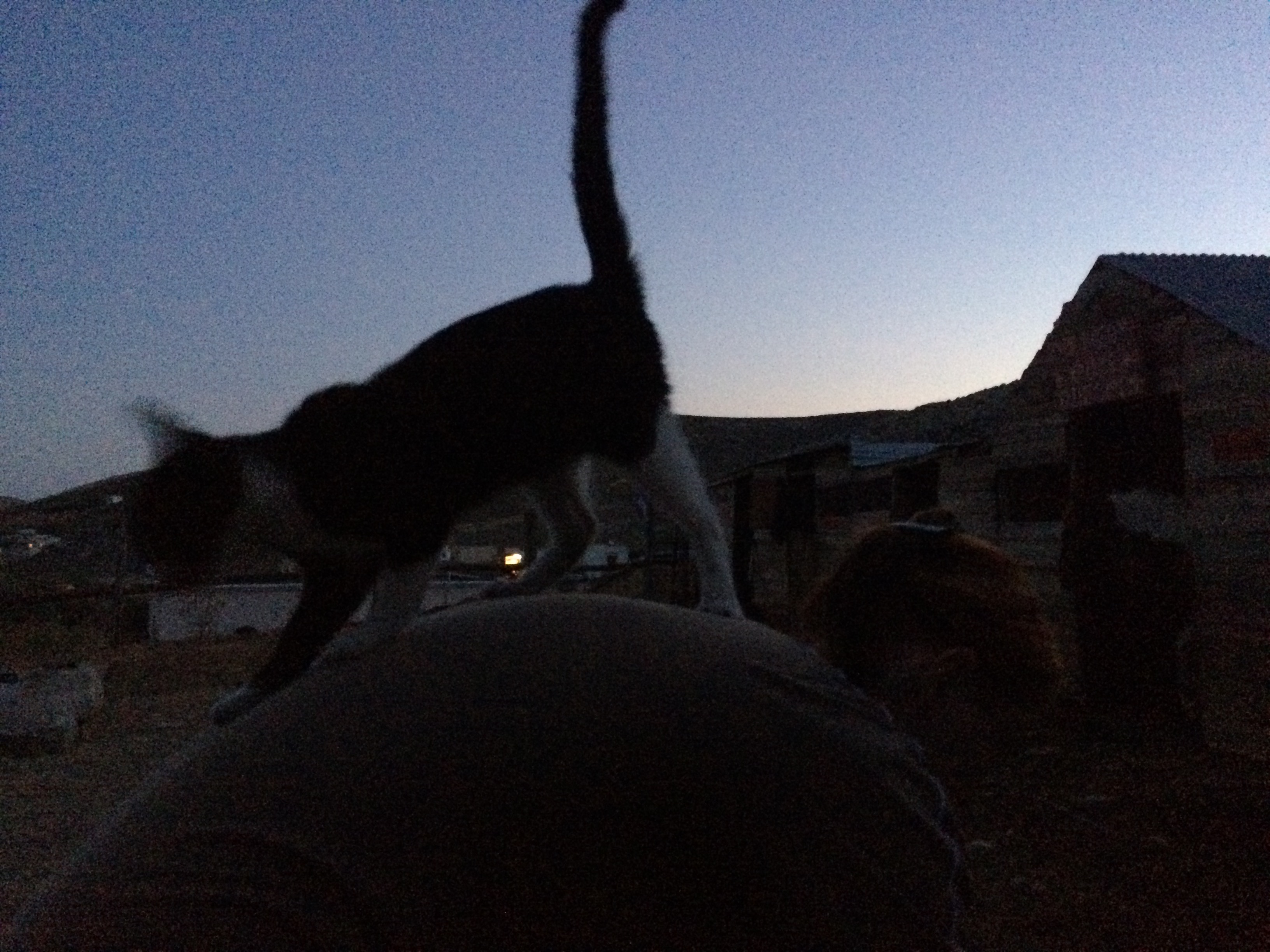 Pääsimme siis onnellisesti takaisin hevostilalle, jossa vielä saimme auttaa isäntää tallitöissä. Kaikki tekivät mitä parhaiten osasivat. Minä istuin hevosaitauksen penkillä ja silittelin 10 viikkoista koiran pentua, joka oli juuri muuttanut asumaan emon luota hevosten seuralaiseksi. Hänestä oli tarkoitus koulia jänis- ja lintukoira. Kalymnoksella metsästetään vielä systeemillä mies, koira, hevonen ja ase, vähän eri juttu kuin etelä-suomalainen ”armeijametsästys”… No mutta samalla kun minä lievitin pennun eroahdistusta, Päivi ja isäntämme ruokkivat hevoset.