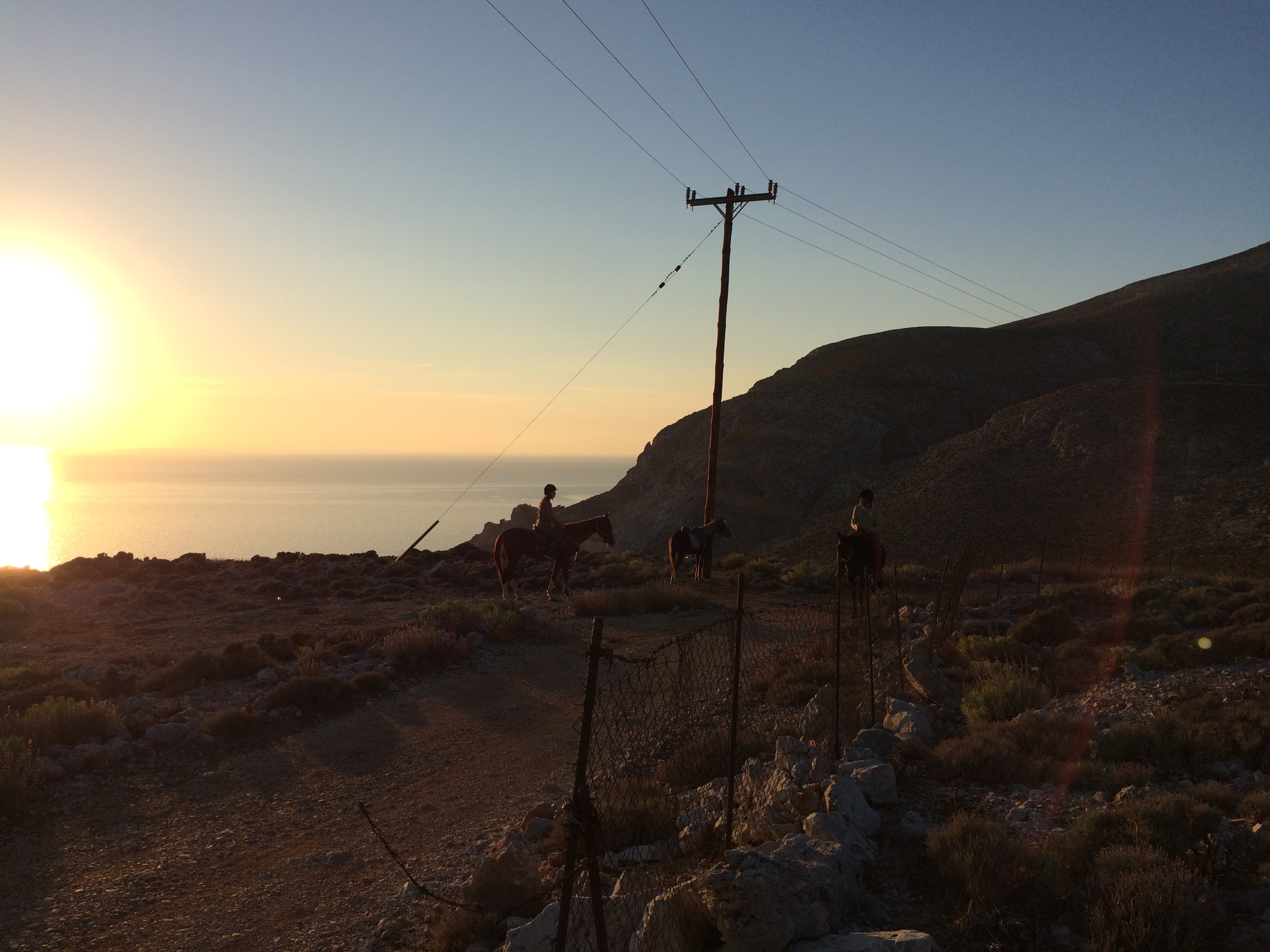 Pienen jutustelun ja muutaman valokuvan jälkeen lähdimme paluumatkalle. Nyt orikin oli jo ilmeisesti unohtanut, että minä olen vaarallinen eikä enää tuijottanut minua epäluuloisesti. Pienen matkan leppoisan tallustelun jälkeen pysähdyimme vielä ottamaan kuvia upealla paikalla jossa meri kimalteli alapuolella ja laskeva aurinko alkoi värjätä parin saaren koristamaa taivaarantaa. Siitä sitten jatkoimme leppoisaa tallustelua romanttisesti laskevan auringon valossa. Vaikka minun heppa vaikutti mukavan rauhalliselta ja oli kuulemma ostettu oppaamme tyttären hevoseksi, niin päätin kuitenkin pitää välit hyvinä ja jutella niitä näitä aina silloin kun pystyin, eli kun kävelimme leppoisasti. Kävin läpi ainakin Suomen ja Kalymnoksen luonnon ja ilmaston erot, ihmettelin rinteillä näkyvien aurinkopaneelien asettelua, juteltiin yleisesti energiapolitiikasta ja lauloin myös pätkän kappaletta ”Olen suomalainen”. En tiedä auttoiko, mutta tamman korvat pyörivät siihen malliin, että ainakin se kuunteli. No ei leppoisa kävely toki loppumatkaa kestänyt. Kun käännyimme pois auringonlaskun koristamasta rannasta, niin ei kun taas ravaamaan. Pieni asutumpi pätkä sentään käveltiin, mutta lopulta päädyttiin vielä laukkaamaan, huh! Mutta enpä tälläkään kertaa pudonnut selästä ja itse asiassa se tunne kun hevonen lähtee laukkaamaan on aika upea…