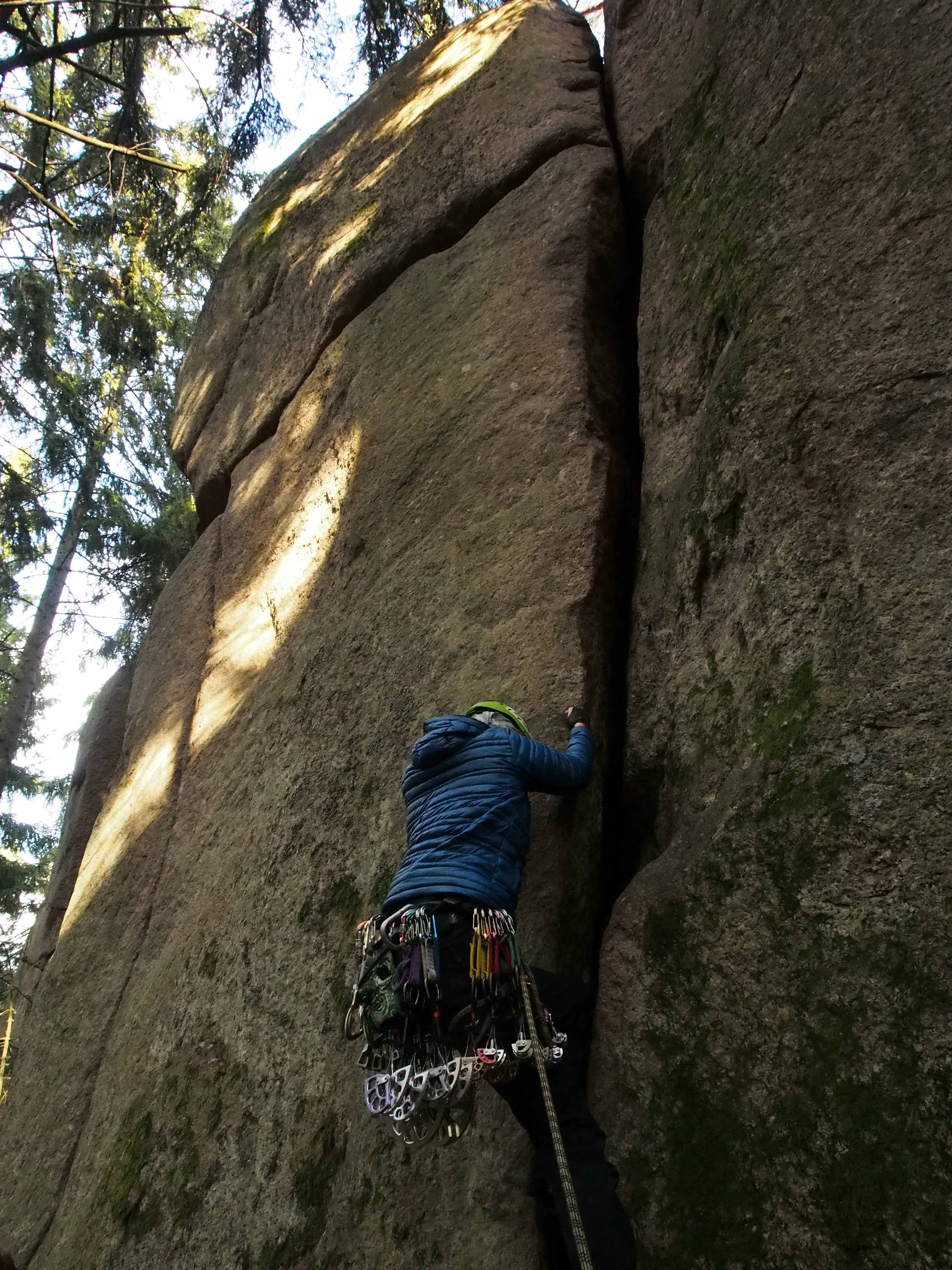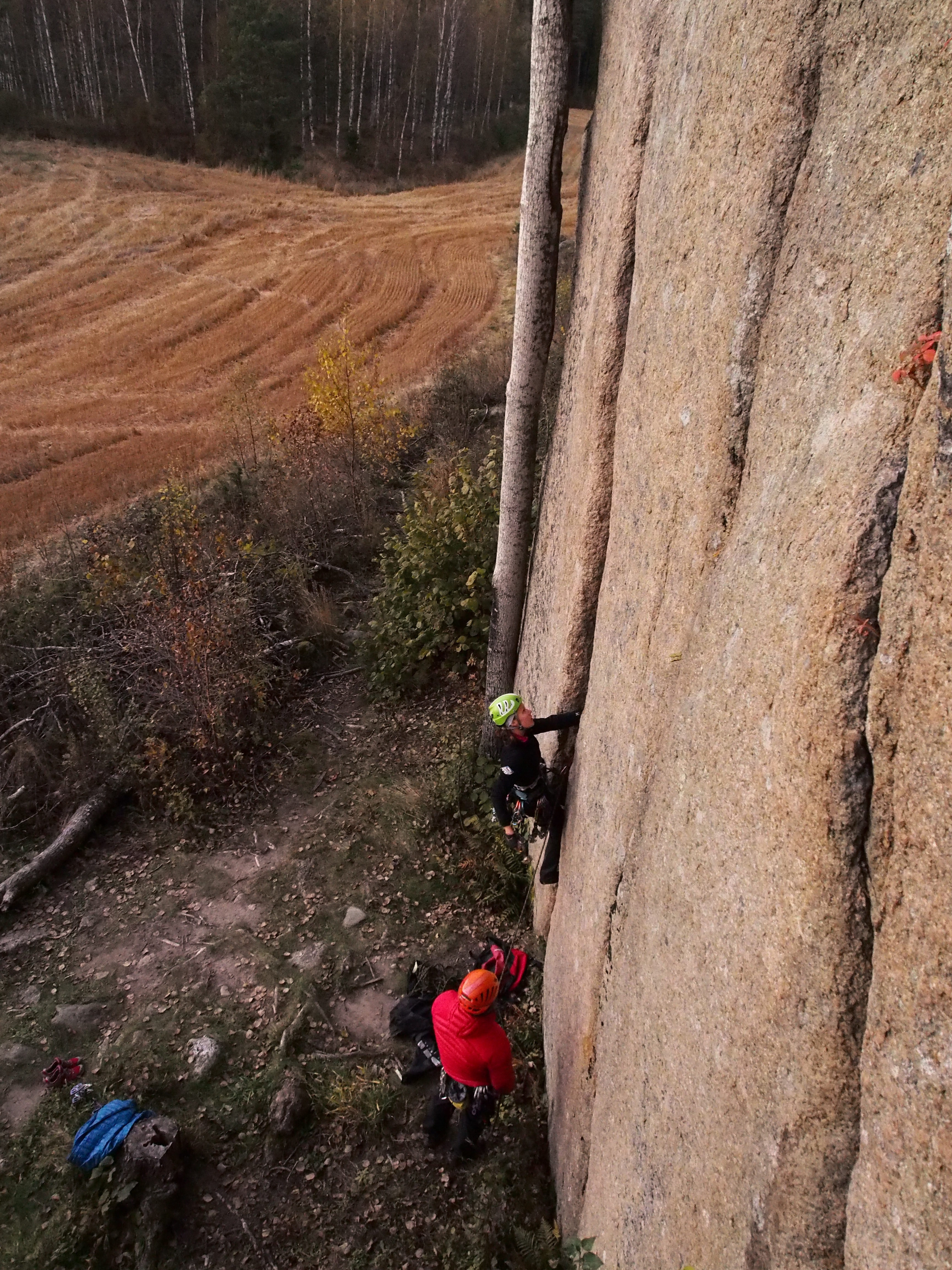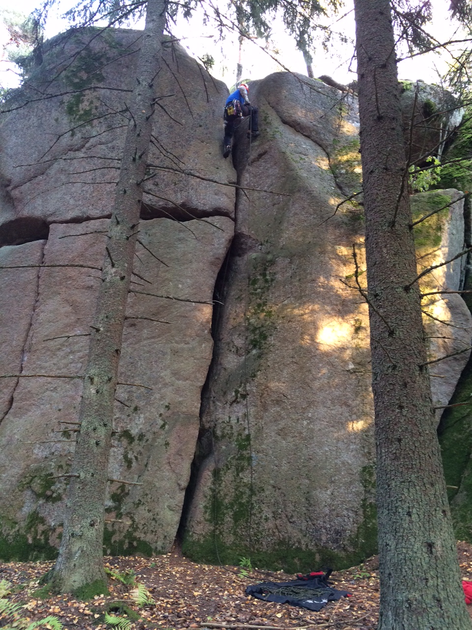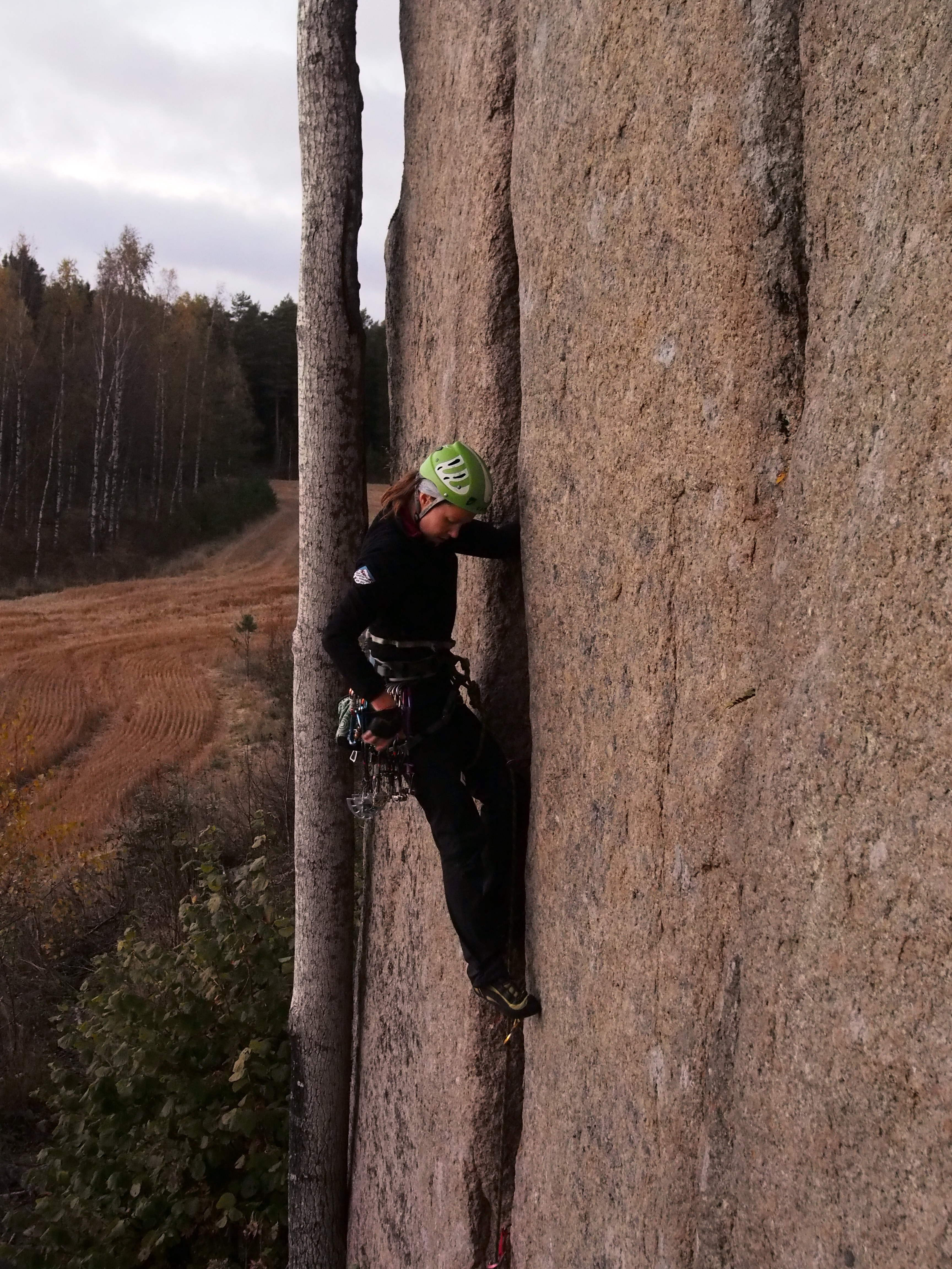 Minulla oli kunnia olla on ensimmäisessä liidivuorossa ja seuraavaksi reitiksi valitsin vähän helpompaa, tai niin ainakin oli tarkoitus. Markiisi (5-) vaan olikin hieman juonikkaampi reitti, ja alku kaikkein vaikein. Kustavin greidit tuntuvat aina ekana päivänä kovilta, kun ei halkeamakiipeilyä paljon muualla tule harrastettua. Hämärä alkoi jo laskeutumaan, kun päätettiin vielä antaa yritys Sähköpaimenelle. Pieni kosteus alkoi jo hiipiä kallion pintaan, ja yhden putoamisen jälkeen luovuin liidiyrkästä. Mikko kyllä pääsi melkein ykkösellä ylös, mutta alun jyrkkyys yhdistettynä kallion kosteuteen teki tepposet ja projektiksi jäi. Saatiin kuitenkin hyvin otettua tuntumaa, ja kun vielä viime tipassa varattu majoitus Hakkenpäässä Kleemolan vanhassa maatalossa osoittautui oikein viihtyisäksi oli Kustavin viikonlopun vietto todella onnistuneesti aloitettu.