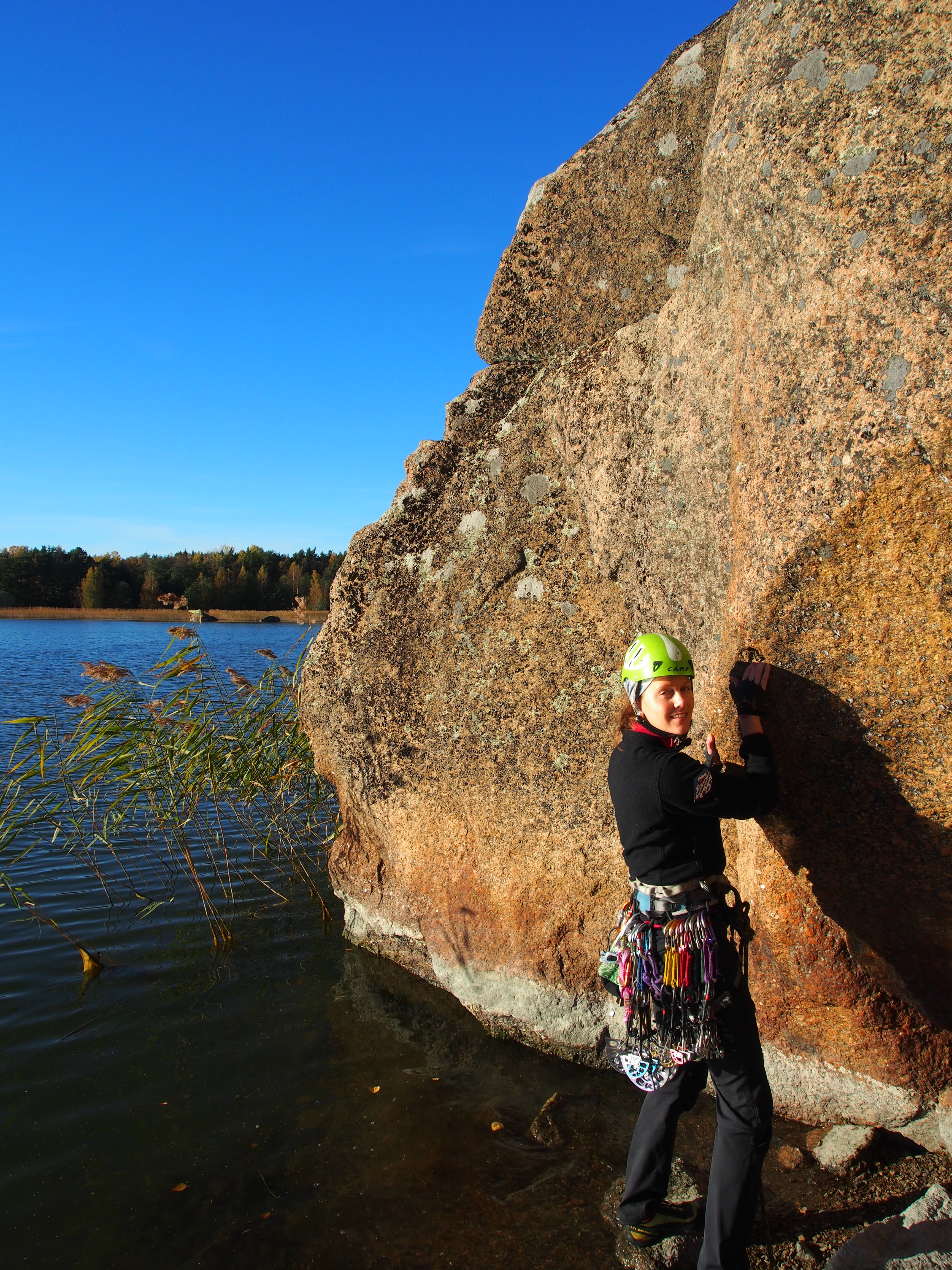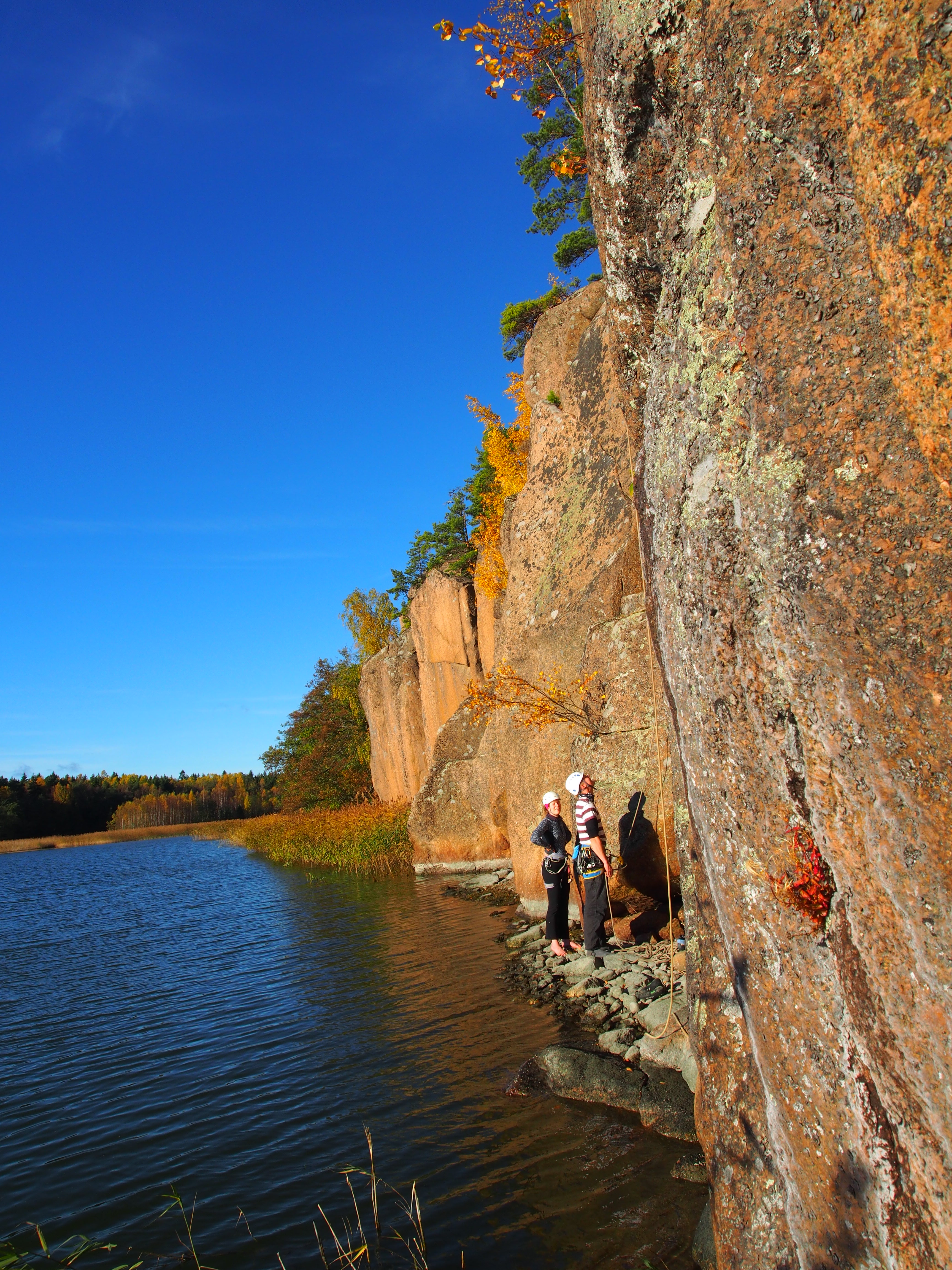 Syksyn kiipeilyt kruunasi pitkän viikonlopun reissu Kustaviin. Lähdettiin matkaan jo torstaina heti kun töistä mitenkään pääsin irtautumaan, ja apukuskikin sai viimeisteltyä toimistohommat tien päällä ennen Saloa. Saloon saavuttua vaihdettiin vapaalle ja aloitettiin syyslomaan oleellisesti kuuluva hyvän ruoan syöminen, ensin Mikon äidin ja sitten veljen Juhan luona. Perjantaina jatkettiin ajoa kohti Kustavia, ja käytiin matkalla Raisiossa hoitamassa ruokaostokset. Prisman loputtomilla käytävillä seilaaminen söi hieman aikaa, mutta ehdittiin silti hyvin aloittaa kiipeilyt vielä valoisaan aikaan. Ensimmäinen kohde, Hyyppivuori Taivassalossa tosin oli vesiperä, halkeamista suurin osa oli niin sammalen peitossa ettei uskallettu niillä aloitella jammitreenejä.