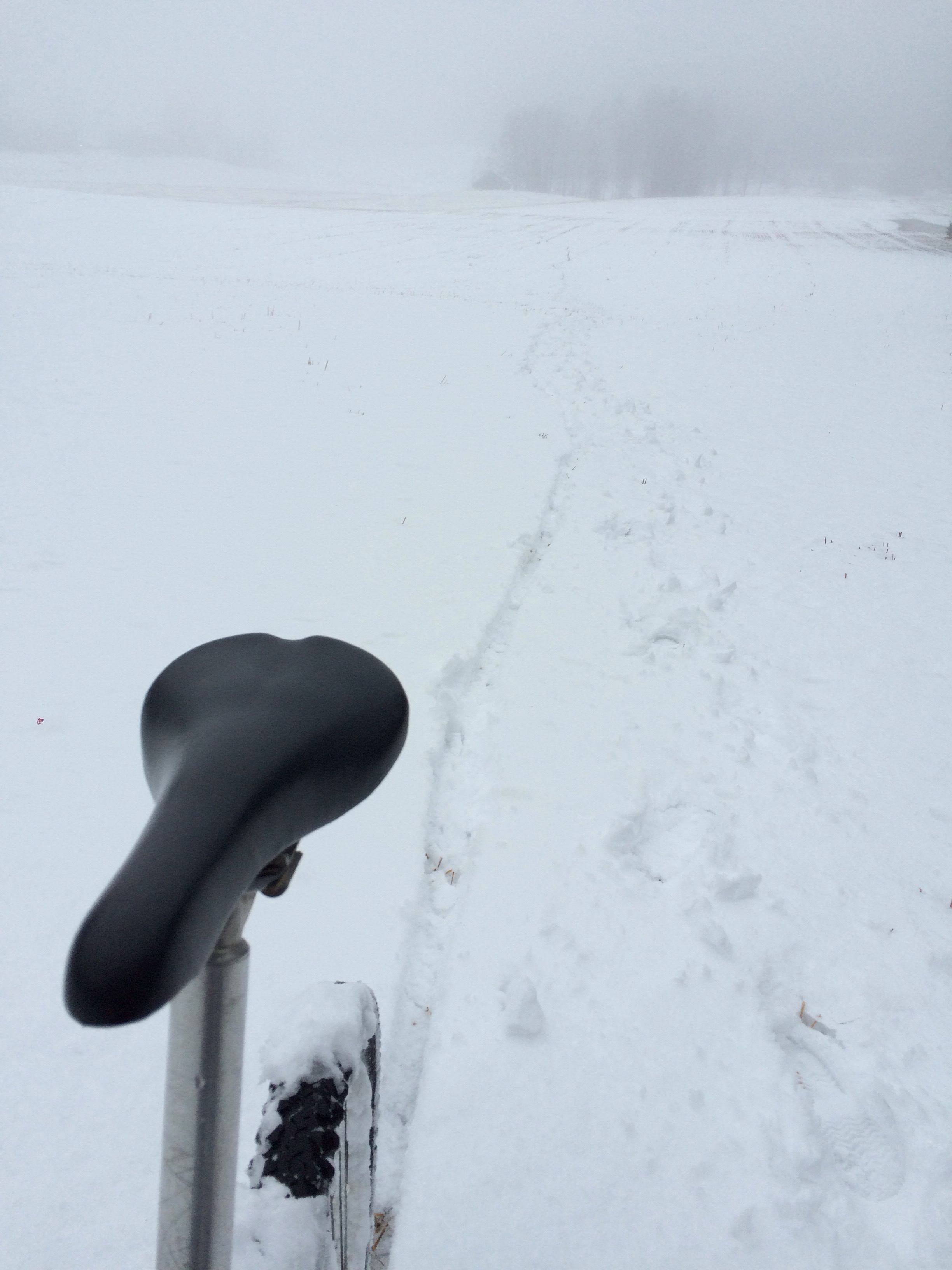 Lähdin pihasta suoraan metsässä kulkevalle pienelle tieuralle loivaan ylämäkeen. Suojaisasaan paikkaan oli kertynyt reiluhkosti lunta, ehkä 15 senttiä, ja lämmenneen kelin takia lumi alkoi olla pehmeää sohjoa. Homma meinasi tökätä heti alkuunsa. Totesin, että eteneminen on pirun raskasta. No kitkuttelin kuitenkin mäen ylös ja pääsin loivaan alamäkeen, homma helpottui heti. Vielä kun pääsin polulta pellolle niin jo alkoi luistaa! Pehmeää hieman sohjoista lunta oli paikasta riippuen 0-15 senttiä, pohjalla jäinen pelto. Uskomattoman hauskaa! Toki raskasta, ei mitään peruskestävyystreeniä, mutta loivasti kumpuilevia peltoja oli hauska ”päästellä”. Alamäissä sai hieman huilata eikä tarvinnut edes pelätä kaatumista. Noin tunnin polkemisen jälkeen olin jo melko puhki. Tehokasta ja hauskaa!