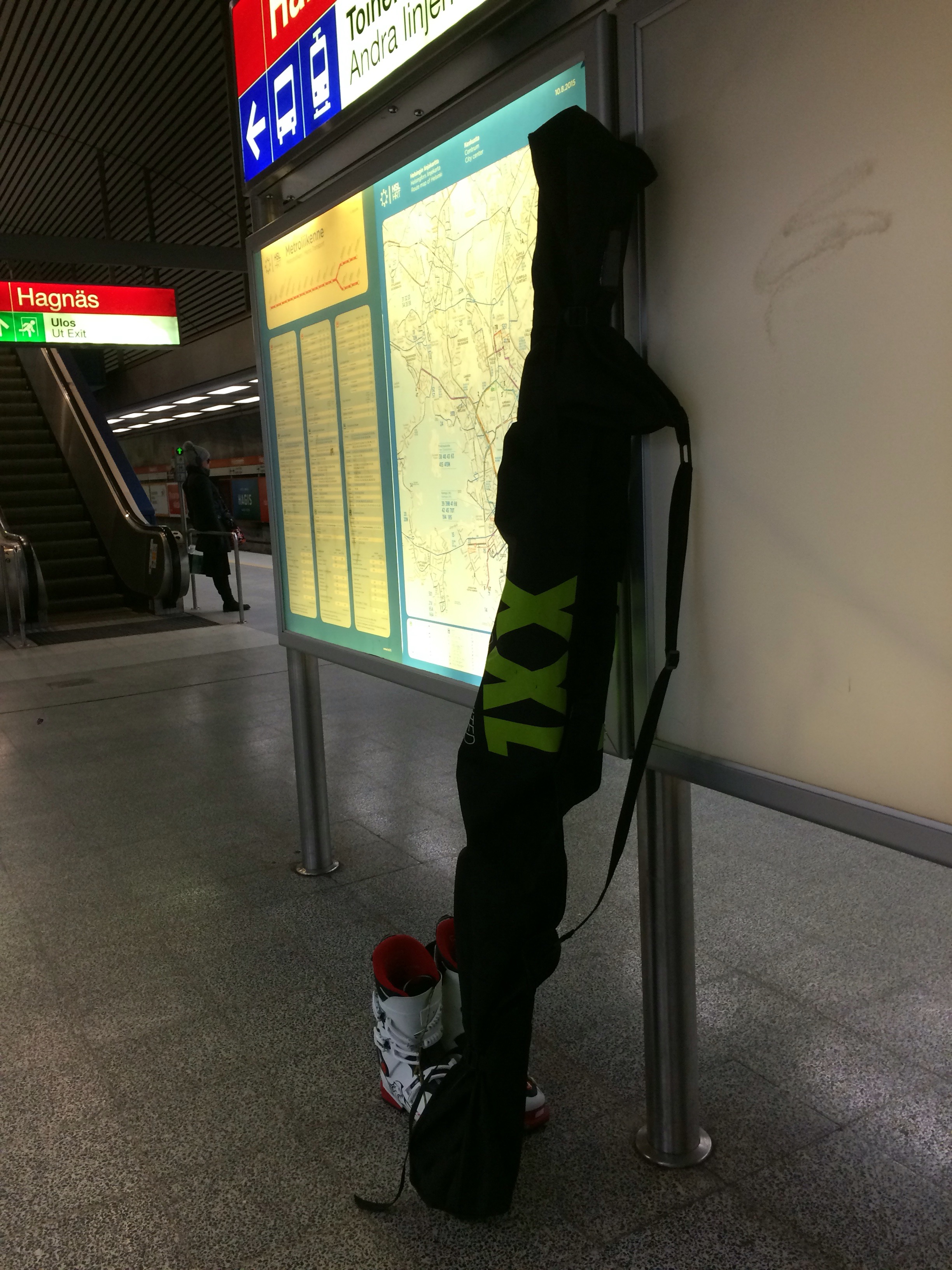 Niinpä heitin repun selkään, sukset ja monot olalle ja lähdin tallustelemaan kohti Hakaniemen metroasemaa. Heti tuli todettua ensimmäinen virhe, ulkona oli yllättävän lämmin, untuvatakkia ei olisi pitänyt laittaa päälle…