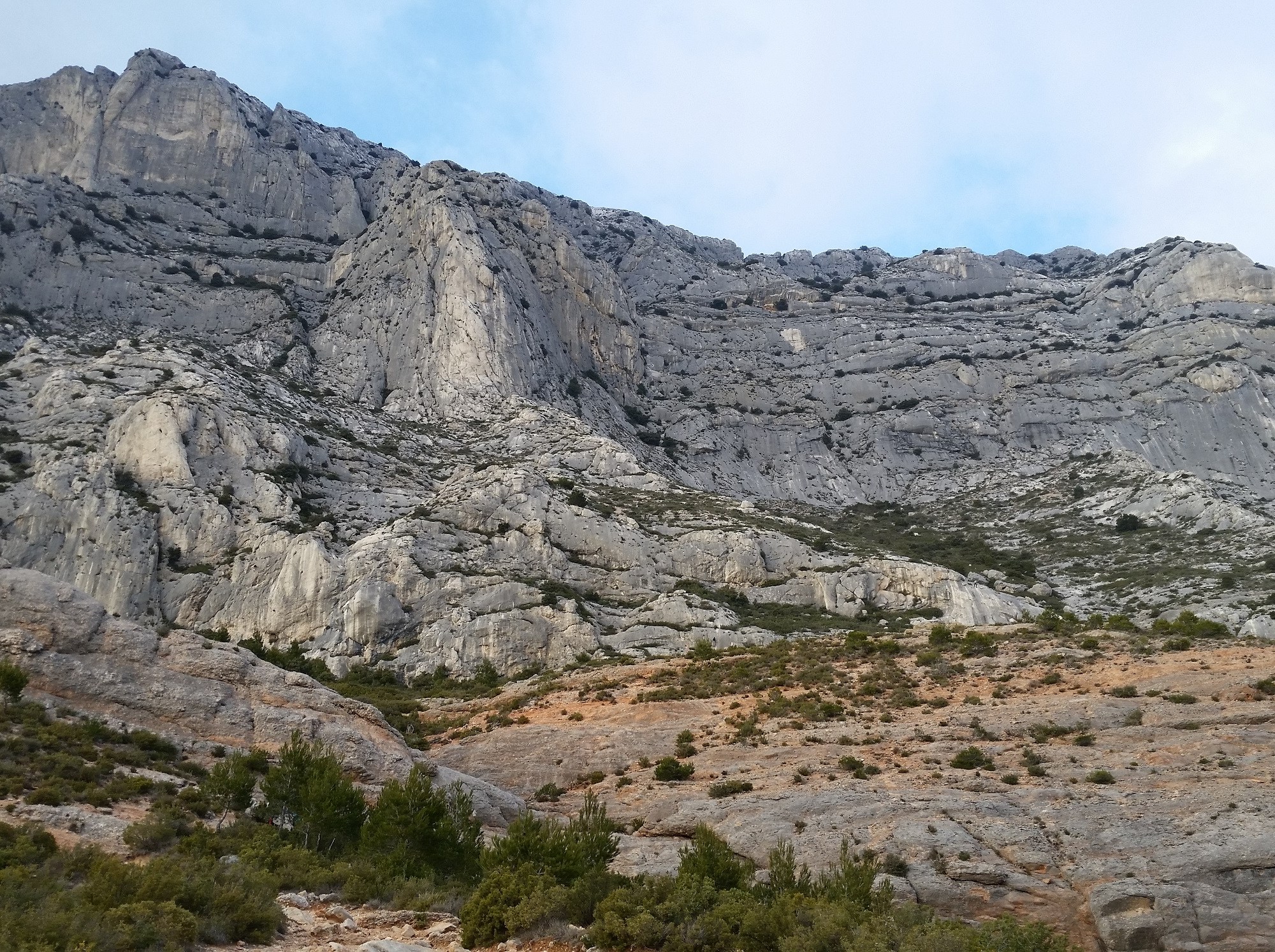 Sainte Victoiren Le Grand Parcours on tällainen reitti. Sainte Victoire on Etelä-Provancen maamerkki ja moniin tauluihin maalattu Cezannen vuori. Varsinkin eteläseinämä on puhutellut ihmisiä vuosituhansia ja Le Grand Parcours nousee sen ilmeisimmästä kohtaa. Suoraan huipulle ja jyrkintä ulkokulmaa. Ensinousu on tehty 1967 ja reitti on edelleen suosittu. Nytkin meidän kanssa kiipesi kaksi muuta paria. 400m kalkkikivi trädireittinä se vaatii vähän enemmän kuin muut alaseinän pultatut monen köyden reitit ja kiipeämistä löytyy niin släbillä, harjanteella ja halkeamassa. Vaikeustaso on kävelystä jyrkkään kahvakkaaseen 5+ halkeamalinjaan.