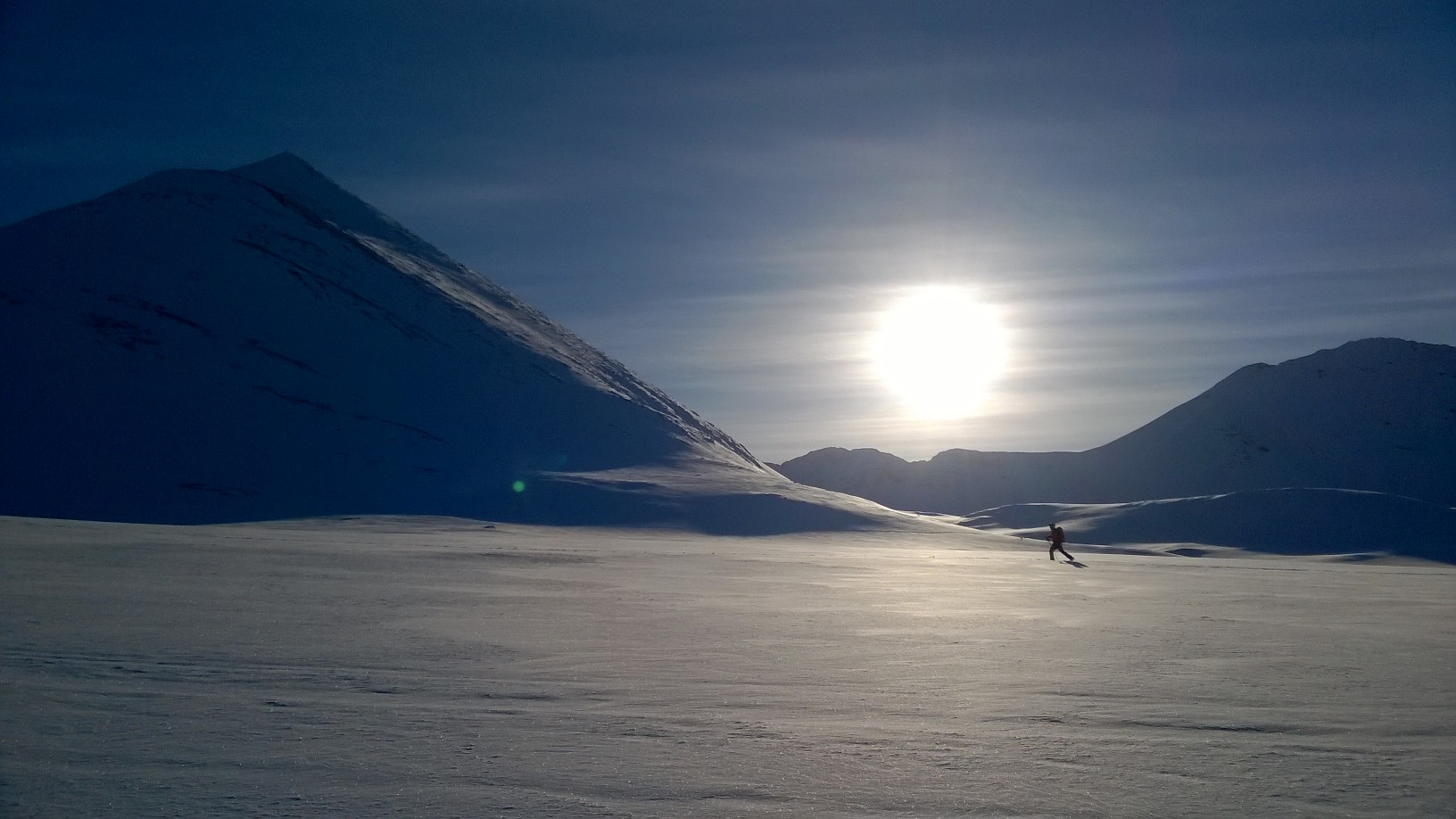 Ensimmäiseksi kahdeksi yöksi skinnattiin n. 5 km:n matka leireilemään Jägervatnetin itäpuolelle lähemmäksi puurajaa. Ensimmäisenä päivänä skinnattiin Trollbreenin jäätikölle. Toinen päivä avautuikin lumisateisena, jolloin teimme lyhyemmän skinnailun lähimäkeen leiristä ja siirryimme illaksi sisätiloihin.