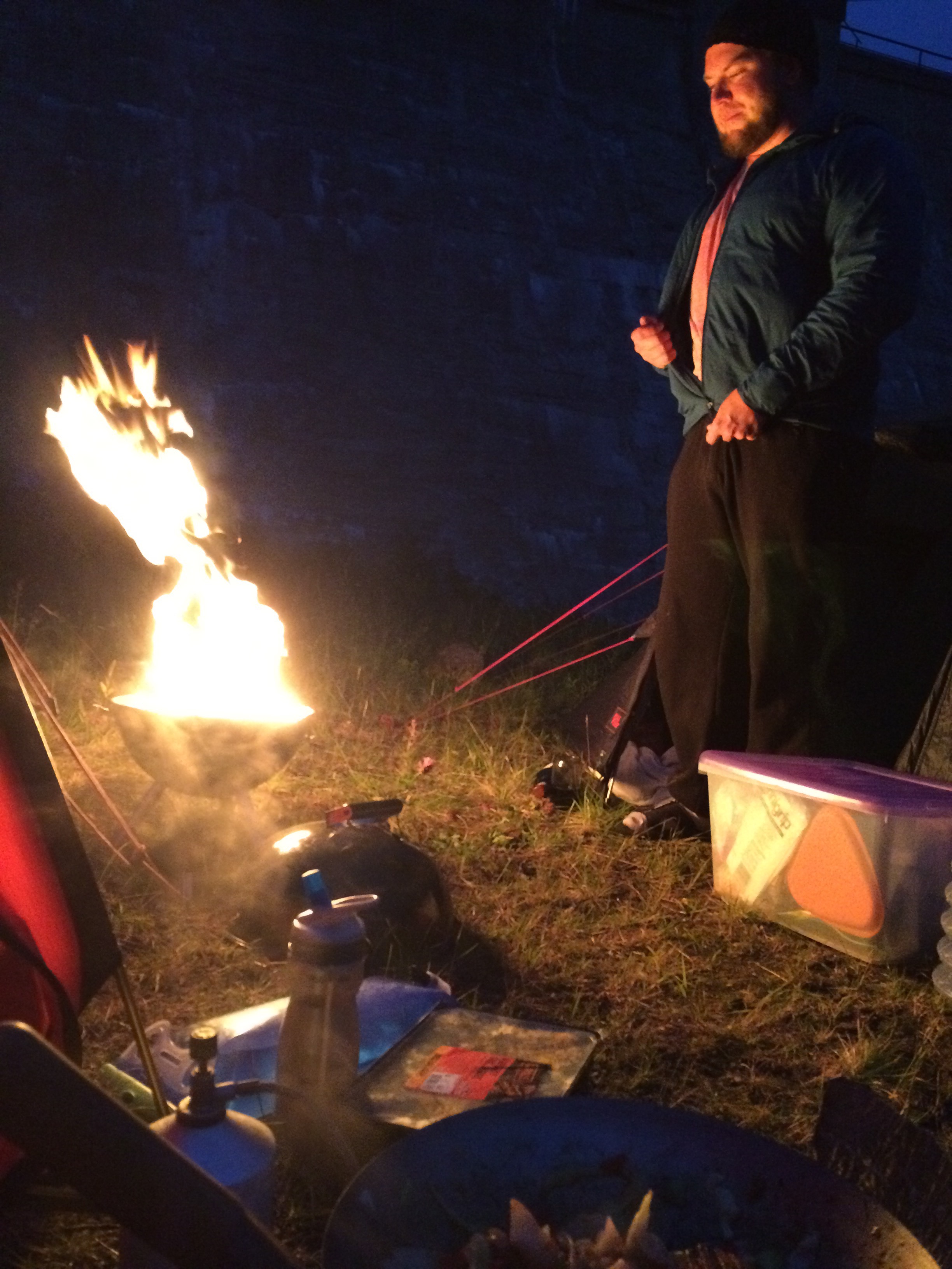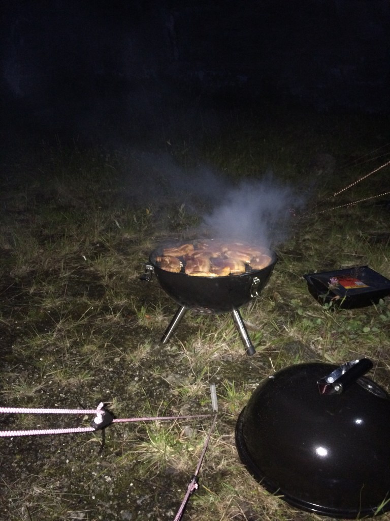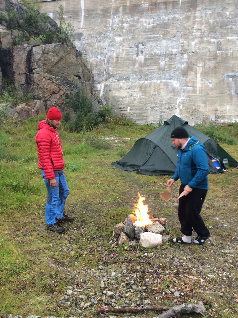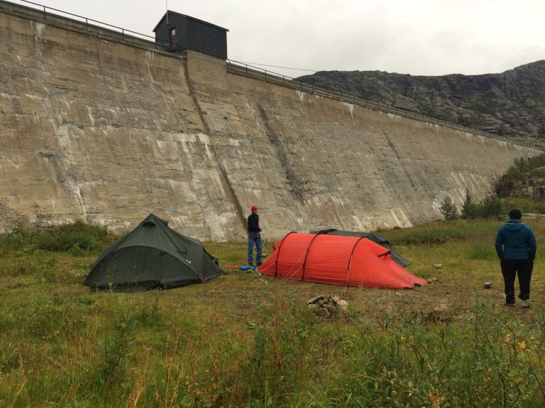 …jossa Lofoottien idyllin sijaan meidät vastaanotti DDR-henkinen padon seinä ja kylmä tihkusade. Noh, ei auttanu kuinka laittaa teltat pystyyn ja kaasukeitin sekä grilli kuumaksi. Tällä kertaa ei ihan kaikkea jaksettu, mutta hyvä vaan niin Mikolle ja Jukalle oli ruuat valmiina kun he viimein saapuivat meidän DDR:ään.