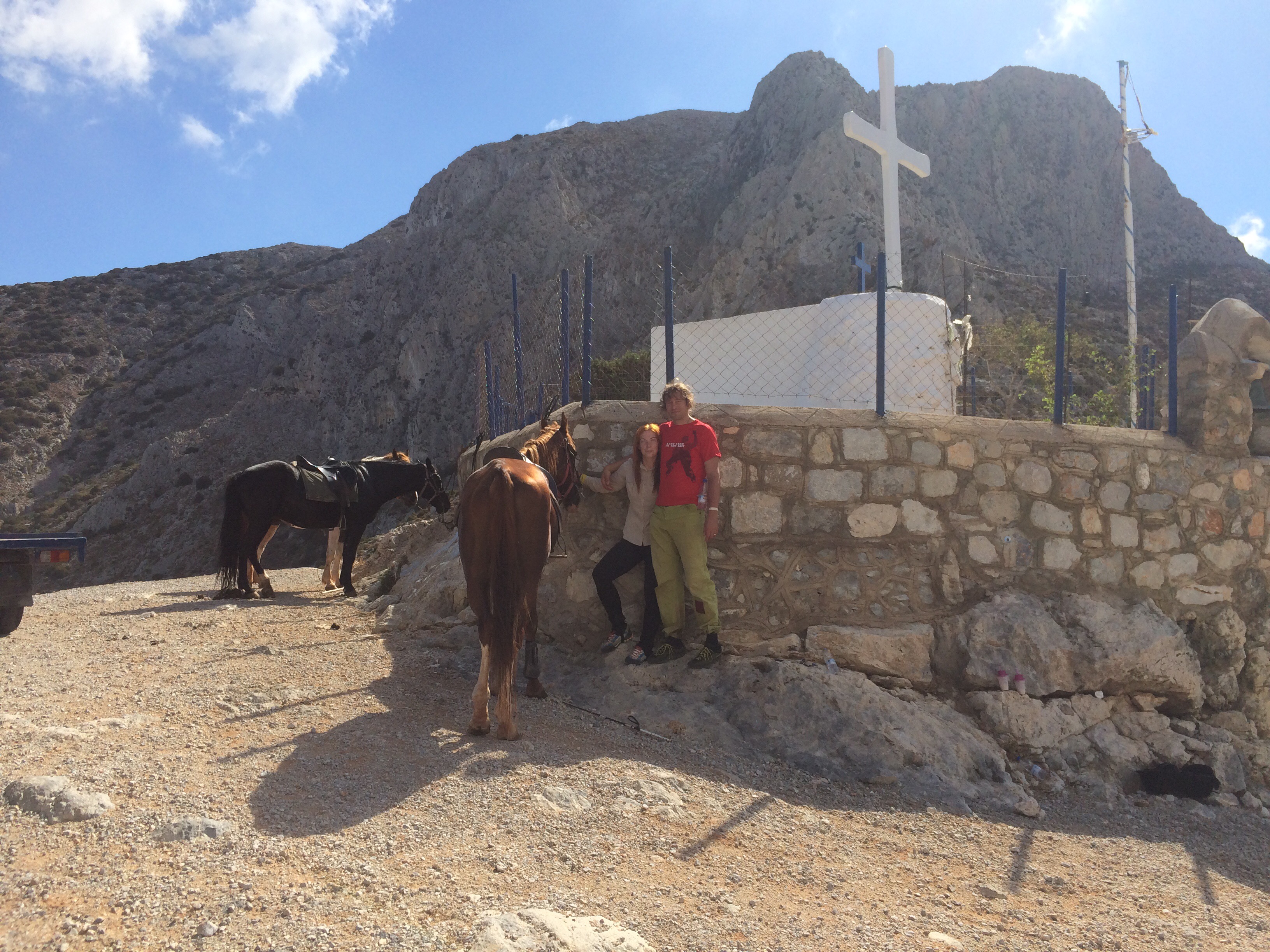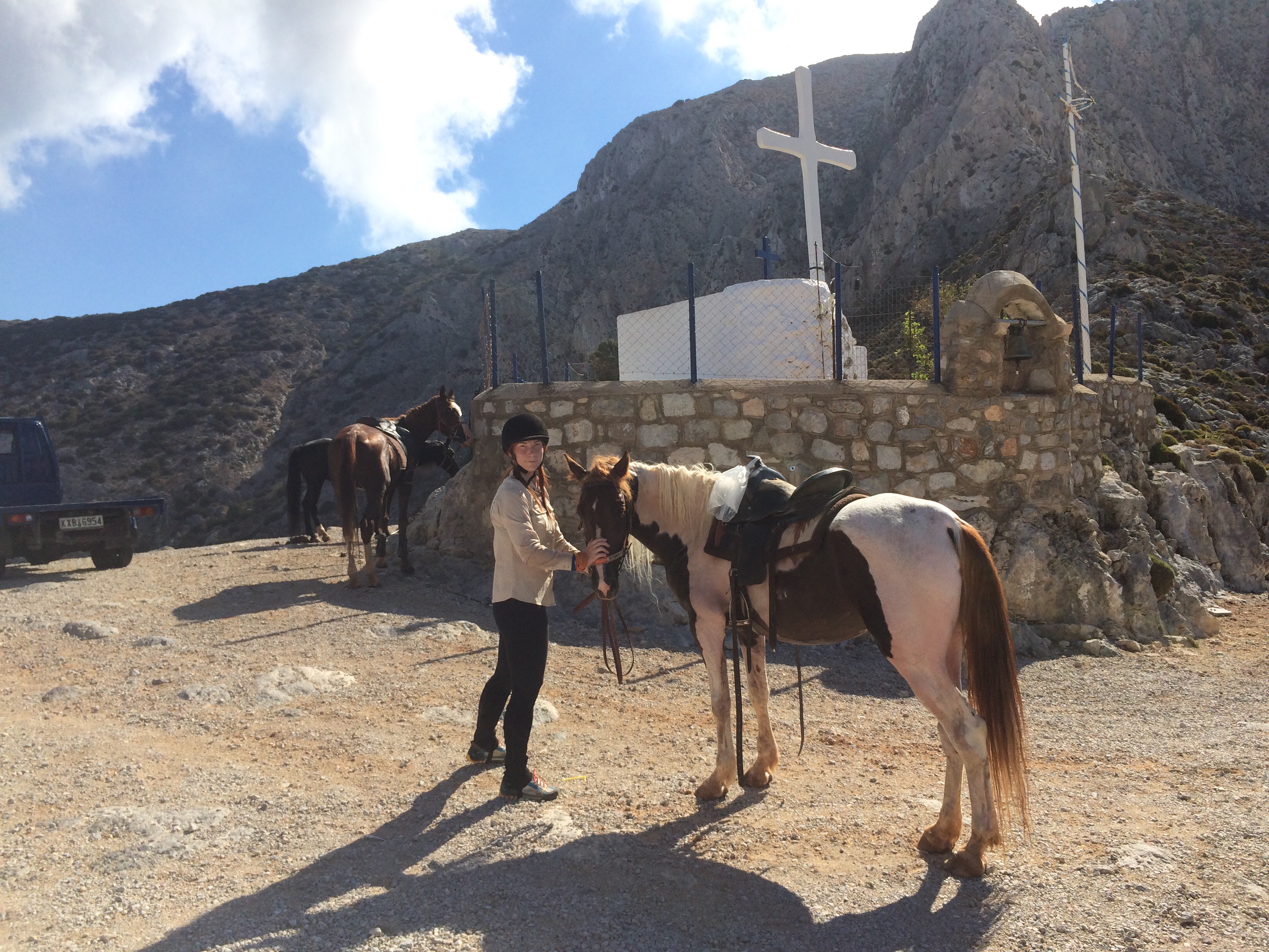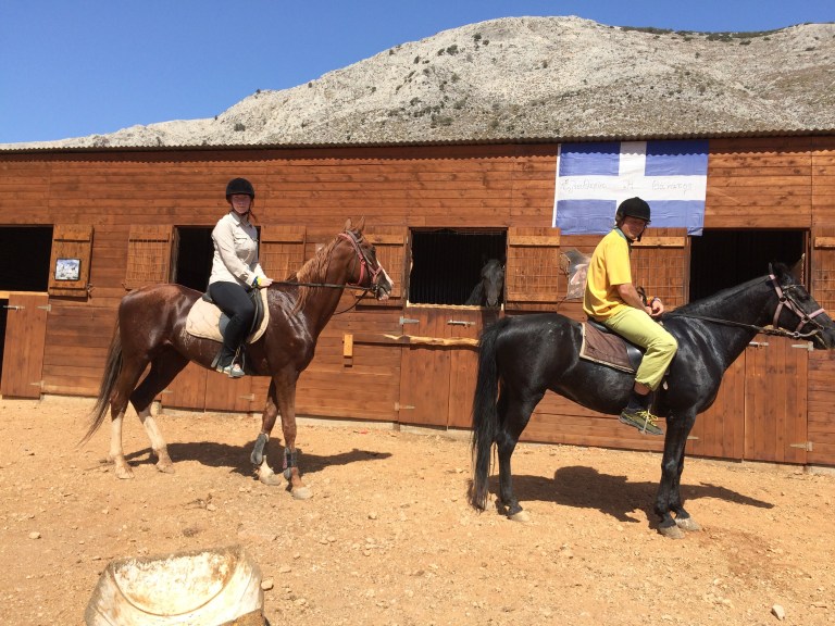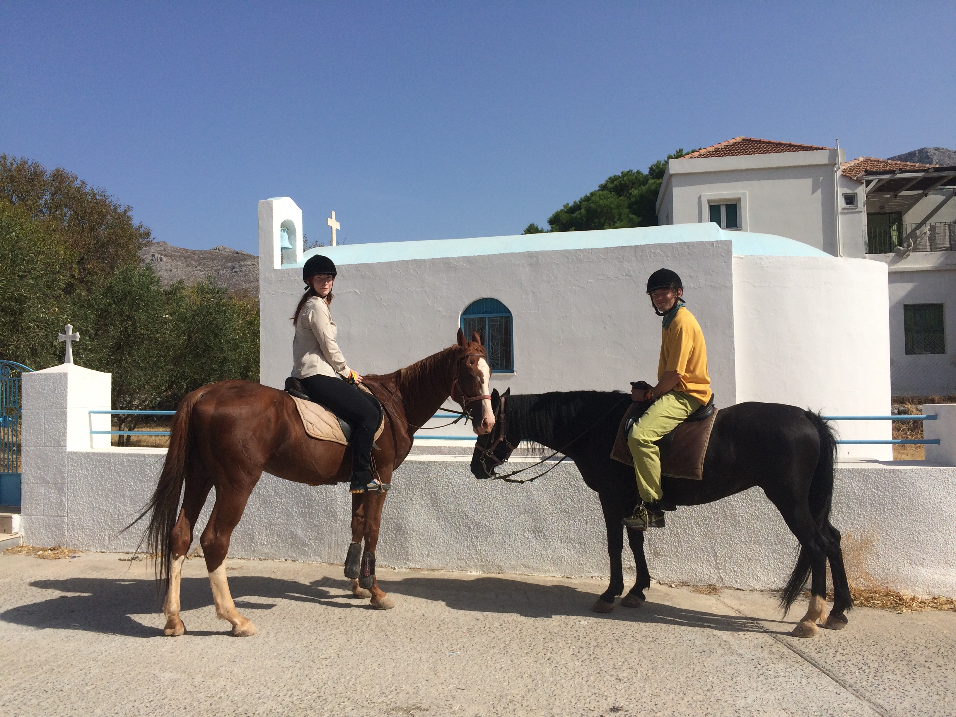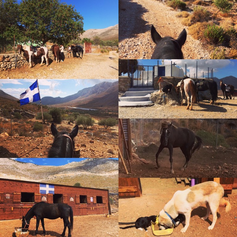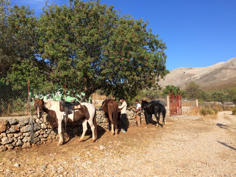 Kiipeilyn lisäksi Kalymnoksella voi siis harrastaa vaikkapa sukeltamista, melontaa, patikointia tai ratsastusta. Me keskityimme kiipeilyn ohessa ratsastukseen ja tässä muutama sana Kalymnoksen ratsastusmahdollisuuksista. Kalymnos Adventure Center, vastapäätä Fatolitiksen kiipeilykahvilaa, välittää 2-3 tunnin ratsastusretkiä, joita testasimme jo viime vuonna. Ratsutilan isäntä Theo, intohimoinen hevos- ja intiaani-ihminen, oli meille siis tuttu jo edelliseltä vuodelta. Vielä vuosi sitten Theon talli sijaitsi Pothian takana, mutta nyt hän oli muuttanut hevostensa kanssa Vathyn lähelle sitrushedelmistään tunnettuun laaksoon. Theon aiempi talli oli ehkä kodikkaampi, mutta tämä uusi on oli kuin suoraan Pieni talo preerialla -leffasta. Talli sijaitsee hieman Vathyn sitrusviljelmien yläpuolella karussa ja aurinkoisessa rinteessä. Hevosilla on uusi talli ja hyvät tilat. Hevosten seurana asustelee pari koiraa ja suuri lauma kissoja. Pitävät kuulemma haittaeläimet loitolla. Tallin ympäristössä on mukavia ratsastusreittejä pääosin hiekkapohjaisia pikkuteitä. Reitit sopivat kaikille niille jotka pysyvät hevosen selässä. Myös täysin aloittelijat voivat mennä ratsastamaan. Hevoset ovat helppoja ja mukavia.