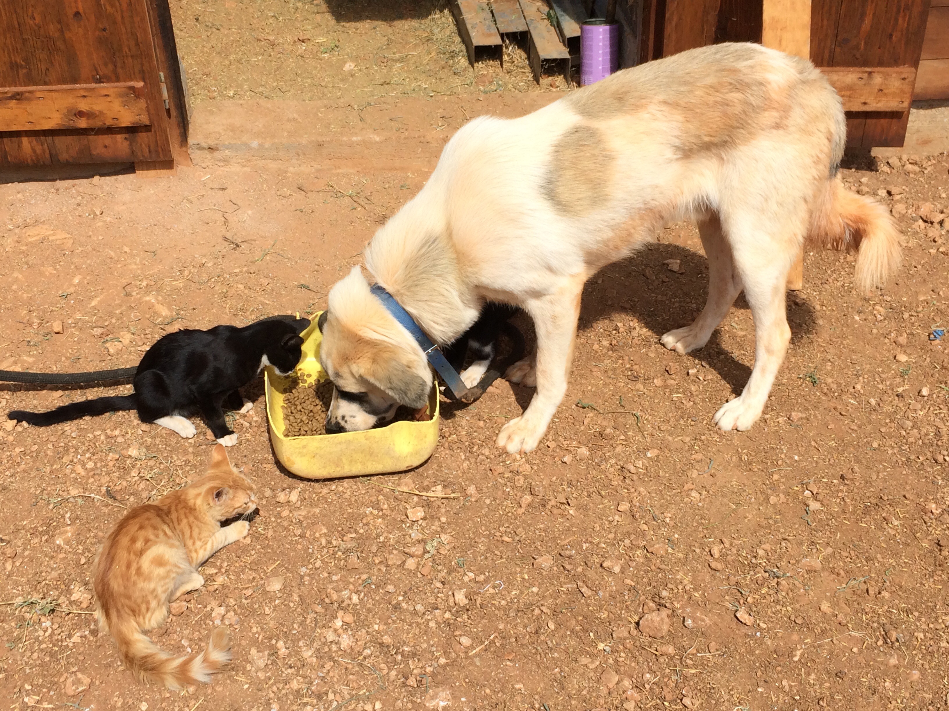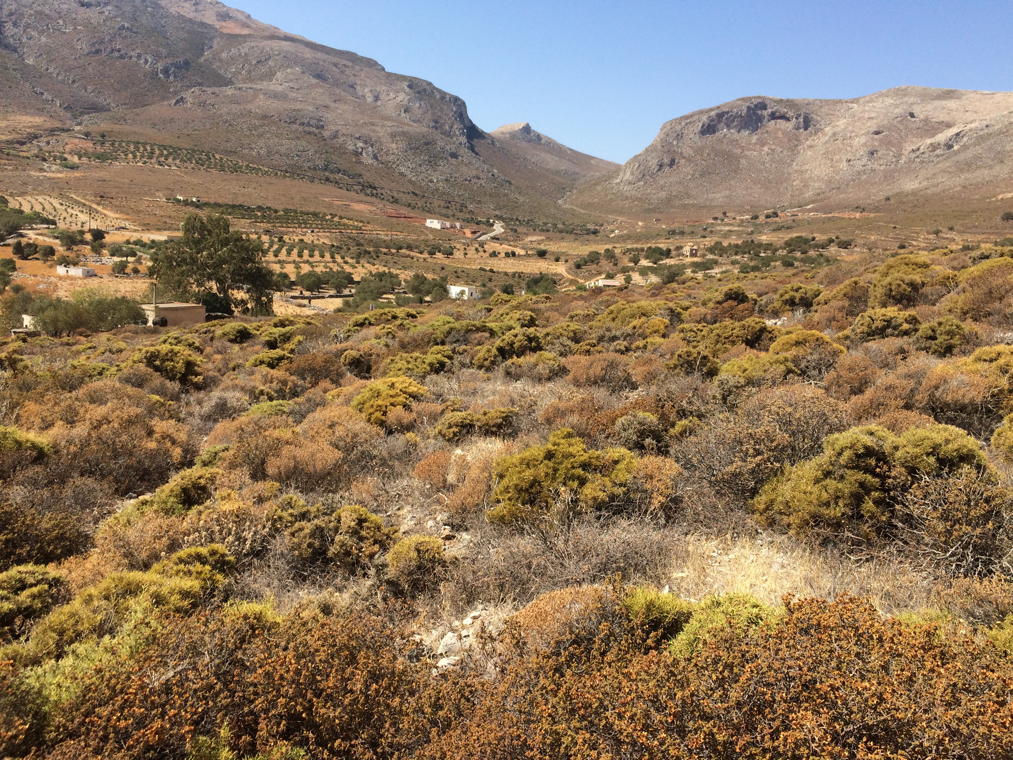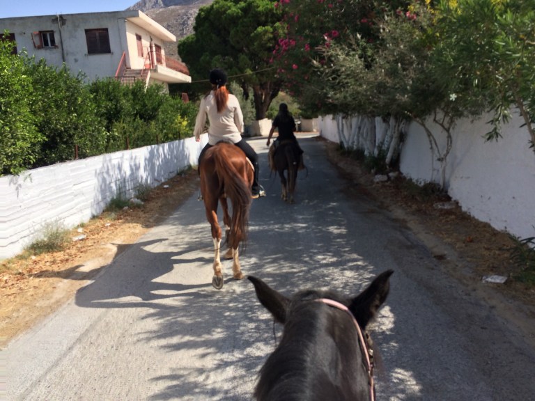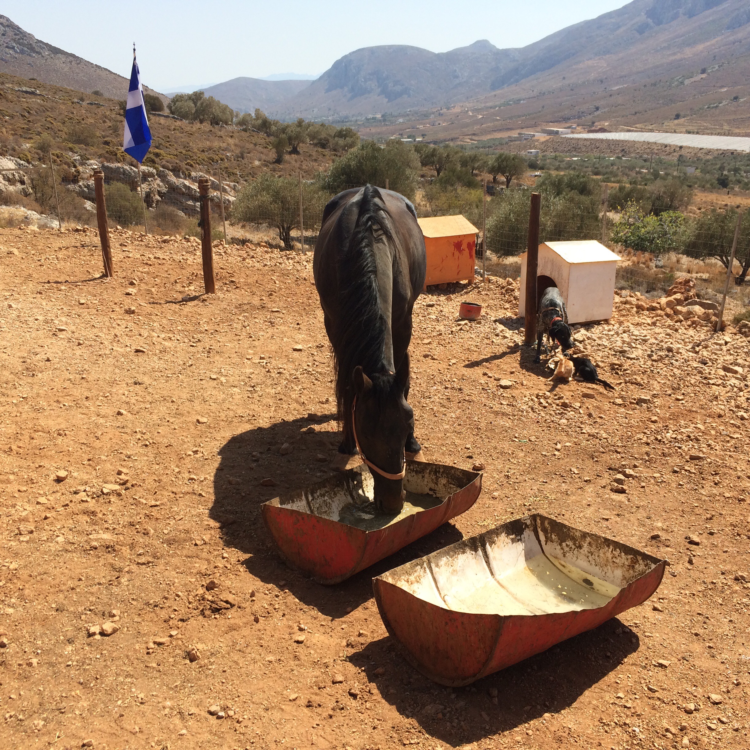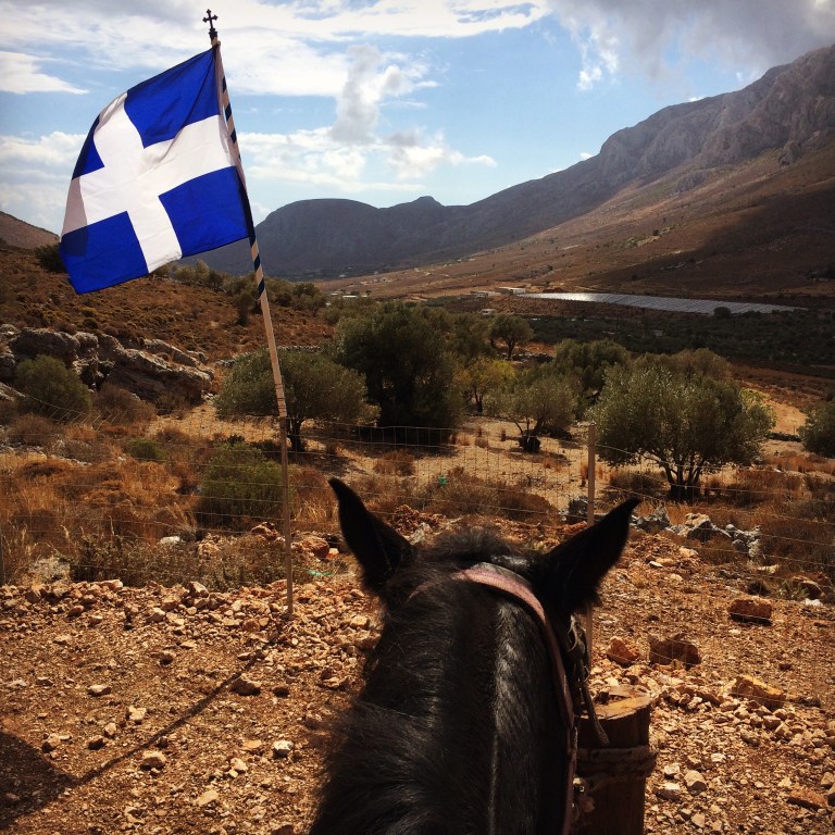 Kiipeilyn lisäksi Kalymnoksella voi siis harrastaa vaikkapa sukeltamista, melontaa, patikointia tai ratsastusta. Me keskityimme kiipeilyn ohessa ratsastukseen ja tässä muutama sana Kalymnoksen ratsastusmahdollisuuksista. Kalymnos Adventure Center, vastapäätä Fatolitiksen kiipeilykahvilaa, välittää 2-3 tunnin ratsastusretkiä, joita testasimme jo viime vuonna. Ratsutilan isäntä Theo, intohimoinen hevos- ja intiaani-ihminen, oli meille siis tuttu jo edelliseltä vuodelta. Vielä vuosi sitten Theon talli sijaitsi Pothian takana, mutta nyt hän oli muuttanut hevostensa kanssa Vathyn lähelle sitrushedelmistään tunnettuun laaksoon. Theon aiempi talli oli ehkä kodikkaampi, mutta tämä uusi on oli kuin suoraan Pieni talo preerialla -leffasta. Talli sijaitsee hieman Vathyn sitrusviljelmien yläpuolella karussa ja aurinkoisessa rinteessä. Hevosilla on uusi talli ja hyvät tilat. Hevosten seurana asustelee pari koiraa ja suuri lauma kissoja. Pitävät kuulemma haittaeläimet loitolla. Tallin ympäristössä on mukavia ratsastusreittejä pääosin hiekkapohjaisia pikkuteitä. Reitit sopivat kaikille niille jotka pysyvät hevosen selässä. Myös täysin aloittelijat voivat mennä ratsastamaan. Hevoset ovat helppoja ja mukavia.