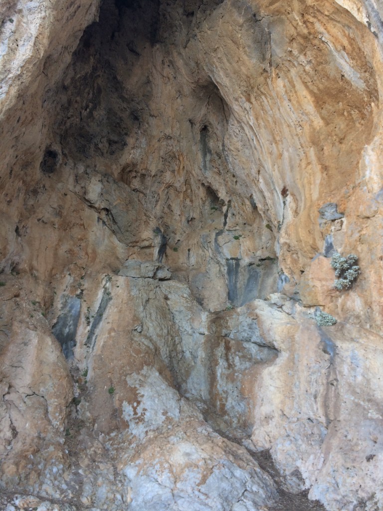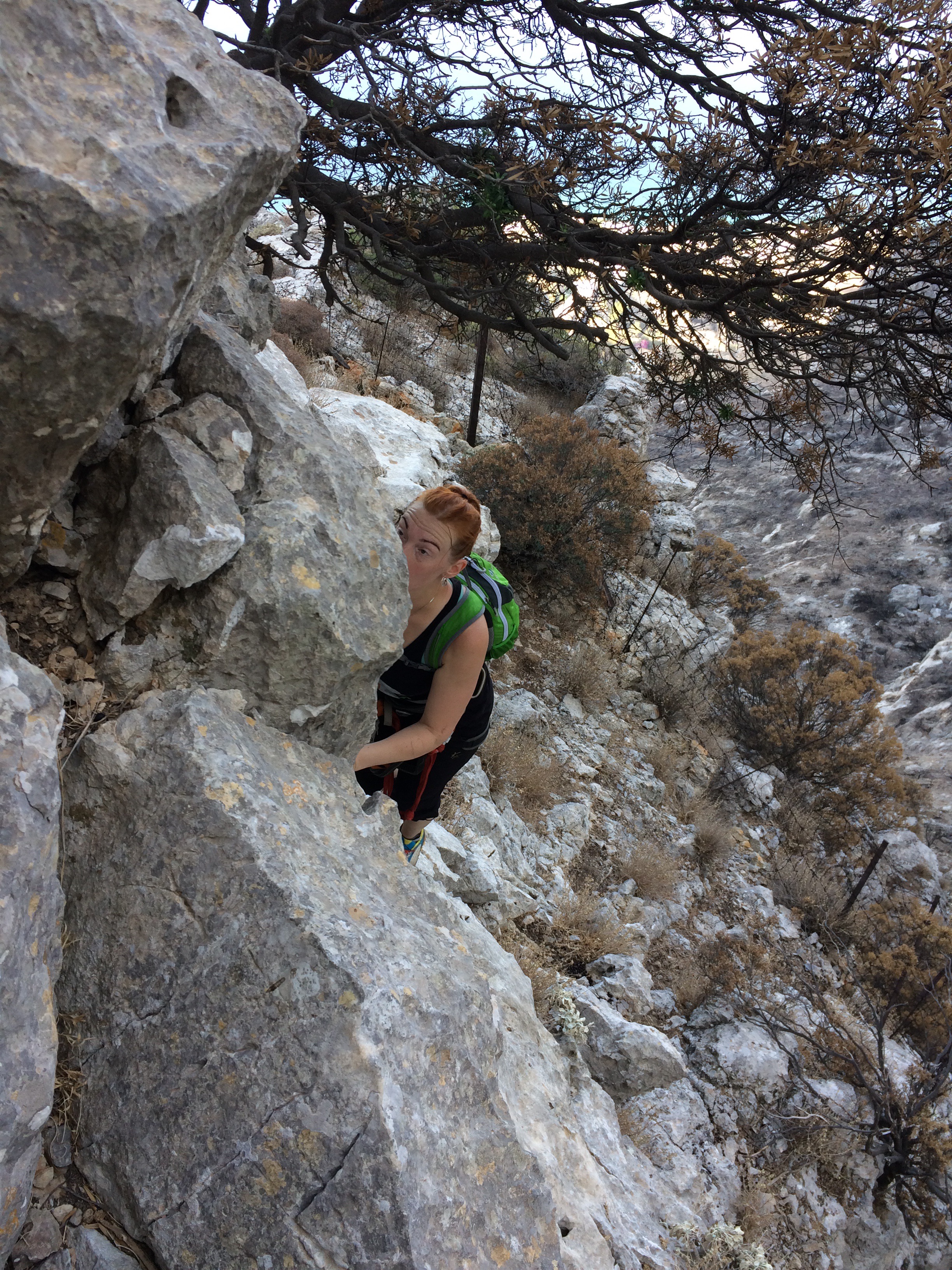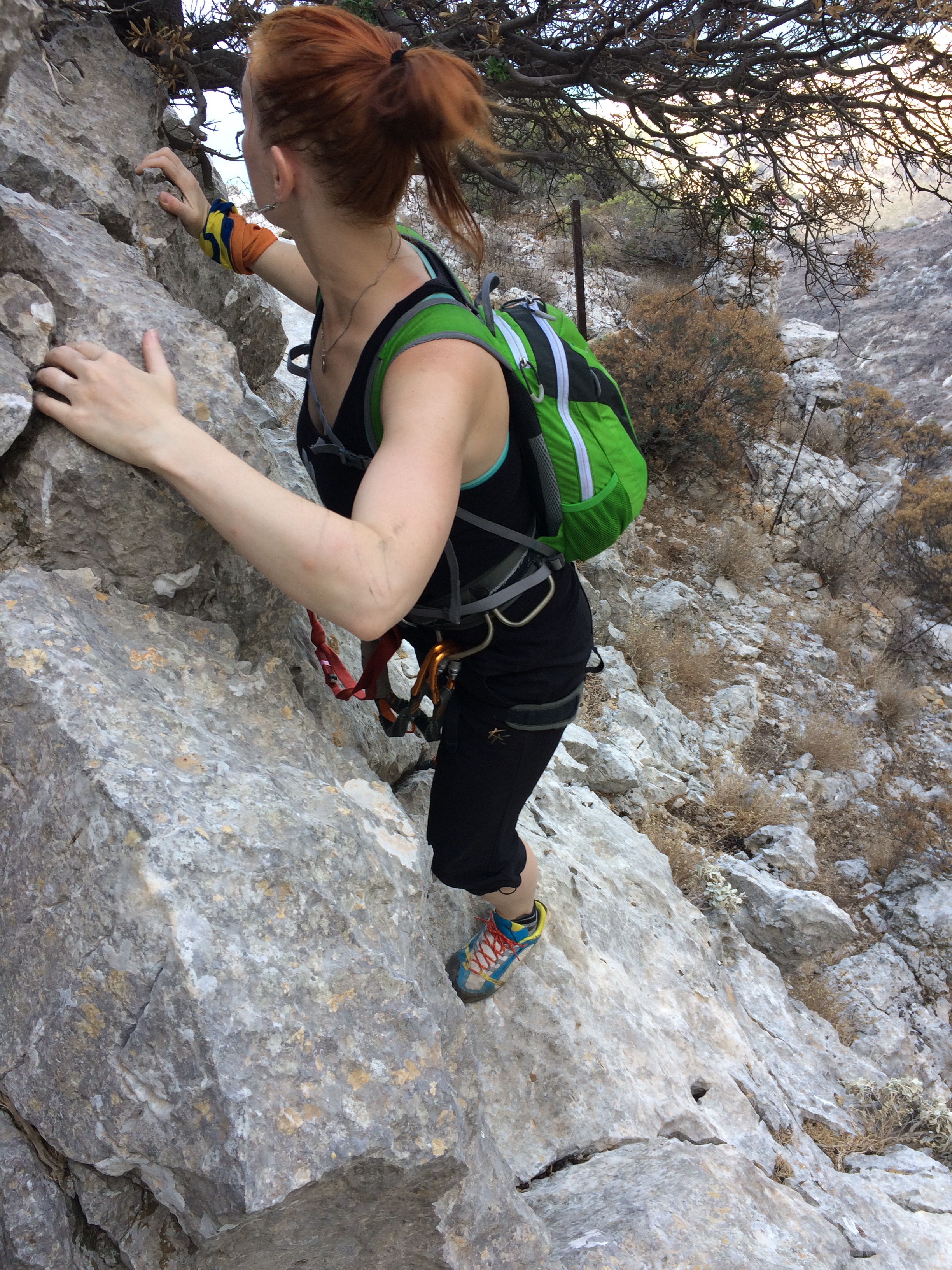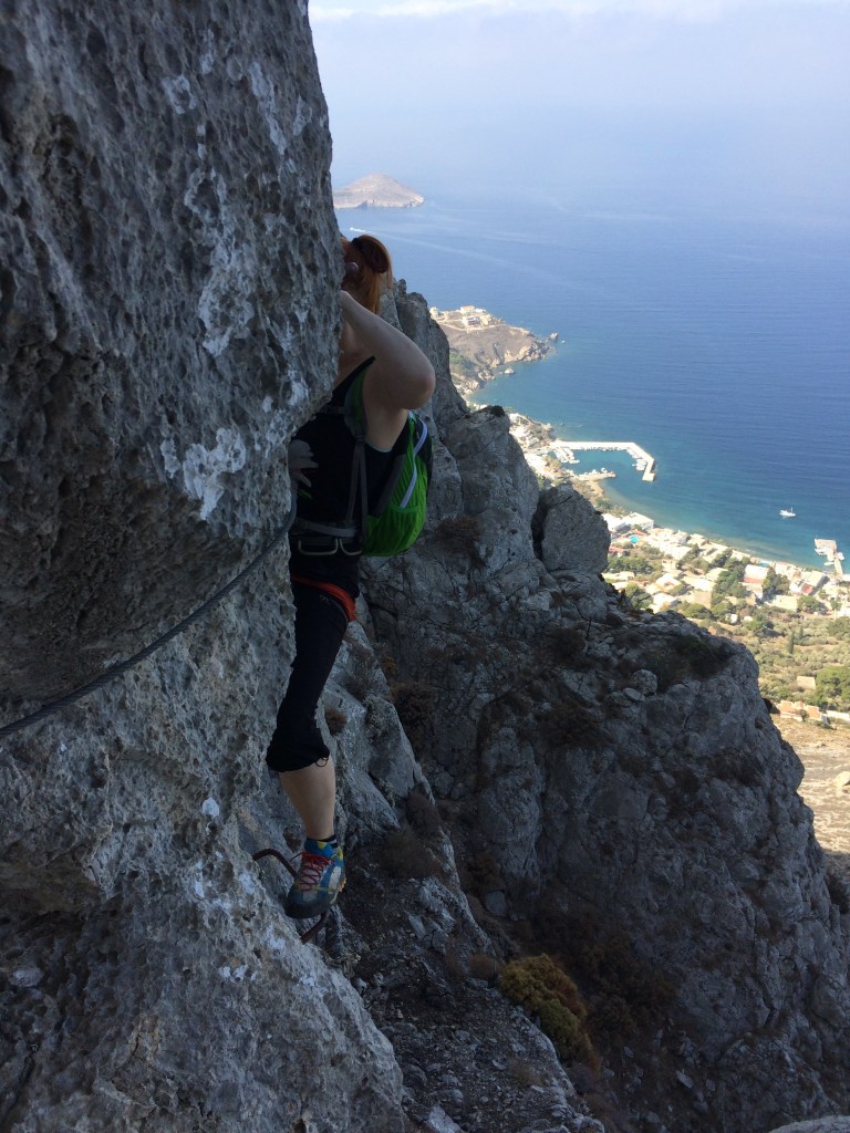 No mitä muuta matkasta sitten jäi käteen ja mieleen? Minulla oli jonkinlainen tavoite kiivetä tänä vuonna 7a Kalymnoksella. Reittivaihtoehtoja oli etukäteen ajatellen kaksi. Viime vuonna kokeilin Arginontassa Sex in the City -reittiä (7a) ja Youtubesta löytyi edustava video Aphroditesta (7a+), joka sijaitsee Grande Grottalla. No pienen pohdinnan jälkeen päätin palata tutulle reitille, etenkin kun sille saa näppärästi yläköyden viereisen 5c:n kautta. Reittiä katsellessa pohdin, että se näyttää helpommalta kuin muistin. Reitti on negatiivinen ensimmäiset 5 pulttia ja jostain syystä ensimmäiset 3 menikin jopa niin hyvin, että ehdin jo toivoa pääseväni reitin ylös asti. Mutta nuolaisin ennen kuin tipahti, konkreettisesti siis. Pulttivälille 3-5 en lopulta keksinyt mitään järkevää tapaa edetä. Toisaalta hommaa vaikeutti se, että treenasin reittiä yläköydellä ja aina kun tipuin kolmannen pultiin jälkeen köysi jousti niin paljon, että tipuin ihan kunnolla, eli sain kiivetä uudestaan ja uudestaan raskaan alkuosan. Lopulta voimat loppuivat ja kiskoin itseni jatkoista pultille 5, josta reitti loiveni ja helpottui. Se nyt tuli ainakin selväksi, että projektointia vaadittaisiin Sex in the Cityn selvittämiseksi. Toisaalta tämä nyt ei ollut hirveä yllätys. Tiesin etten ollut yhtä hyvässä kiipeilykunnossa kuin joskus viime talvena parhaimmillaan olin. Alkukesän 1,5 kuukauden kiipeilytauko laski kuntoa liikaa eikä treeniaikaa ollut tarpeeksi. Tämän kesän 7a-tavoite myös toteutui jo aiemmin kesällä Nalkkilan släbillä. Ja positiivinen puoli oli se, että helpompien reittien kiipeäminen tuntui erittäin hyvältä. Kunto on siis nousussa. Kiipeilyllisesti reissun paras anti oli ehkä se, että Päivikin alkoi tajuta, että kiipeilyssä saattaa olla jotain ideaa ja sai varmistamisrutiiniakin niin paljon, että minä uskalsin jo liidailla ihan huoletta. Loppuviikosta Päivi jo kiipesi reitin BB (5a) puhtaasti yläköydellä ja olisin laittanut Päivin liidaamaankin helpon hyvin pultatun 3c:n Kastellissa viimeisenä aamuna, mutta myrskyisä tuuli ja väsymys vei voiton, vietettiin viimeinen puoli päivää ihan leppoisasti lomaillen.