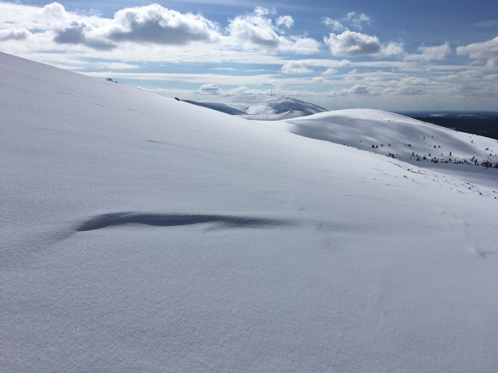 En edelleenkään ollut asettanut sen suurempia toiveita viimeisen lomaviikkoni tekemisille. Maanantaina lähdin vanhempieni ja koirieni kanssa kävelemään Coombackit repussa kohti Hangaskurun laavua. Ajattelin, että käväisen siinä samalla Kesängin huipulla, jos vaikka sattuisi olemaan jotain laskettavaa Hangaskurun laavun suuntaan. Suureksi yllätyksekseni huomasin jo nousun aikana, että lumi oli erinomaista ja aivan huipulle asti. Pallaksen vaelluksen jäiset tunturien laet olivat kadonneet. Lähdin laskemaan Kesängin pohjoisrinnettä ja mitä alemmaksi pääsin, sitä hienommaksi lasku kävi. Tämä rinne on profiililtaan hieno ja nyt lumi oli jo korkella paljakalla, paljon ennen alarinteiden metsiä, todella hienoa laskea. Lasku oli yksi hienoimmistä mitä olen ikinä laskenut! Olisi tehnyt mieli kavuta uudestaan ylös, mutta matkaa piti jatkaa.