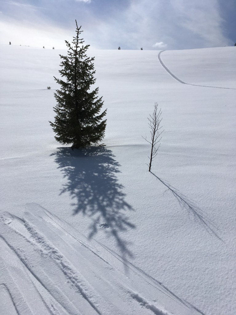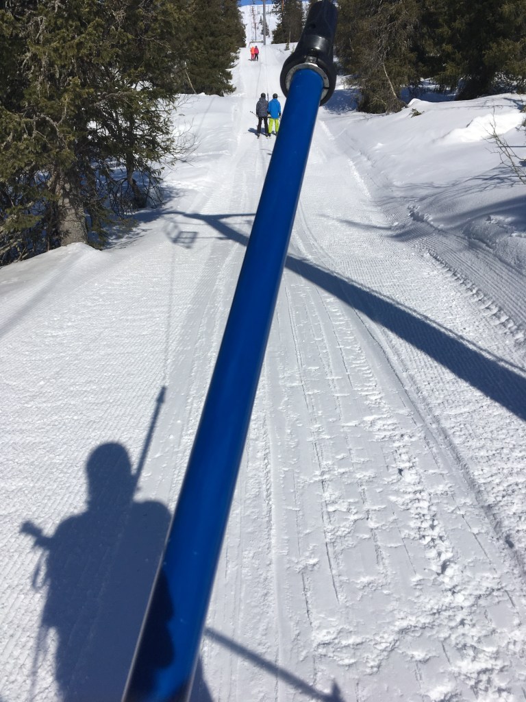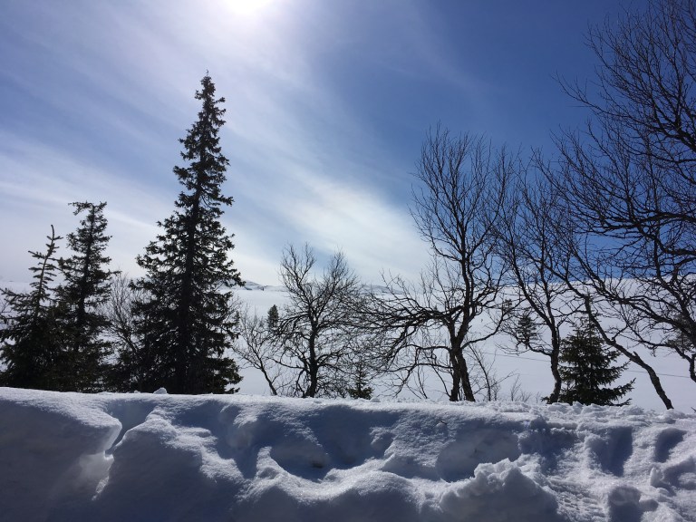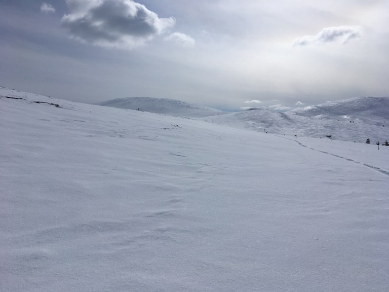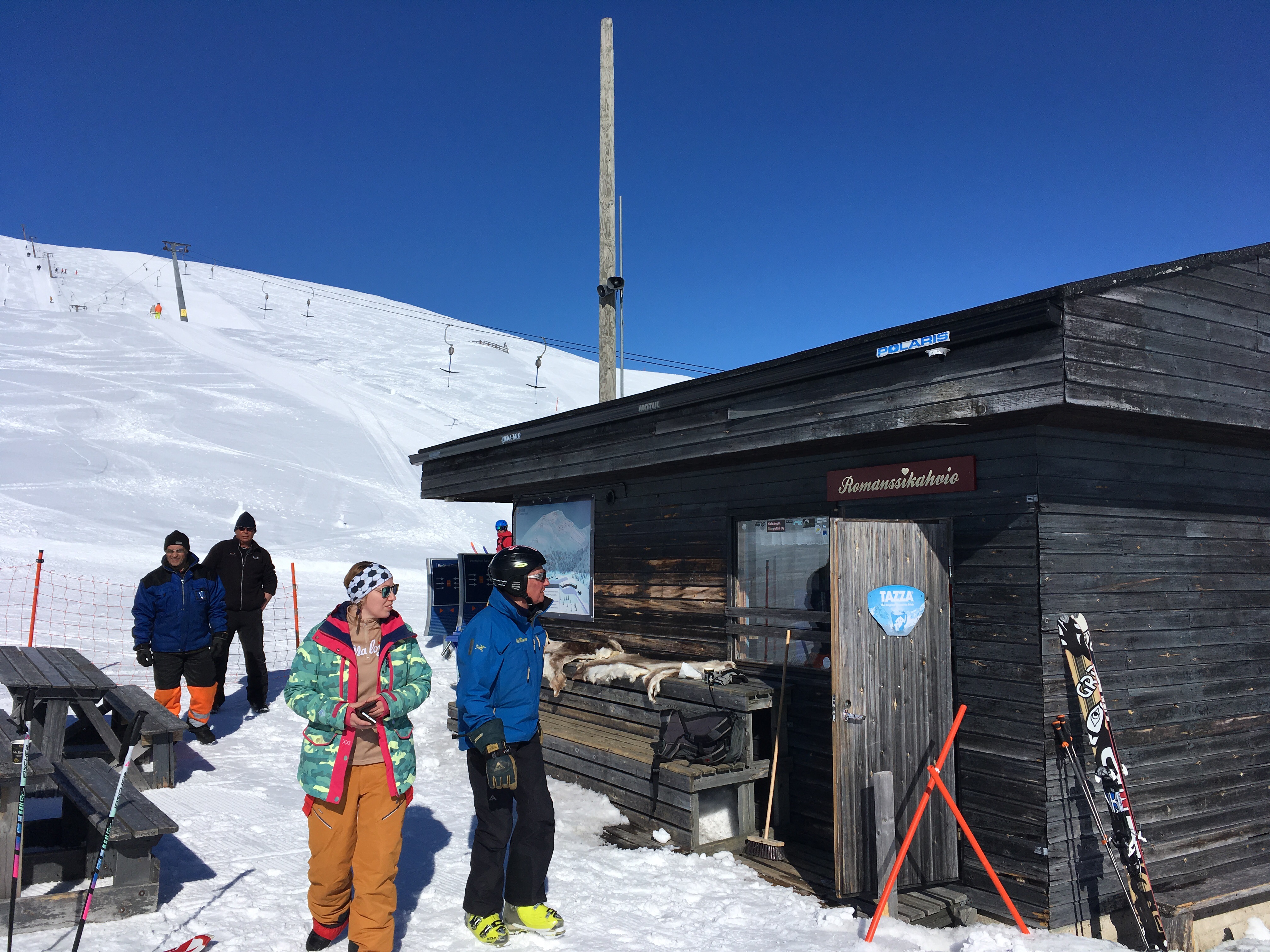 Aloitin hissinousulla ja laskeskelin Romanssikahviolle, jossa söin hillomunkin ja join kupin teetä tulevien ponnistusten tueksi. Romanssikahviolta otin klassikkohissin ylös ja liu’uttelin ensin Laukukeron rinteitä kohti Taivaskeroa ja Laukukeron ja Taivaskeron välisestä satulasta laskin mukavan laskun hyvässä lumessa pitkälle Paratiisikuruun. Jälkikäteen ajatellen olisi ollut fiksumpi kavuta sukset olalla pieni matka Laukukeron huipulle ja laskea sieltä Paratiisikuruun, mutta ei vaan tullut mieleen.