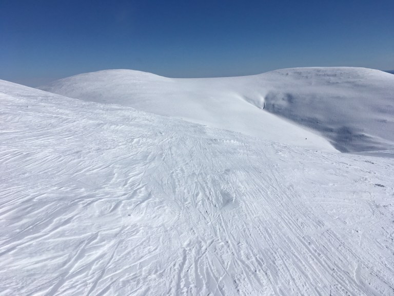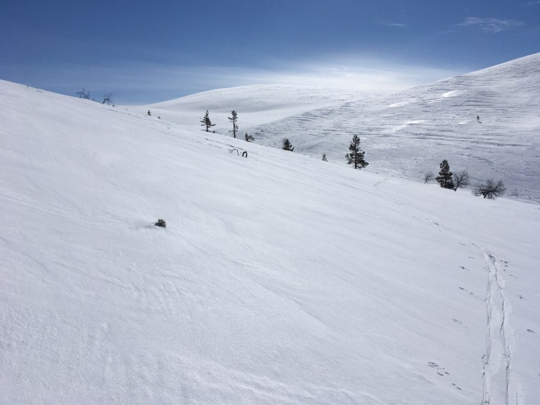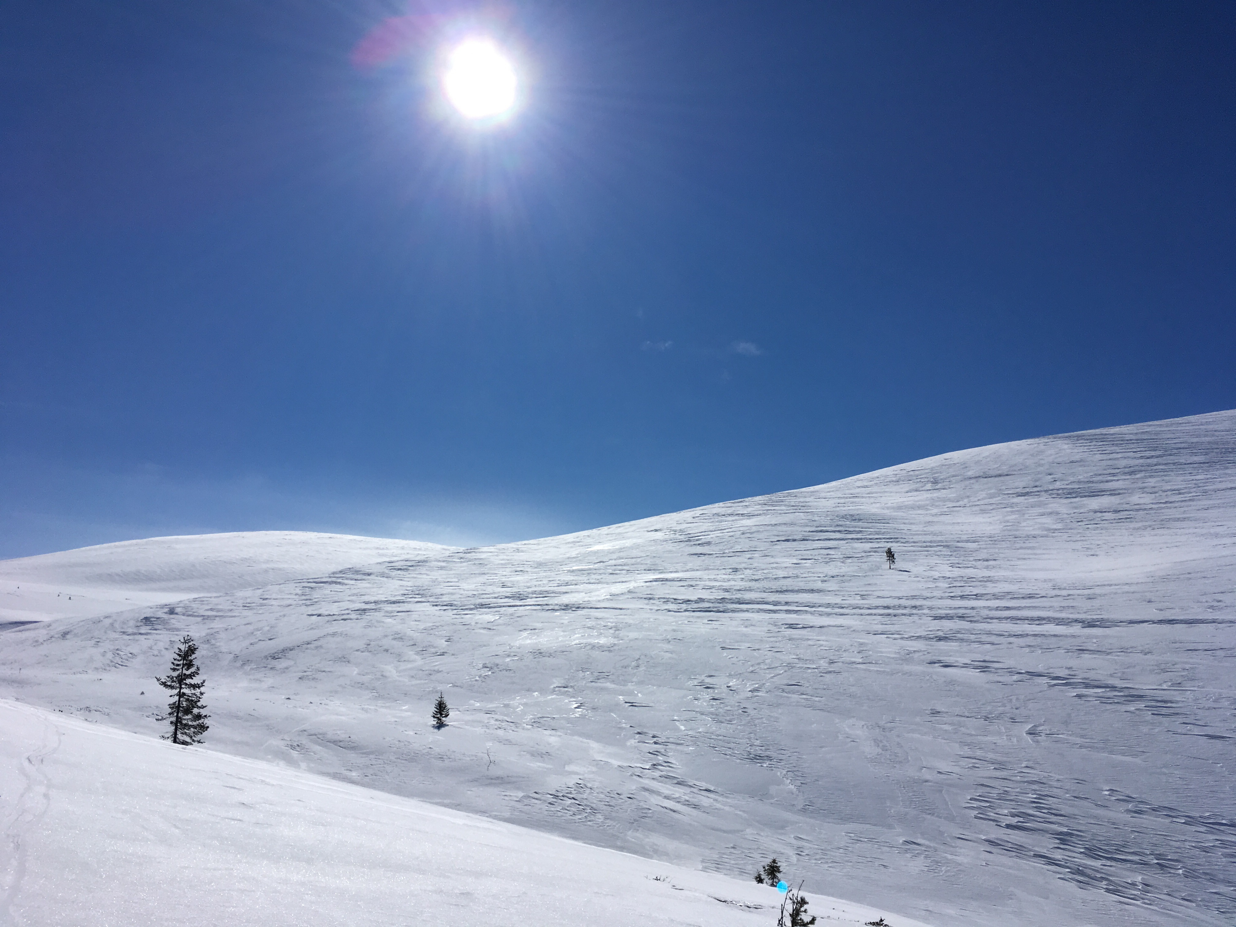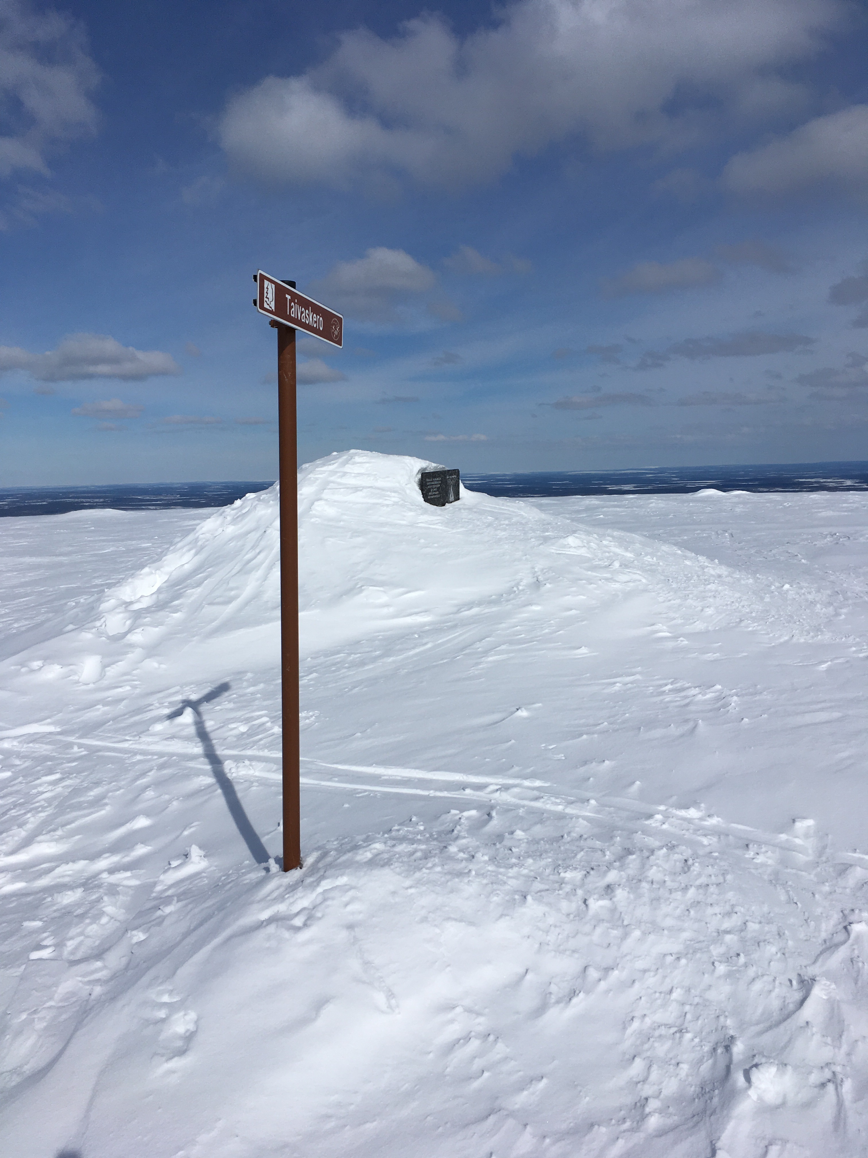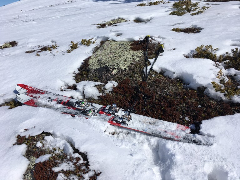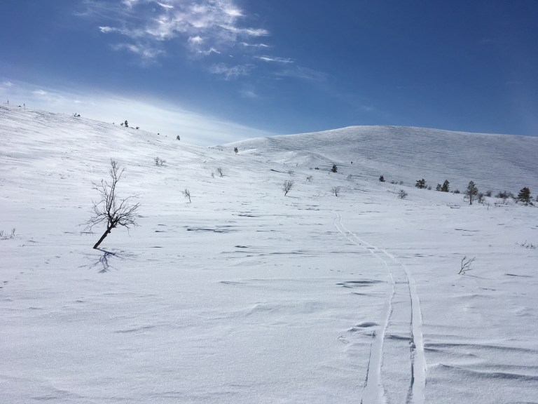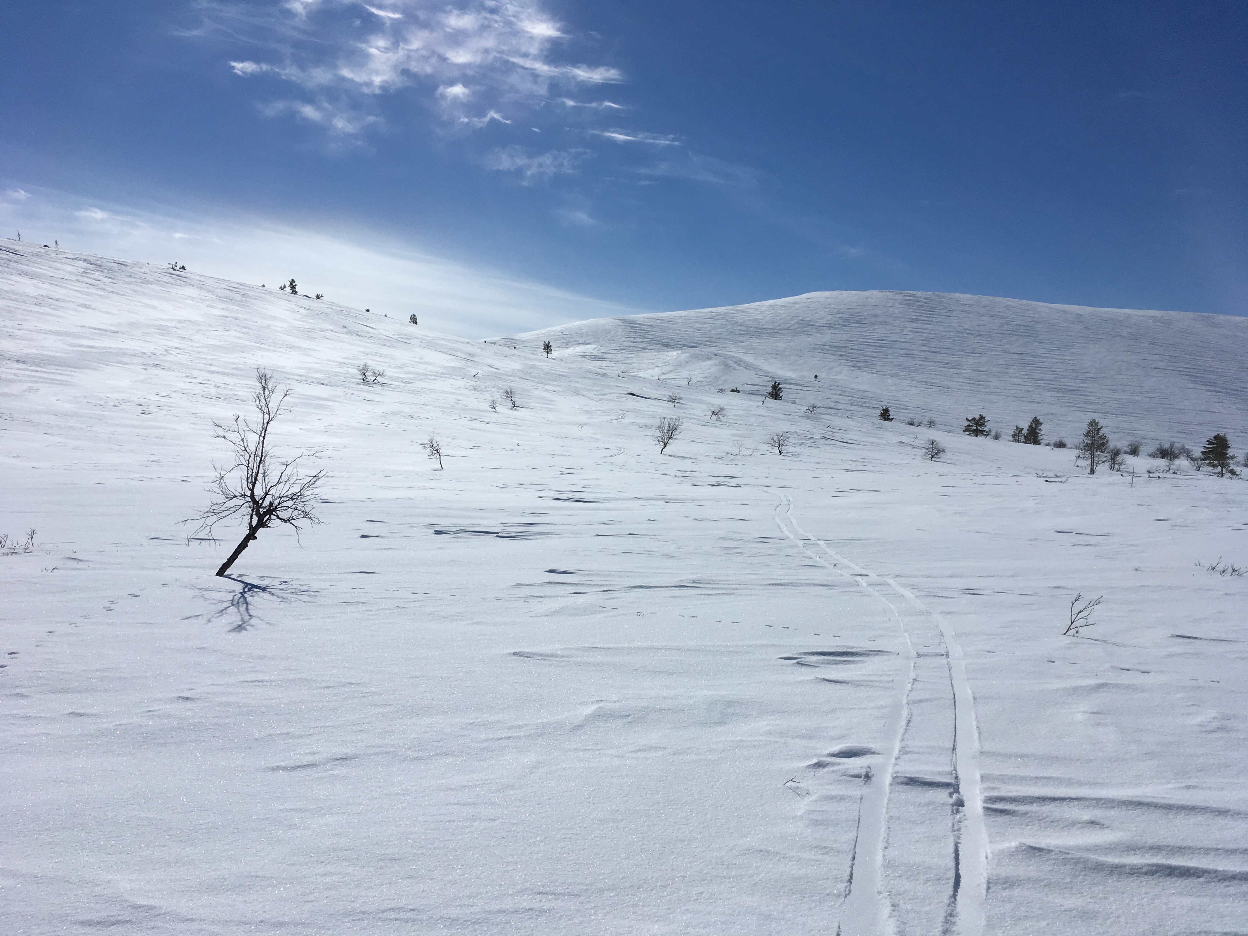 Lopulta saavutin Taivaskeron pohjoisrinteet ja retkeni lopuksi kapusin vielä Taivaskeron huipulle. Nousu oli jyrkähkö ja pohdin, että siitä olisi mukava laskea alaskin. Huipulta upeat maisemat, jälleen kerran. Pallaksen alue on mielestäni ehdottomasti Suomen upein tunturialue! Huipulta päästelin hienon laskun alas Vatikurun pohjalle ja sieltä liu’uttelin takaisin Romanssikahviolle. Hetken ehdin istuskella kahvion terassilla auringossa ennen kuin taivas meni jälleen pilveen ja kylmä tuuli yltyi. Ajoitukseni oli siis täydellinen tälle uudelle yritykselleni Pallaksella. Hienoa, että tämä upea tunturialue näytti minulle tänäkin vuonna myös kauniimman puolensa! Näille rinteille on ehdottomasti palattava vielä monet kerrat…