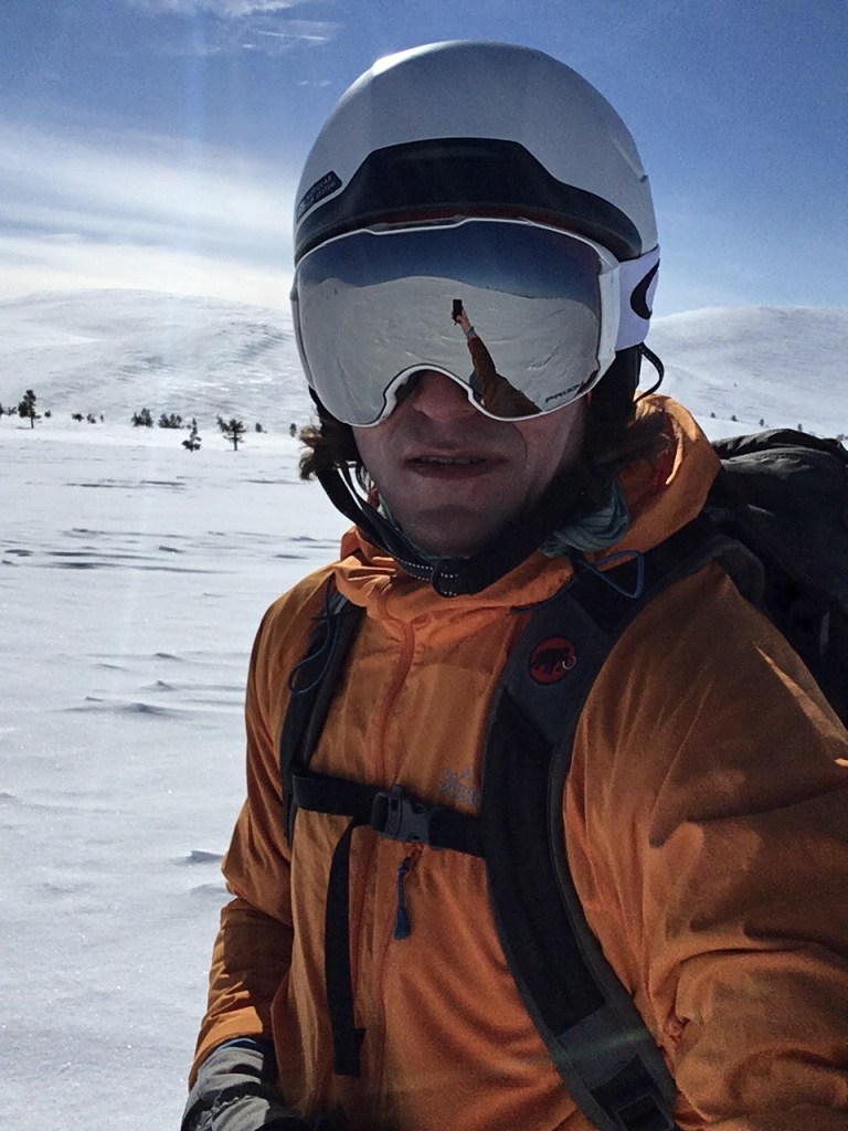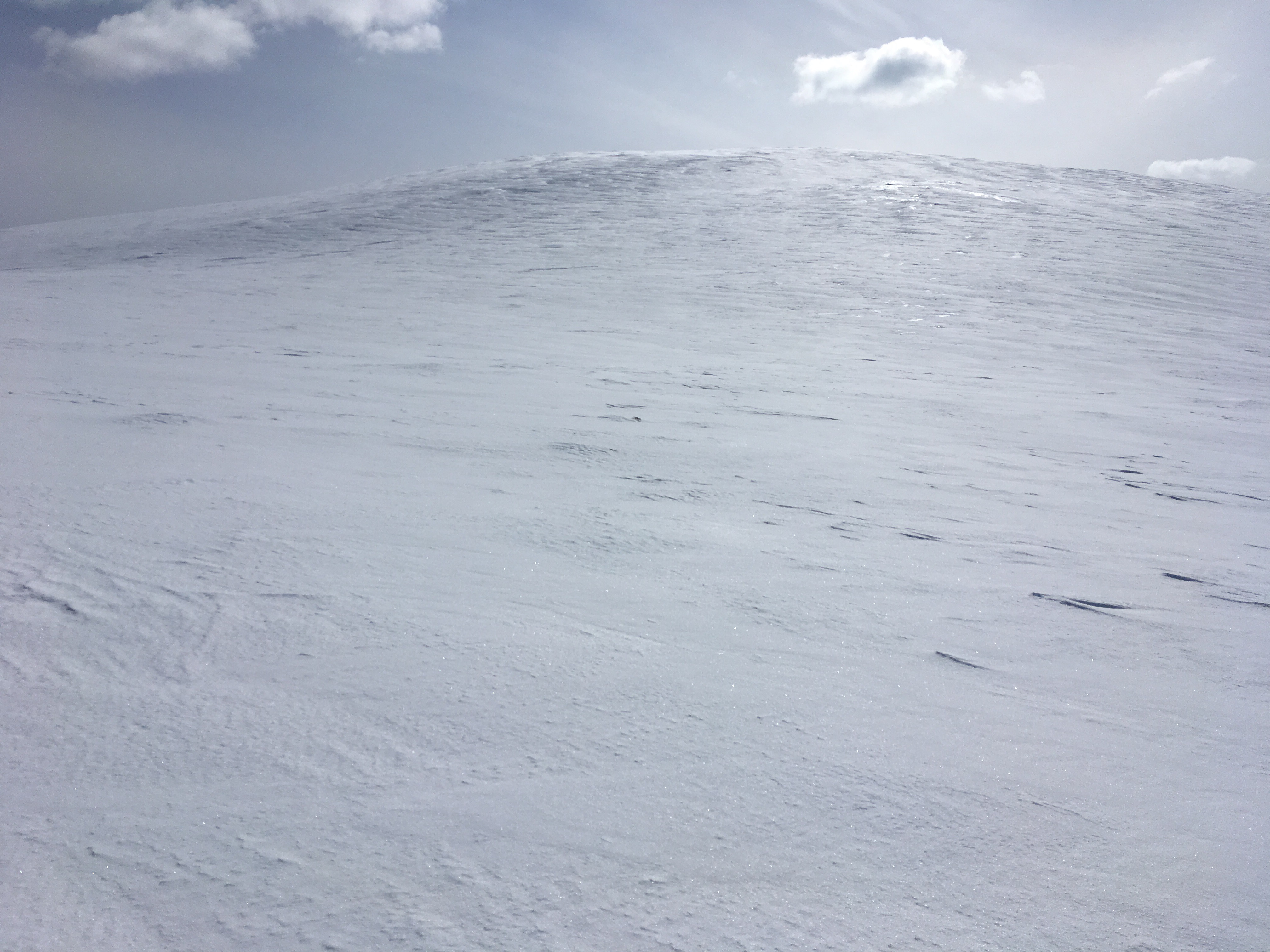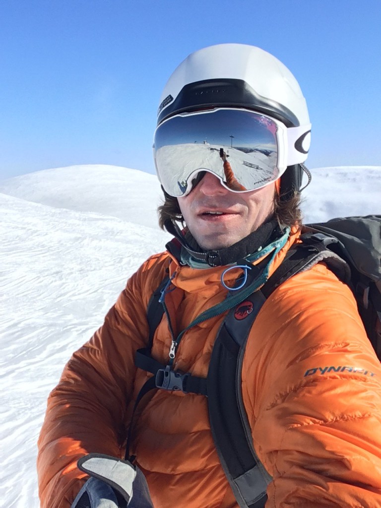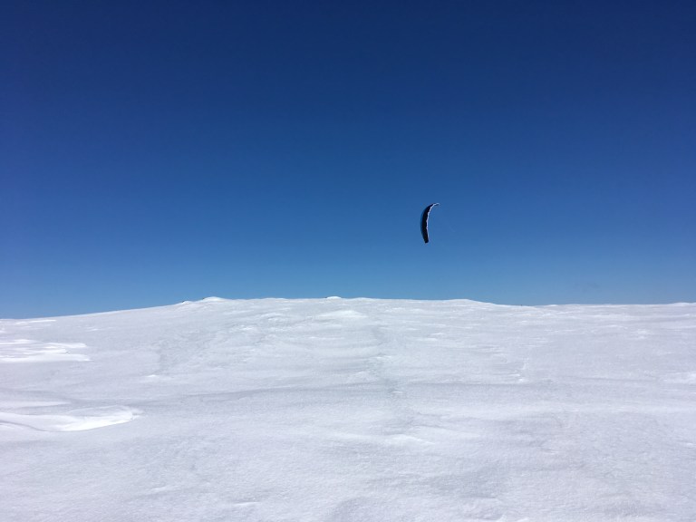 Paratiisikuru oli tällä kertaa hieman tuulinen ja jatkoin pikaisesti ylöspäin kohti Orotuskeron huippua. Kun lähestyin huippua, hauskasti samaan aikaan huipulle oli toisesta suunnasta nousemassa leijahiihtäjä, jonka leija vaappui hassusti hetken rinteen yläpuolella ennen kuin itse hiihtäjä ilmestyi näkyviin. Kuten tuntureilla usein, huipun löytäminen oli vähän hankalaa. Huippu oli niin laakea, että lopulta en oikein hahmottanut koska ne skinit olisi kannattanut ottaa pois ja jouduin hieman lykkimään ja hiihtelemään tunturin laella ennen kuin pääsin alamäkeen. Lasku oli kuitenkin varsin mukava. Pehmeää lunta oli hyvin ja laskin hyvää kyytiä kuruun, jossa Pirjo, Markus ja Lassi olivat minua odotelleet minua varaustupien avainten hakureissulta vaelluksemme ensimmäisenä päivänä.