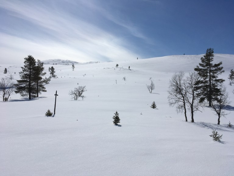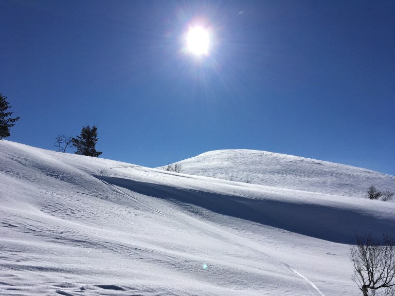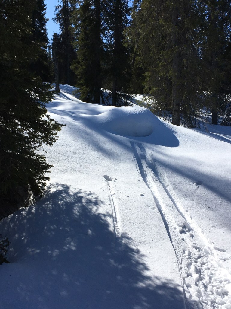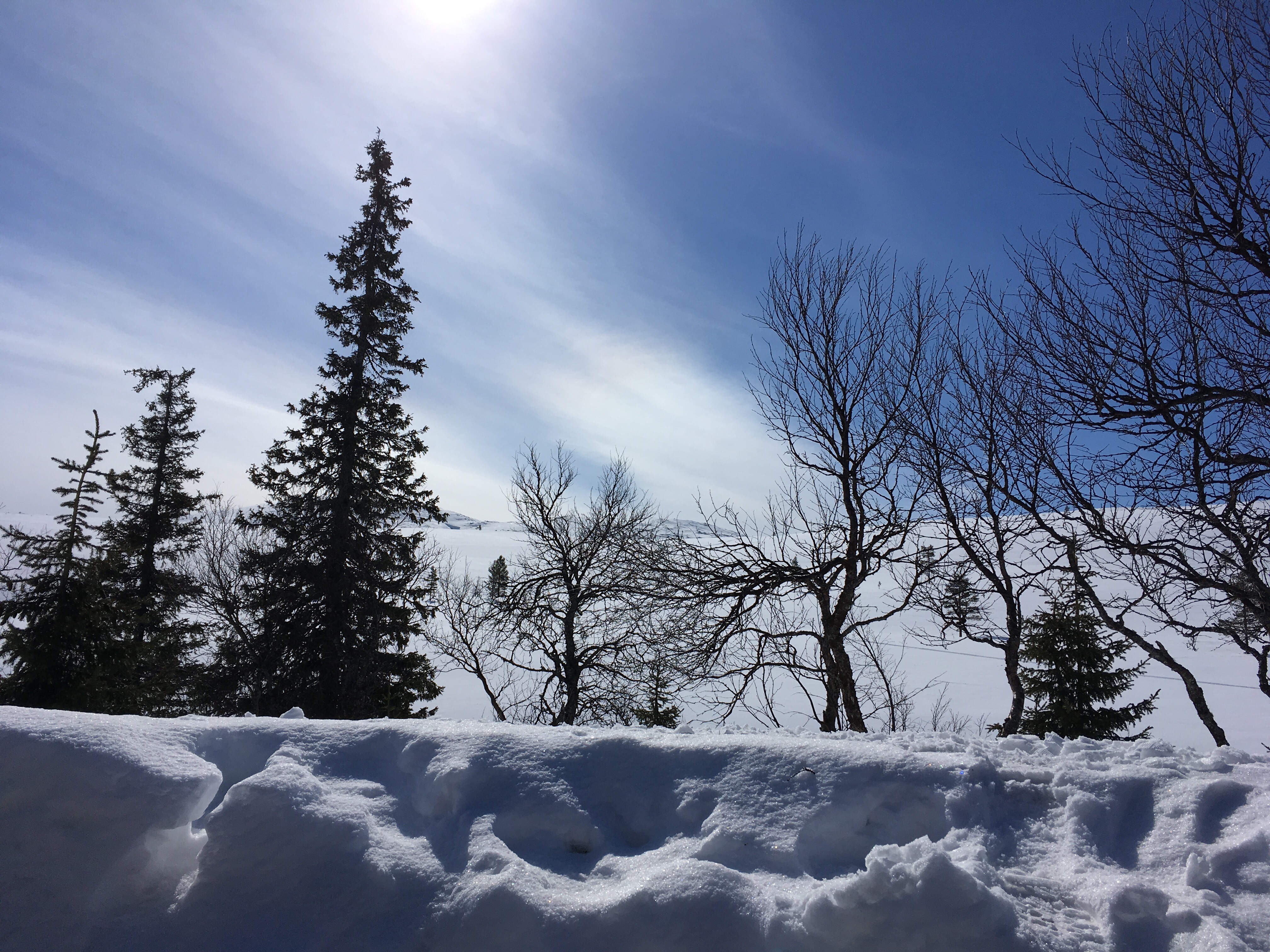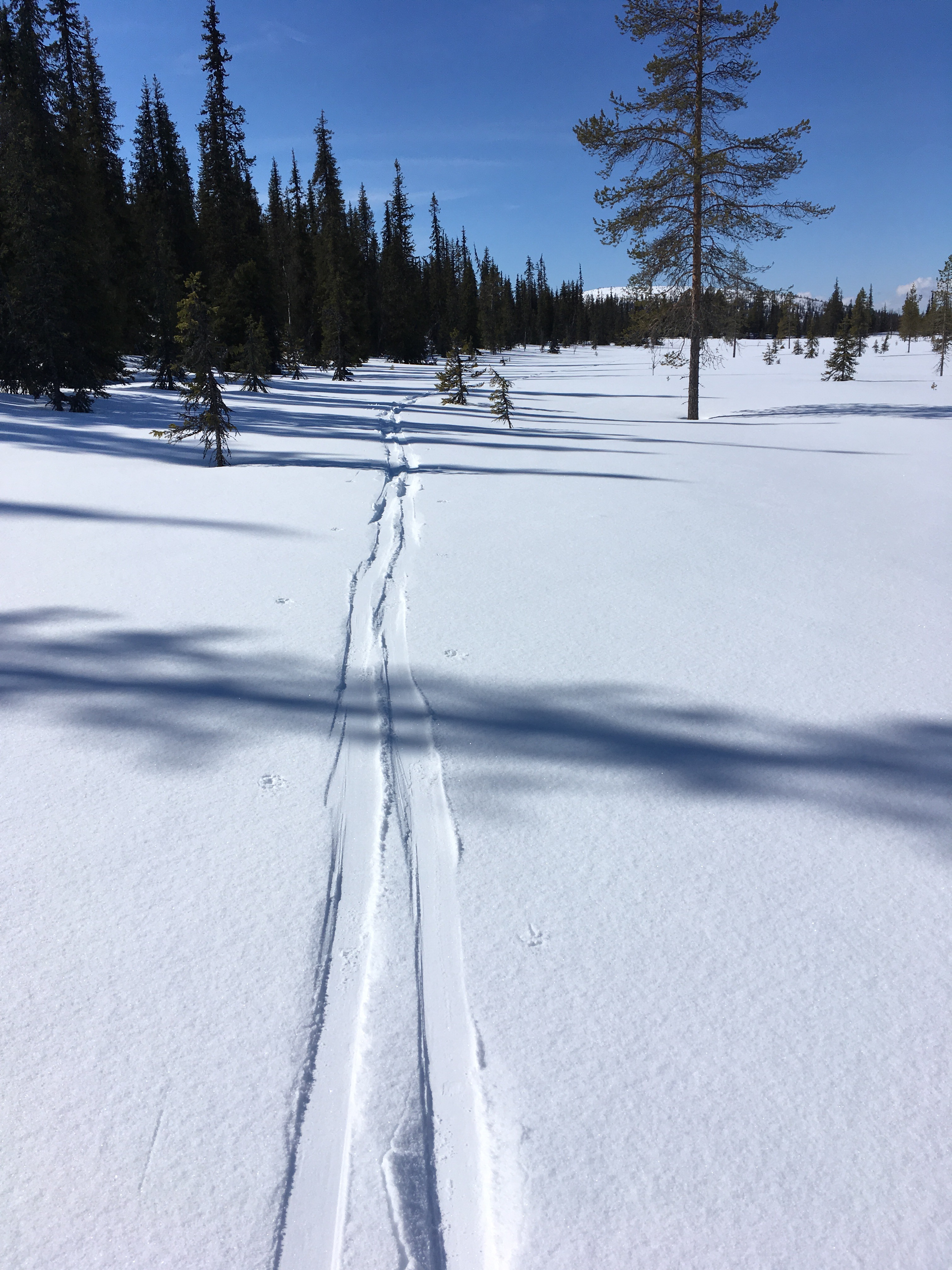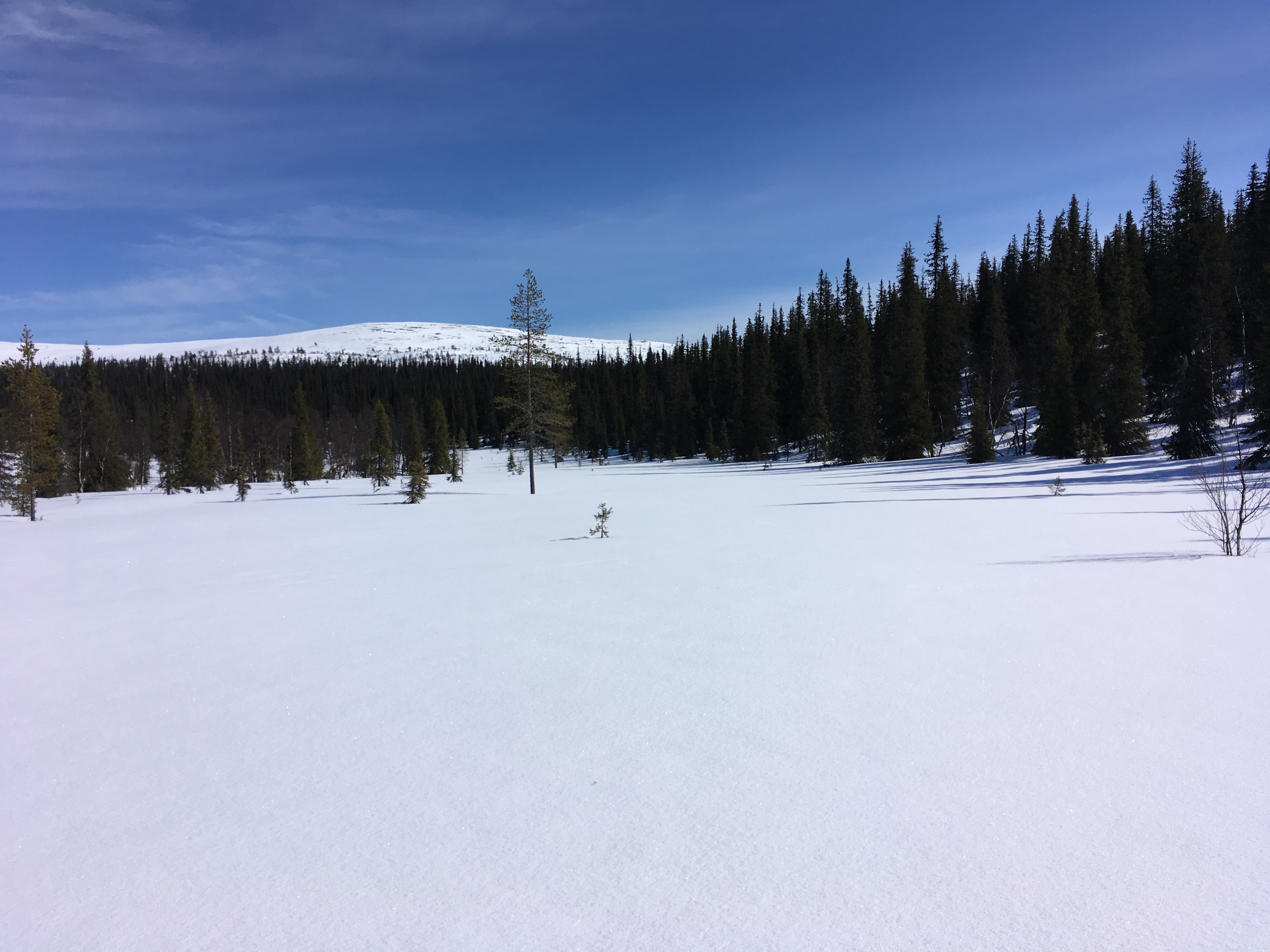 Kurun reunalta löysin mukavan pälven, jossa vaihdoin taas skinit suksiin. Olin ajatellut skinnailla suoraan Rihmakurunvaaroille ja laskea alas Nammalakuruun, mutta kun Lehmäkeron alarinteet näyttivät mukavan lumisilta, niin houkutus laskea oli liian suuri ja kyllä tämäkin lasku kannatti! Siitä sitten kapusin Rihmakurunvaarojen huipulle ja laskeskelin hienoon metsikköön kohti Nammalakurua. Tämä paikka löydettiin jo Pirjon kanssa ja keli oli vain parantunut. Pehmeää lunta oli paksulti ja tein jopa pari hypyn tyylistä laatuneiden kelon runkojen päältä. Vähän toista kuin ne hiihtokeskusten ”lökapöksyhyppyrit”!