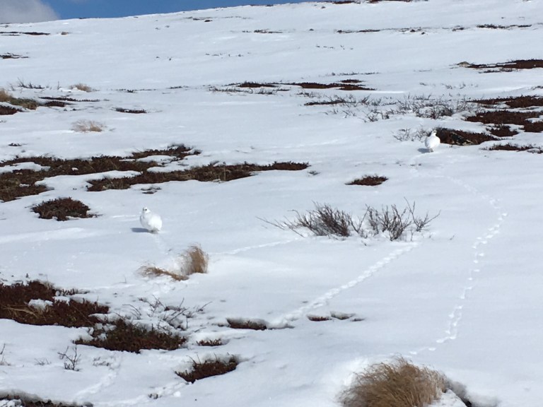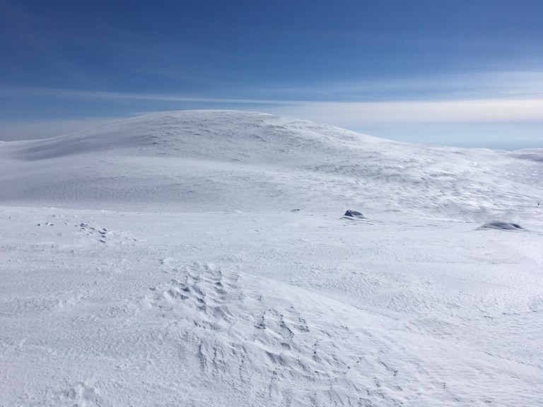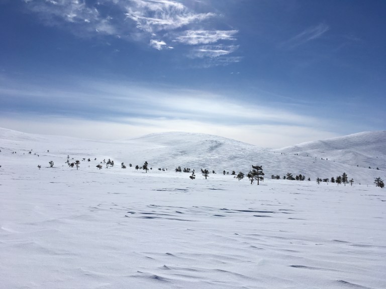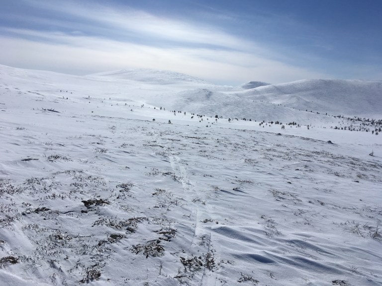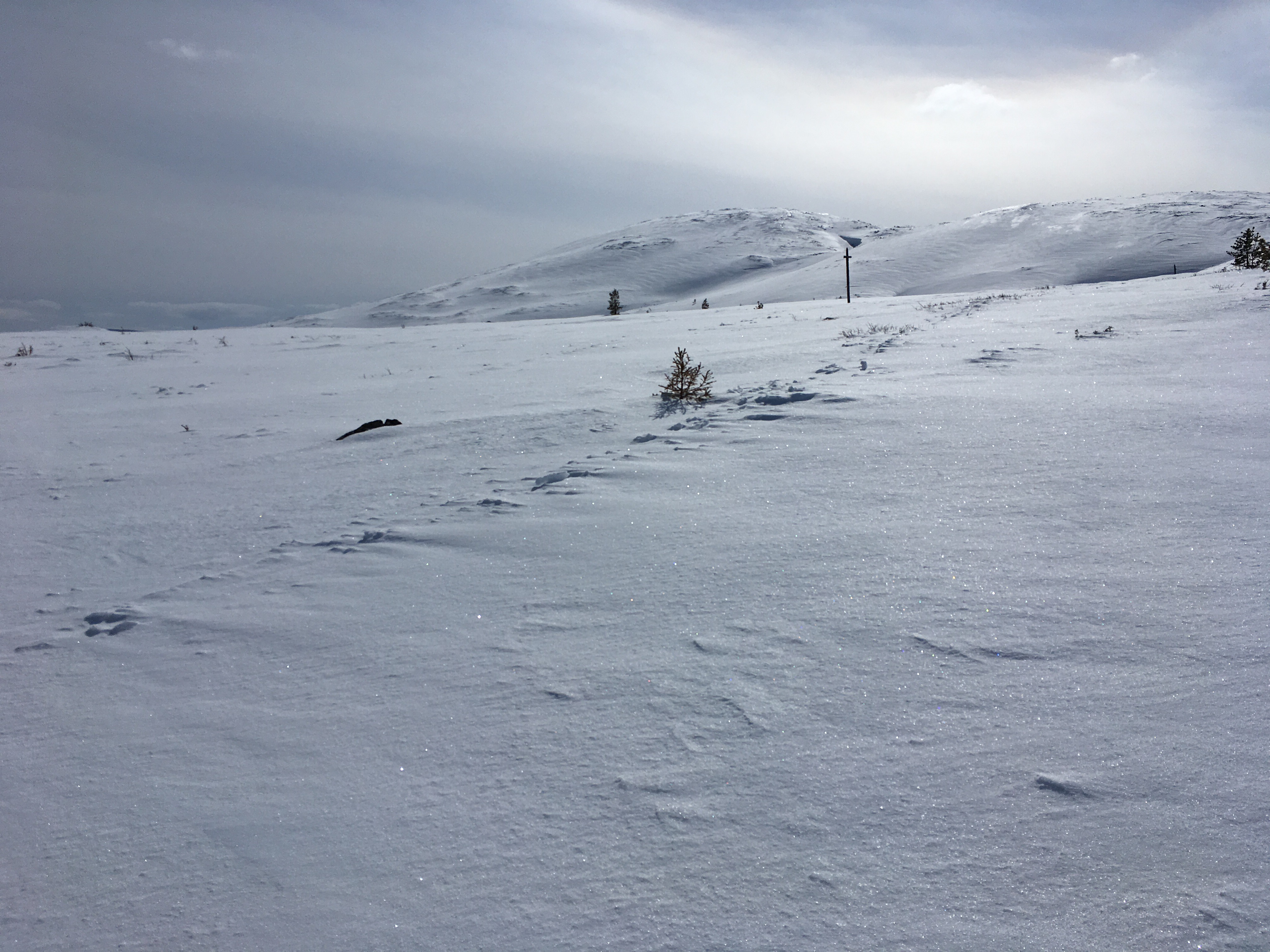 Lähdin seurailemaan Hetta-Pallas -reittiä ylös tunturiin. Tässä kohdassa reitti on hyvinkin vaikuttava. Matka on käytännössä nousua Taivaskerolle asti. Reitti nousee ensin hieman jyrkemmin ylöspäin ja sen jälkeen kulkee halki laakean tunturikattilan. Tämän kattilan keskellä tuntee itsensä melko pieneksi. Valkoiset lumikentät tuntuvat jatkuvan loputtomasti ja joka puolella kohoaa tuntureiden huippuja. Todella vaikuttava paikka! En aivan tarkasti seuraillut reittiä vaan oikaisin hieman ylempää ja reitille sattui pari pälveä joilla näin useamman kiirunan aivan muutaman metrin päästä. Harvoin pääsee näkemään juuri mitään eläimiä luonnossa näin läheltä.