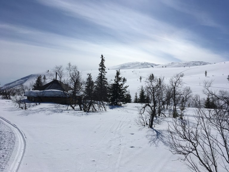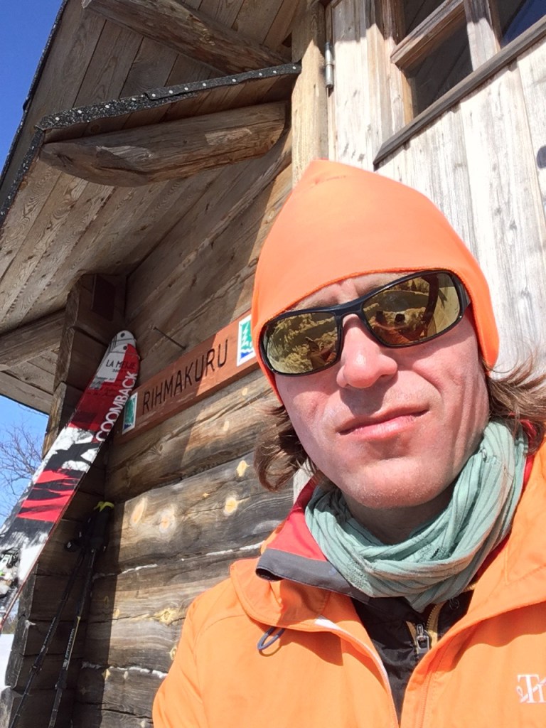 Nammalakurun pohjalta löysin moottorikelkkauran, jonka oletin menevän Rihmakurun kodalle ja sinnehän se meni. Kodan edustalla oli täysin tuuletonta ja aurinko lämmitti mukavasti räystäiden jääpuikkojen tiputellessa vesipisaroita. Aivan täydellinen paikka ja hetki syödä eväitä! Istuskelinkin siinä portailla lämpimässä ja pohdiskelin, että millaisissa ääripäissä tunturin olosuhteet voivatkaan olla. Taivas voi muuttua äkkiä helvetiksi ja päinvastoin. Joten ei auttanut muu kuin jatkaa matkaa.