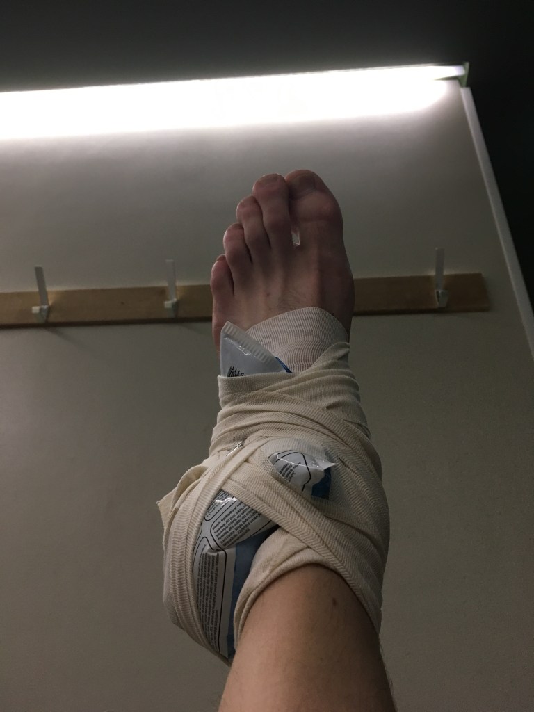 Niinhän siinä sitten kävi, että vasen nilkka vääntyi pahanlaisesti ja ei kun nilkuttamaan kohti autoa ja Pohjola-sairaalaa, josta hoitui lääkärin aika melkeinpä samantien ja lääkärikin oli suorastaan julkkistasoa, Eero Hyvärinen, eli jos joku muistaa niin herra leikkaili Kalle Palanderin vammoja vuosien ajan. No Eero totesi, että saattaa olla jänne pompannut kehräsluun takaa. Sama vamma siis mikä aikoinaan sattui oikeaan nilkkaan. Siitä sitten samana iltana vielä magneettikuvaan ja potentiaalinen leikkausaika aamuksi. No onneksi kuvista selvisi, että leikkausta ei tarvitsekaan, lepo riittää. Sain kontrolliajan kuukauden päähän ja eipä sitten muuta kuin nilkkaa kuntouttamaan.