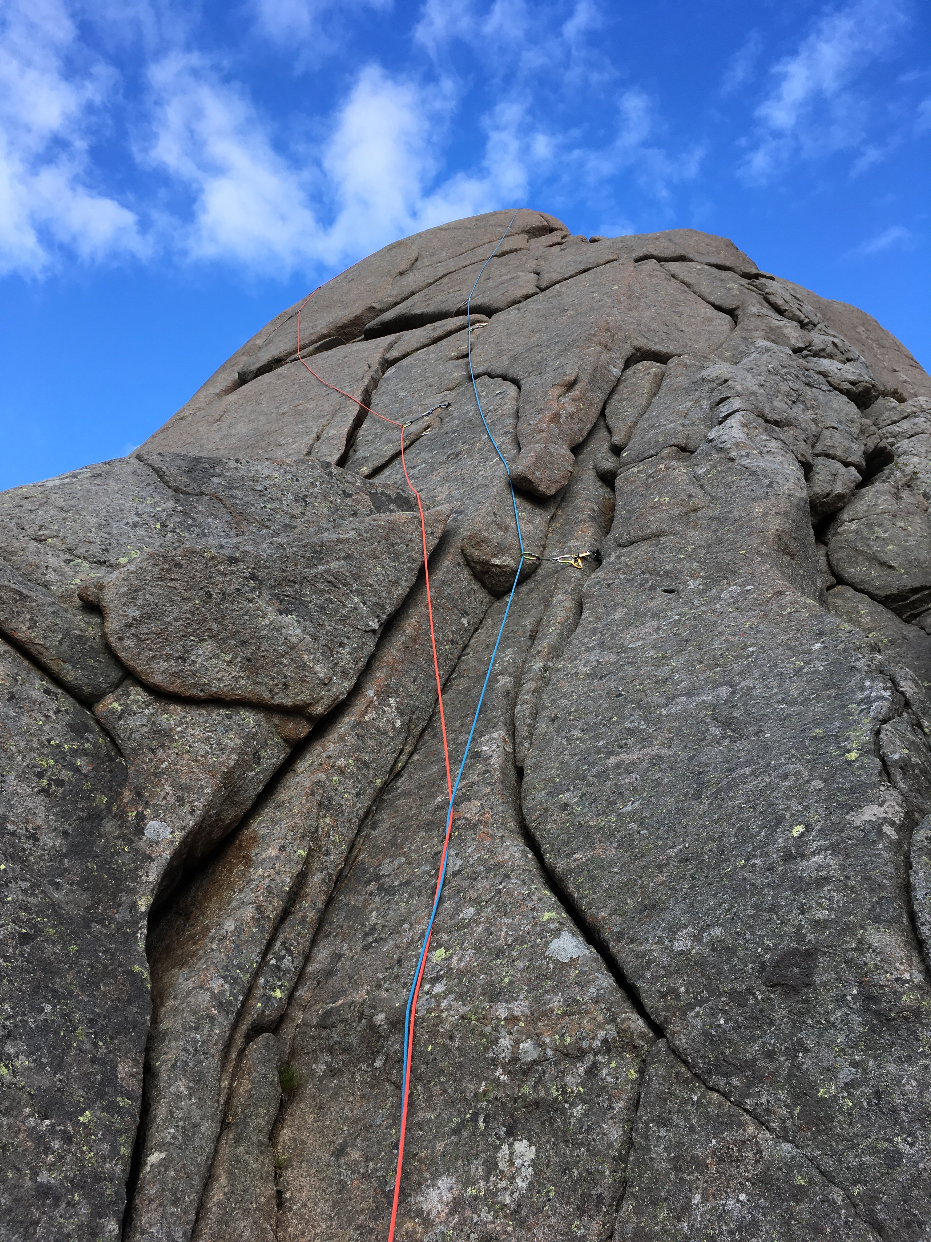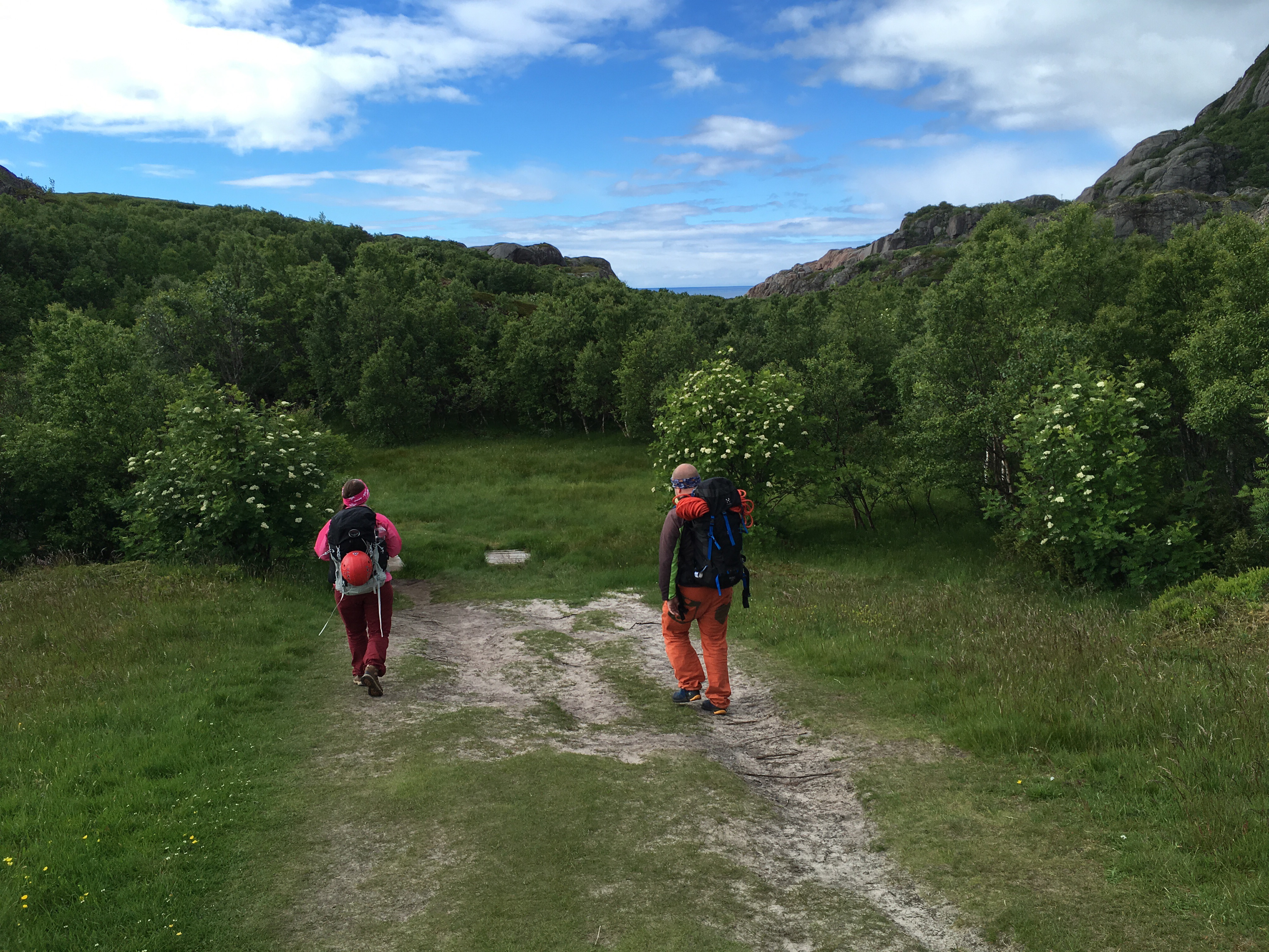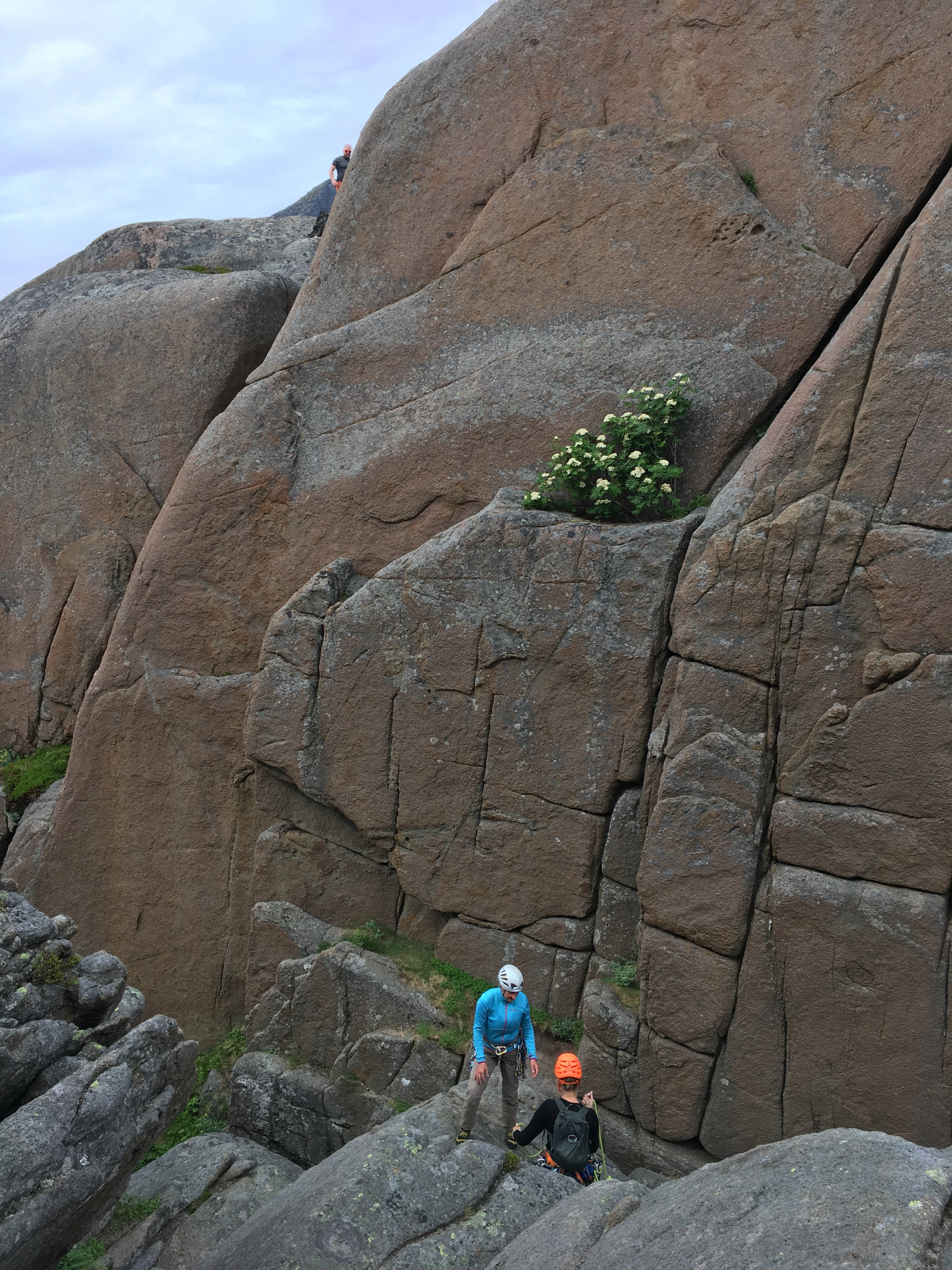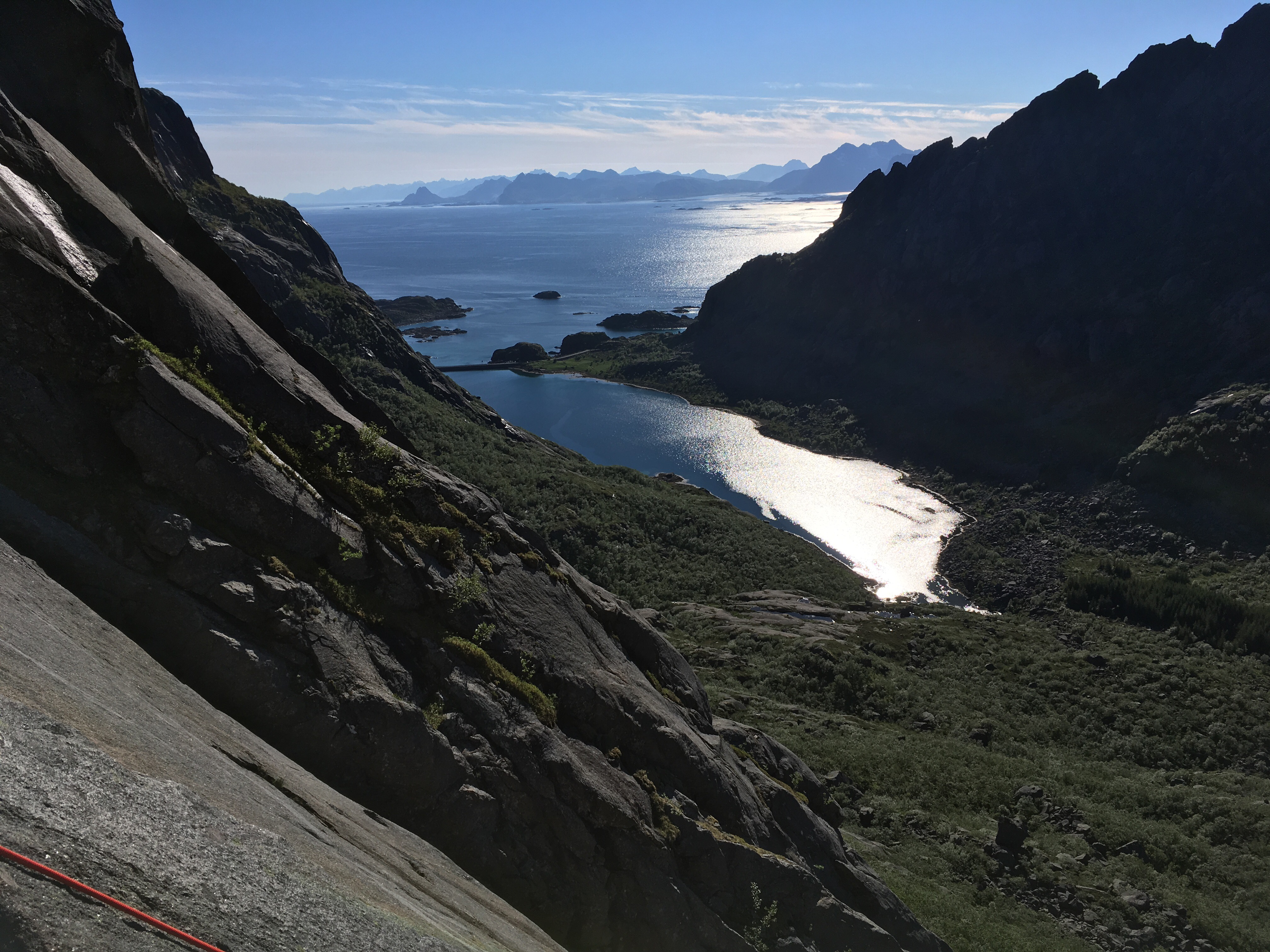Ensimmäisenä päivänä Lofooteilla päätettiin lähteä Veskun ja Hannan kanssa jo melkein perinteiselle aloituspäivän reitille eli Bare Blåbaerille, jonne lähestyminen on melko pitkä ja hankalakulkuinen polku. Oikeastaan heti, kun polku muuttui edes hieman vaikeakulkuiseksi, minun eteneminen hidastui merkittävästi. En pystynyt luottamaan nilkkaan yhtään. Jokainen askel piti tehdä varovasti ja hitaasti. Kiveltä kivelle hyppiminen oli täysin pois suljettu vaihtoehto. Tämä oli jopa hieman järkytys. Olin kävellyt nilkalla vammatumisen jälkeen pääosin kovalla ja tasaisella alustalla enkä ollut edes tajunnut miten vaikeaa kävely epätasaisella edelleen on. Itse kiipeily sujui sentään kohtuullisesti, mitä nyt släbillä kiipeily tuntui siltä kuin yksi neljästä tukipisteestä puuttuisi. Olen aina pitänyt suunnattomasti Bare Blåbaerin viidennestä köydenpituudesta. Siinä seuraillaan kaunista vähitellen ohenevaa halkeamaa ja lopulta kiivetään käytännössä släbillä. Vammautunut nilkka ei kuitenkaan taipunut niin kuin nilkan pitää släbillä taipua, jotta saa mahdollisimman paljon jalkapohjaa kalliota vasten tuomaan kitkaa. Tämän seurauksena släbillä kiipeäminen tuntui epävarmalta ja jopa epämukavalta.