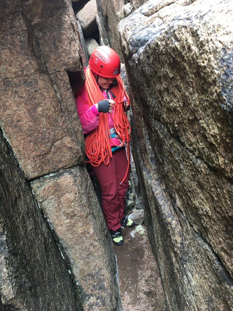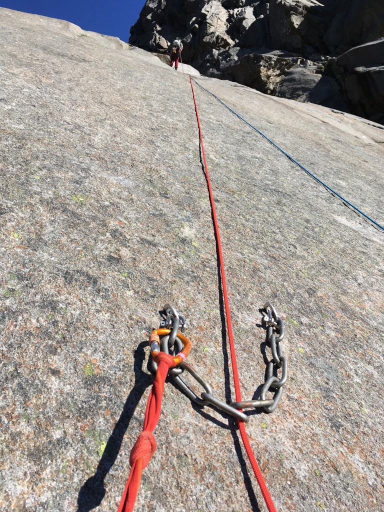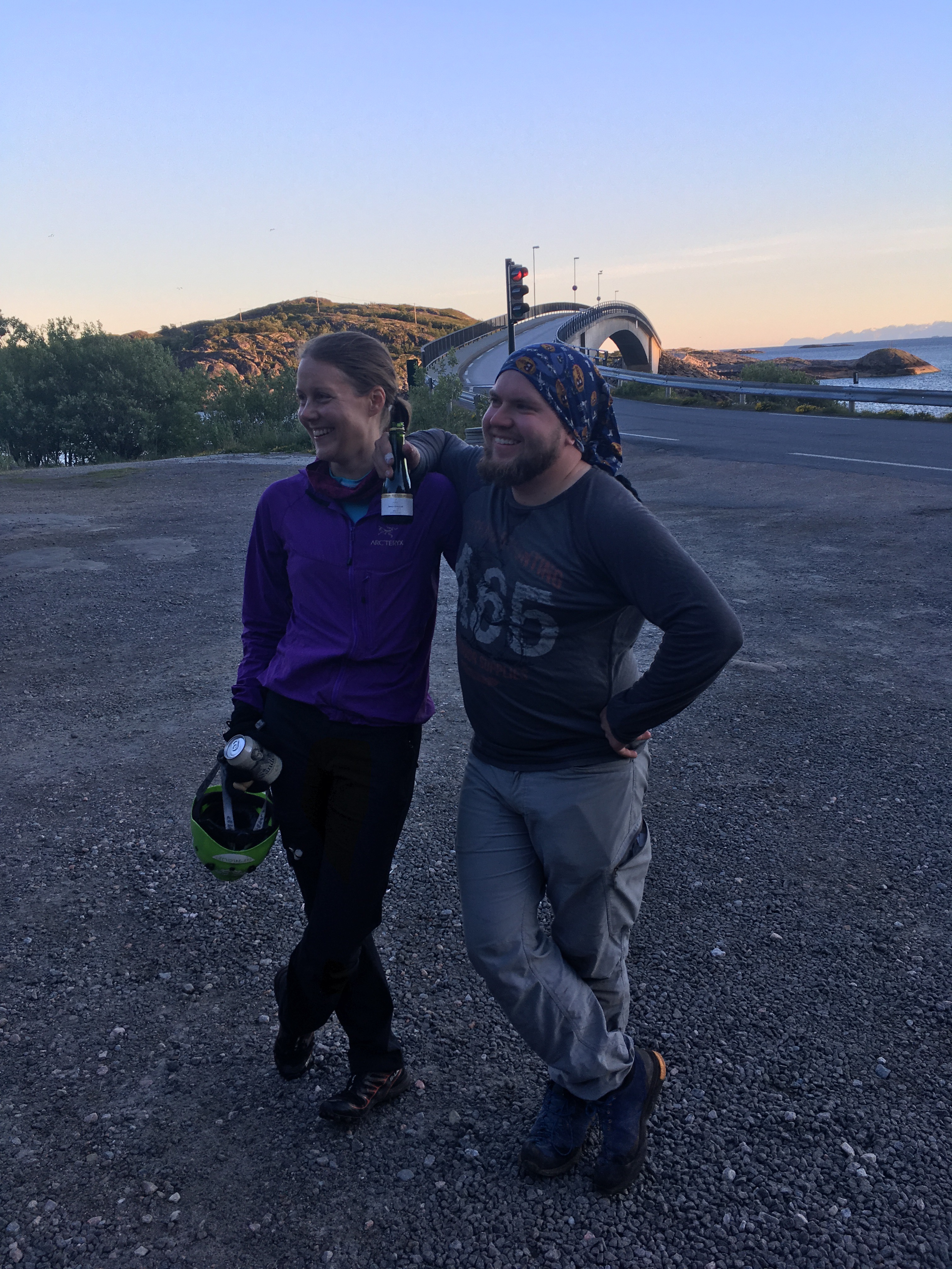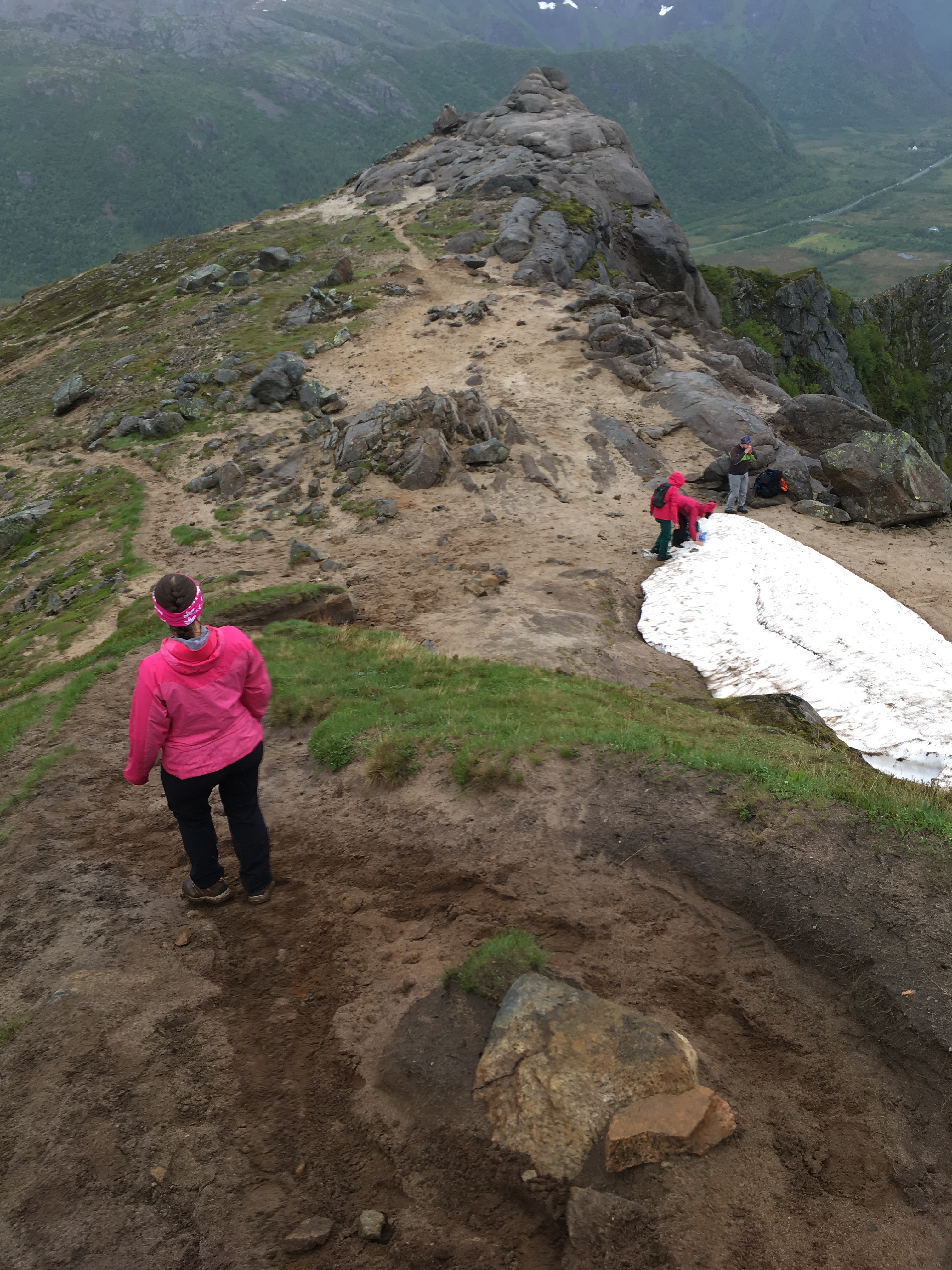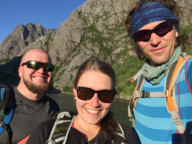 Ensimmäisenä päivänä Lofooteilla päätettiin lähteä Veskun ja Hannan kanssa jo melkein perinteiselle aloituspäivän reitille eli Bare Blåbaerille, jonne lähestyminen on melko pitkä ja hankalakulkuinen polku. Oikeastaan heti, kun polku muuttui edes hieman vaikeakulkuiseksi, minun eteneminen hidastui merkittävästi. En pystynyt luottamaan nilkkaan yhtään. Jokainen askel piti tehdä varovasti ja hitaasti. Kiveltä kivelle hyppiminen oli täysin pois suljettu vaihtoehto. Tämä oli jopa hieman järkytys. Olin kävellyt nilkalla vammatumisen jälkeen pääosin kovalla ja tasaisella alustalla enkä ollut edes tajunnut miten vaikeaa kävely epätasaisella edelleen on. Itse kiipeily sujui sentään kohtuullisesti, mitä nyt släbillä kiipeily tuntui siltä kuin yksi neljästä tukipisteestä puuttuisi. Olen aina pitänyt suunnattomasti Bare Blåbaerin viidennestä köydenpituudesta. Siinä seuraillaan kaunista vähitellen ohenevaa halkeamaa ja lopulta kiivetään käytännössä släbillä. Vammautunut nilkka ei kuitenkaan taipunut niin kuin nilkan pitää släbillä taipua, jotta saa mahdollisimman paljon jalkapohjaa kalliota vasten tuomaan kitkaa. Tämän seurauksena släbillä kiipeäminen tuntui epävarmalta ja jopa epämukavalta.