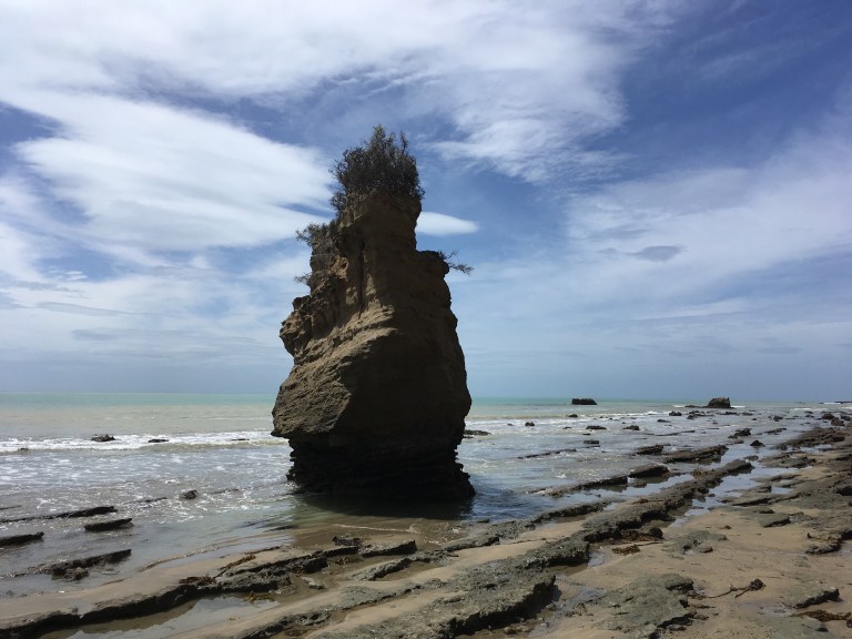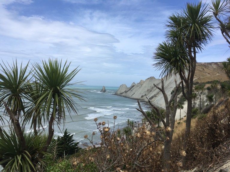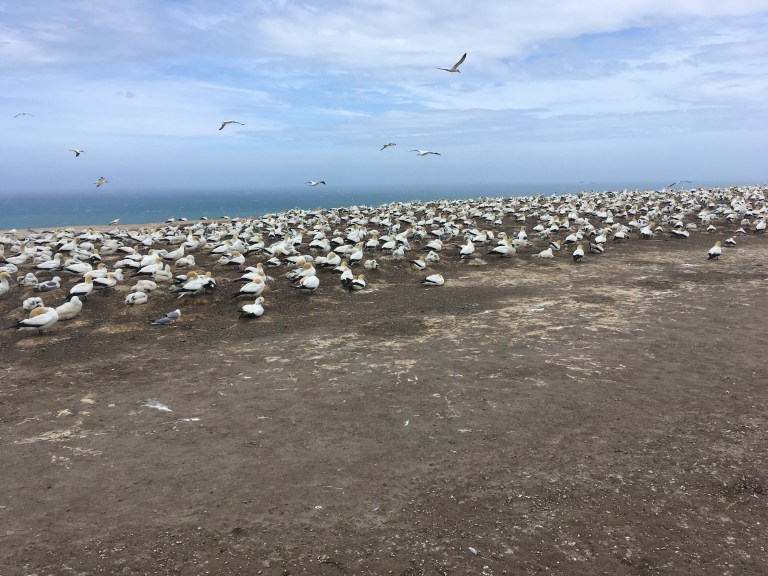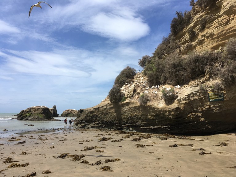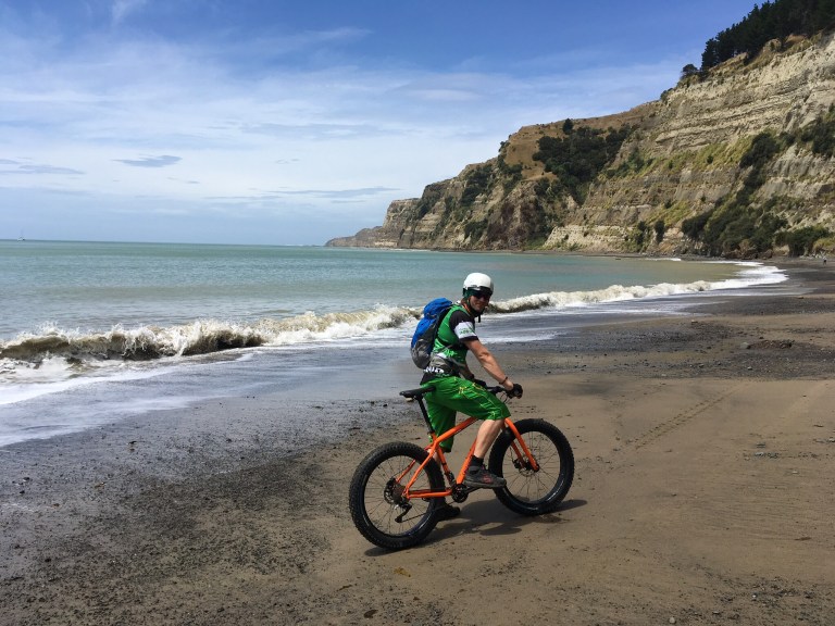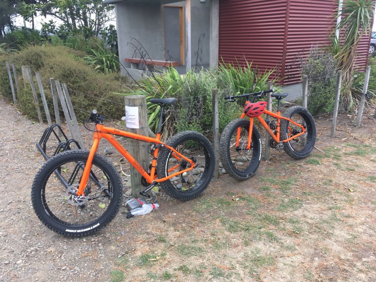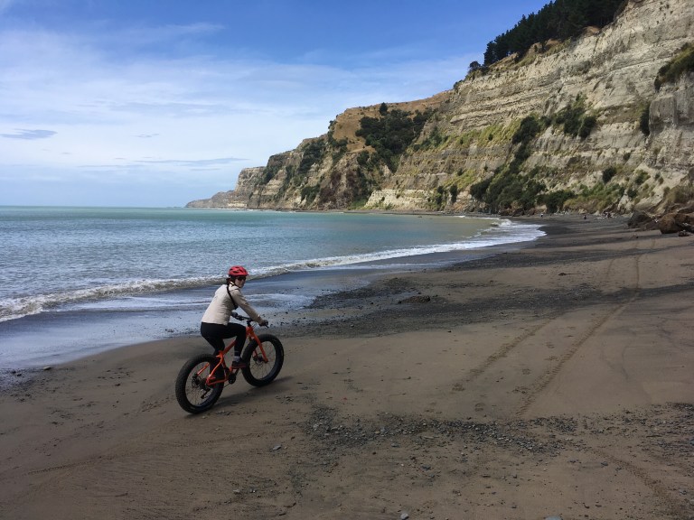 Kotona on jo totuttu ajamaan maastoa fat bikeilla eli läskeillä, joten tottakai sellaiset piti etsiä Uudesta-Seelannistakin. Etsintätyö ei sinänsä ollut helppo, mutta Napierin vierestä Cape Kidnappersilta sellaiset menopelit löytyivät. Gannet Bikes -niminen firma vuokraa läskipyöriä ja antaa kartan käteen, jonka avulla voi suunnata rantaviivaa pitkin kohti suulayhdyskuntaa (gannet englanniksi). Ne joista tuntuu siltä, että pyöräily vuoroveden äärellä ja välillä keskellä on hieman liikaa vaadittu, pääsevät saman matkan traktorin peräkärryllä. Suurin osa jostain syystä valitsi traktorivaihtoehdon… Meidän lisäksi vain yksi pariskunta lähti läskeillä kohti lintuyhdyskuntaa.