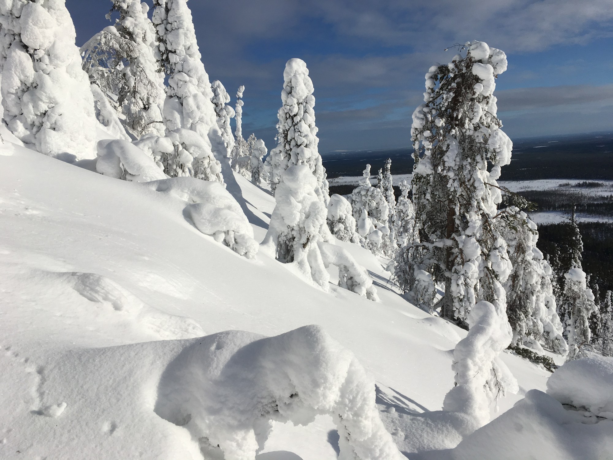 Söimme jälleen pikaisesti eväitä laskumme jälkeen ja suuntasimme ylöspäin tällä kertaa Noitatunturin ja Laakakeron välimaastosta hieman loivempaa reittiä. Emme nousseet toista kertaa aivan Noitatunturin huipulle vaan kohtaan josta alkoi mukava pehmeän lumen alue. Tämän hienon, mutta lyhyen pätkän jälkeen lumi oli hetken hieman vaikeampaa kunnes saavutimme puurajan ja saimme jälleen laskea aivan omia linjojamme pumpulisessa upeassa lumessa.