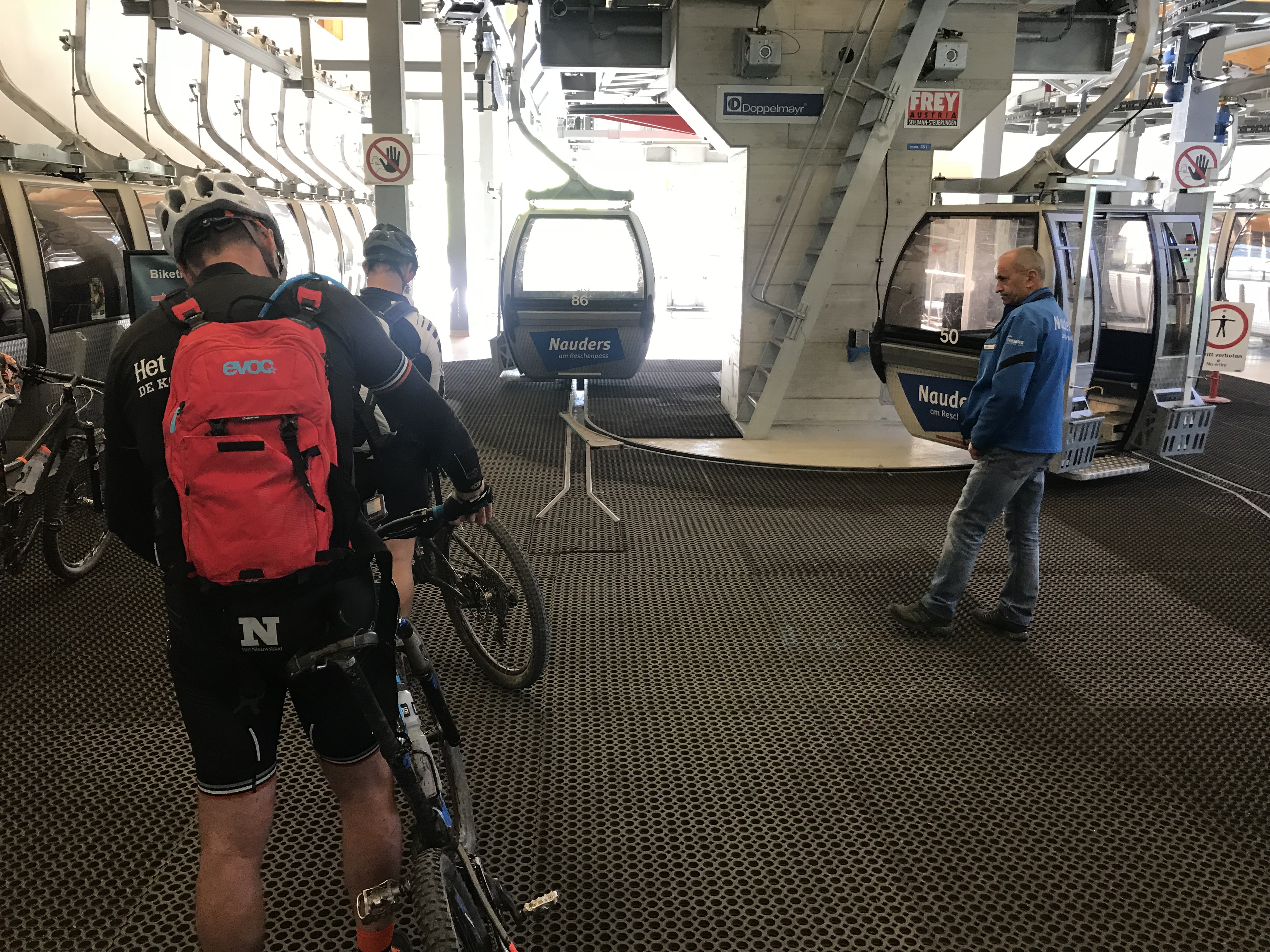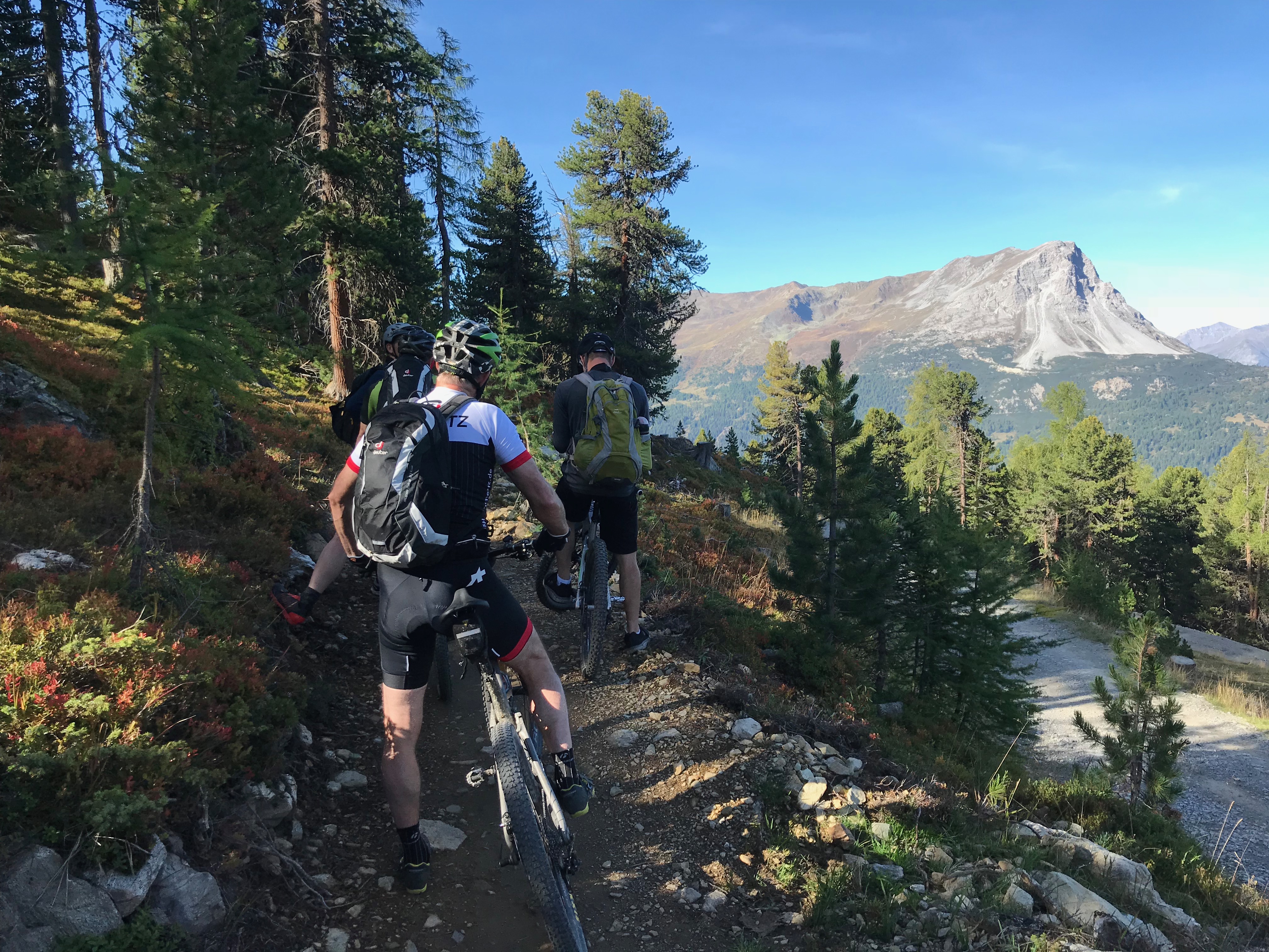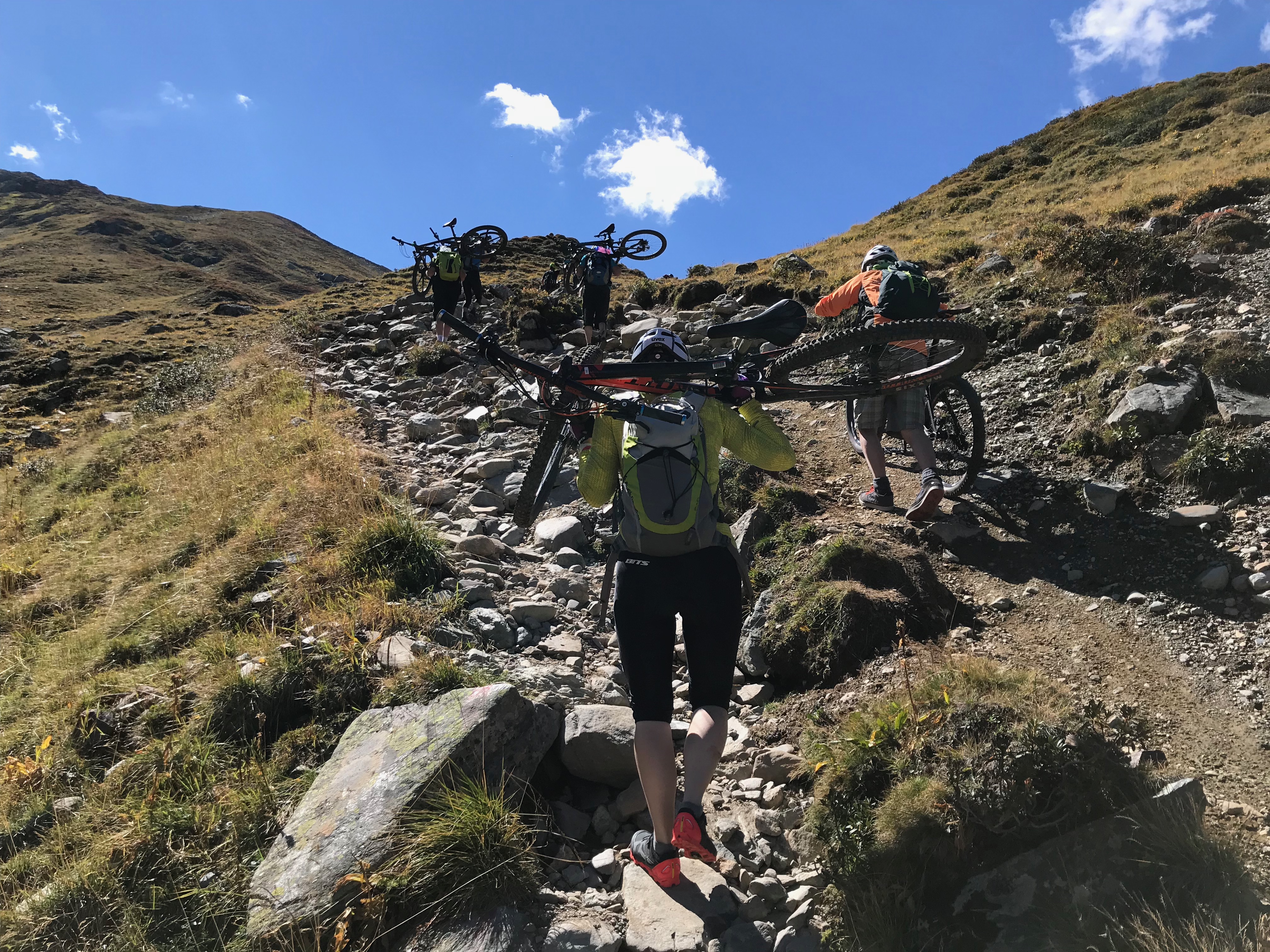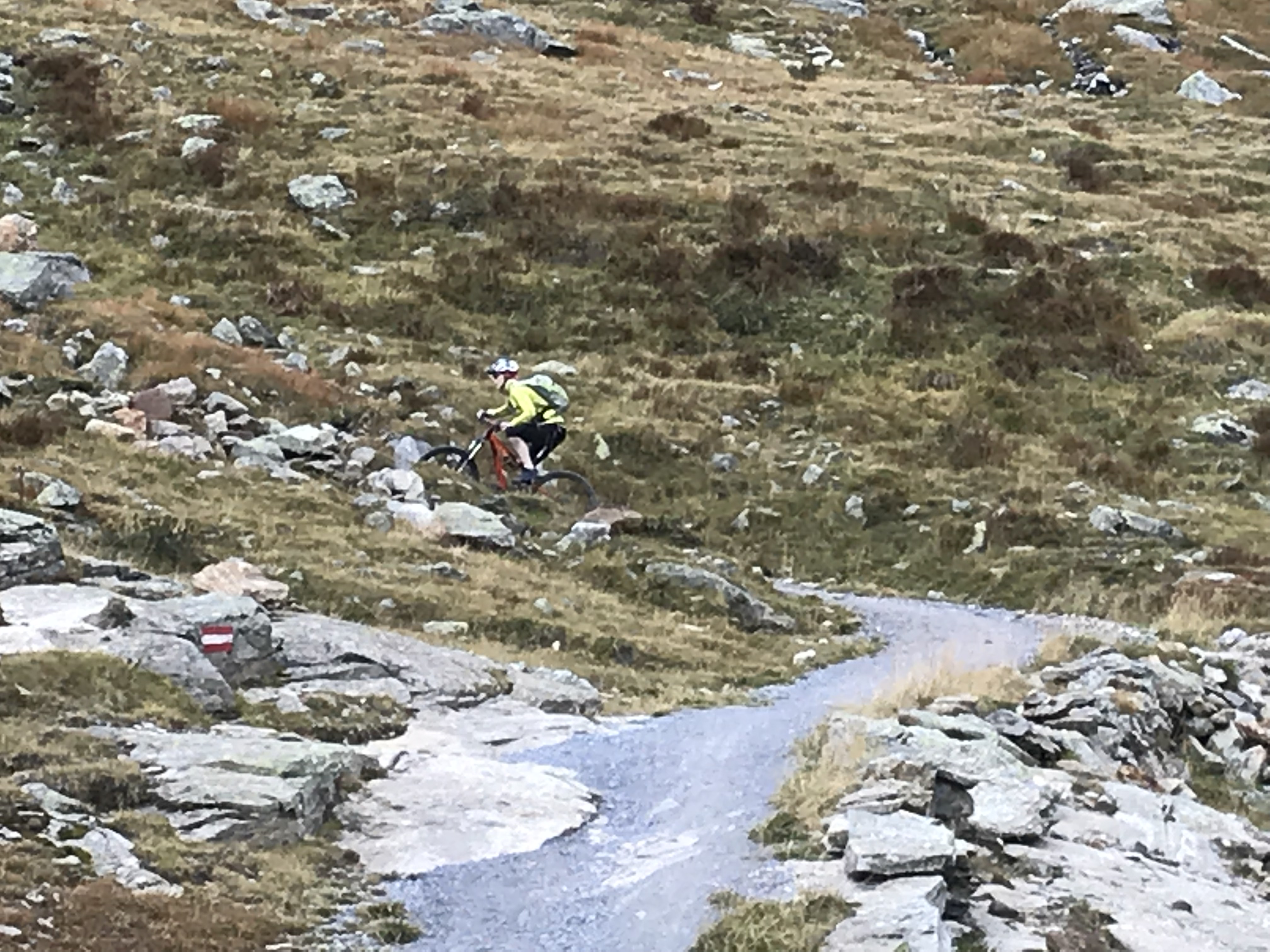 The second day started easier. We took lift up and started with nice flow trails down through alpine meadows against valley. Unfortunately I started to feel symptoms of Päivi’s flu, which was not a surprise. However, the second day was still strong for me. As said, the downhill was very beautiful! We came down an excellent flow trails kilometer after kilometer. I took one ”smooth falling” in one grassy curve, where I had a bit too tight line. After a long downhill and lunch we still had a relatively big uphill where I decided to test little bit my speed, partly because I felt that I am catching a cold and coming days might be not so strong for me. Maybe I was too eager and started absolutely too fast. Soon I noticed it, but of course it was a bit too late when lactic acids already made their damages in my muscles. Despite that I survived quite well that uphill. The second day ended in Nauders. Beautiful small village. Päivi had problems with her shoes and she bought new ones, which were luckily perfect! Video summary of the second day can be seen here.