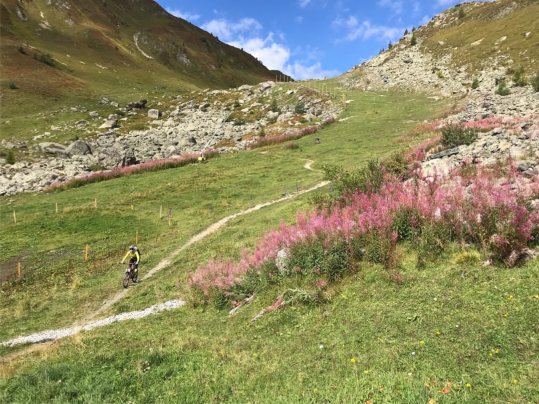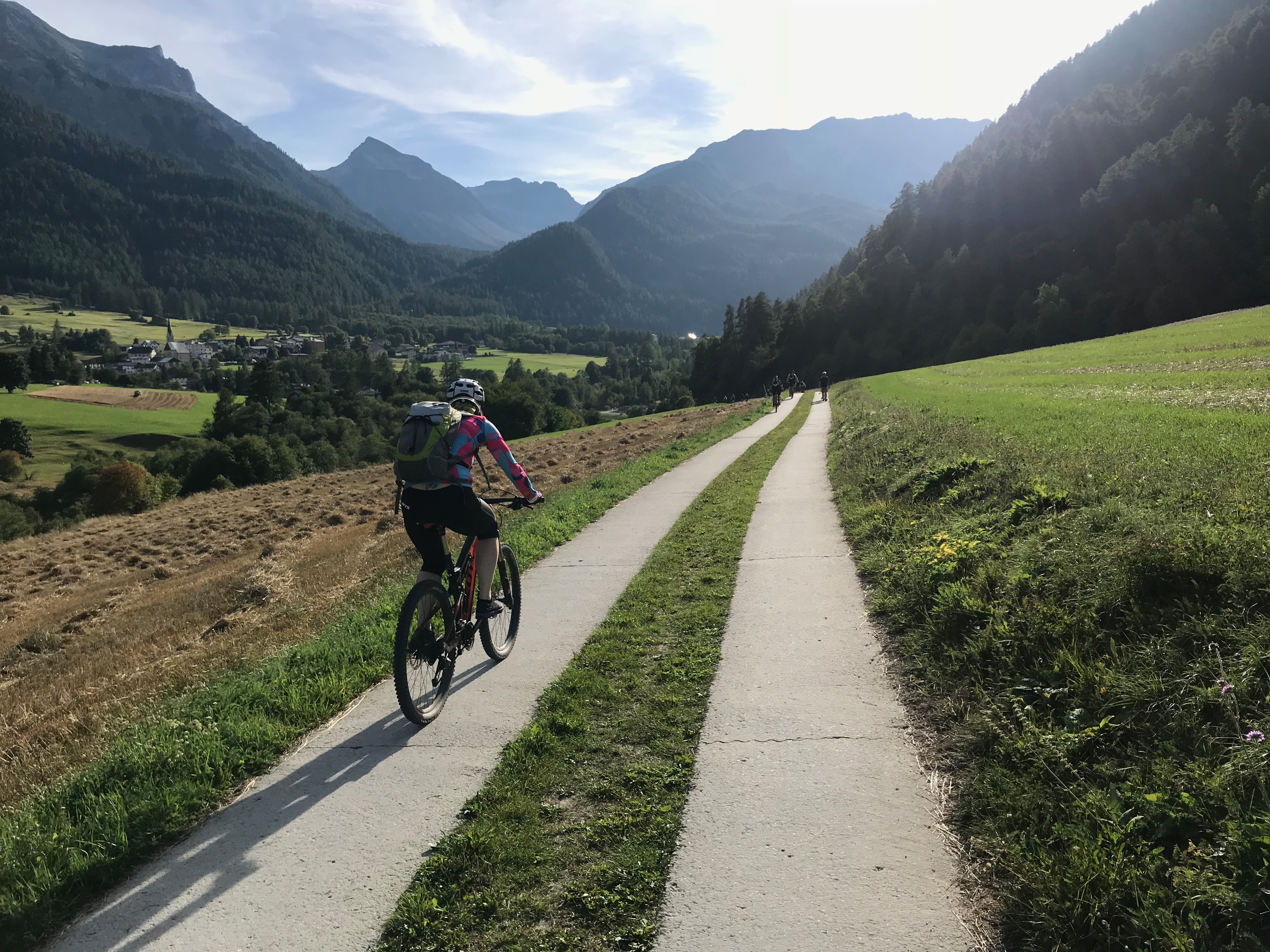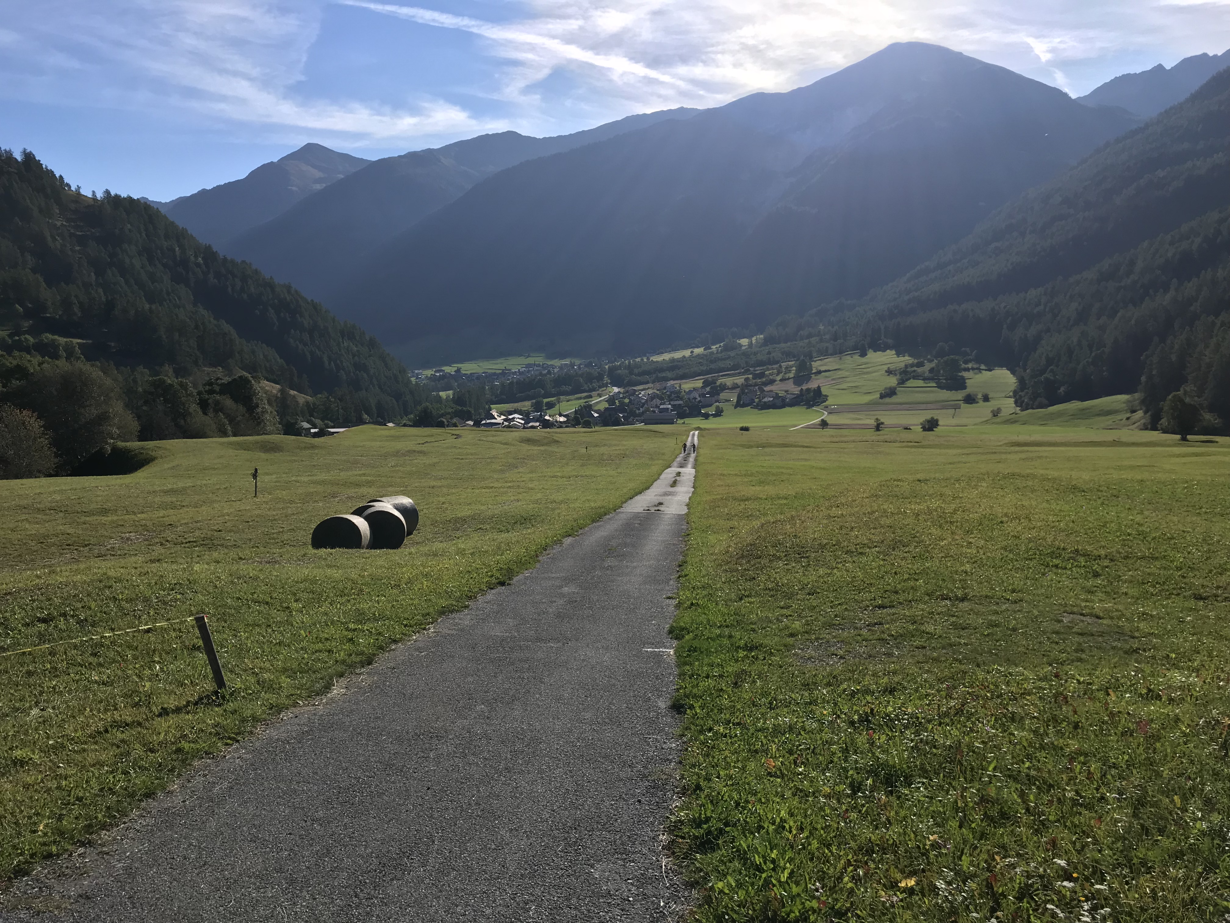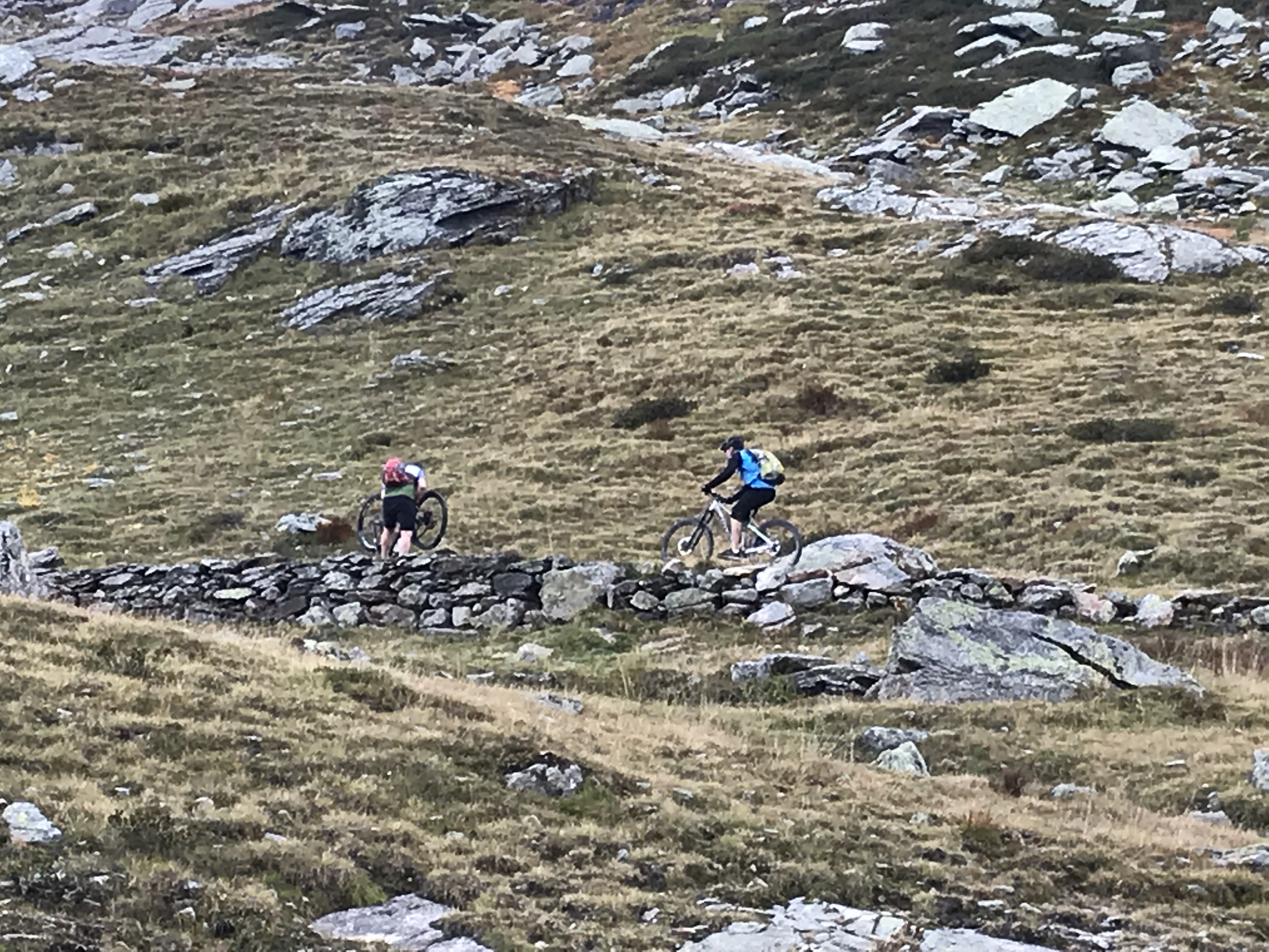 The second day started easier. We took lift up and started with nice flow trails down through alpine meadows against valley. Unfortunately I started to feel symptoms of Päivi’s flu, which was not a surprise. However, the second day was still strong for me. As said, the downhill was very beautiful! We came down an excellent flow trails kilometer after kilometer. I took one ”smooth falling” in one grassy curve, where I had a bit too tight line. After a long downhill and lunch we still had a relatively big uphill where I decided to test little bit my speed, partly because I felt that I am catching a cold and coming days might be not so strong for me. Maybe I was too eager and started absolutely too fast. Soon I noticed it, but of course it was a bit too late when lactic acids already made their damages in my muscles. Despite that I survived quite well that uphill. The second day ended in Nauders. Beautiful small village. Päivi had problems with her shoes and she bought new ones, which were luckily perfect! Video summary of the second day can be seen here.