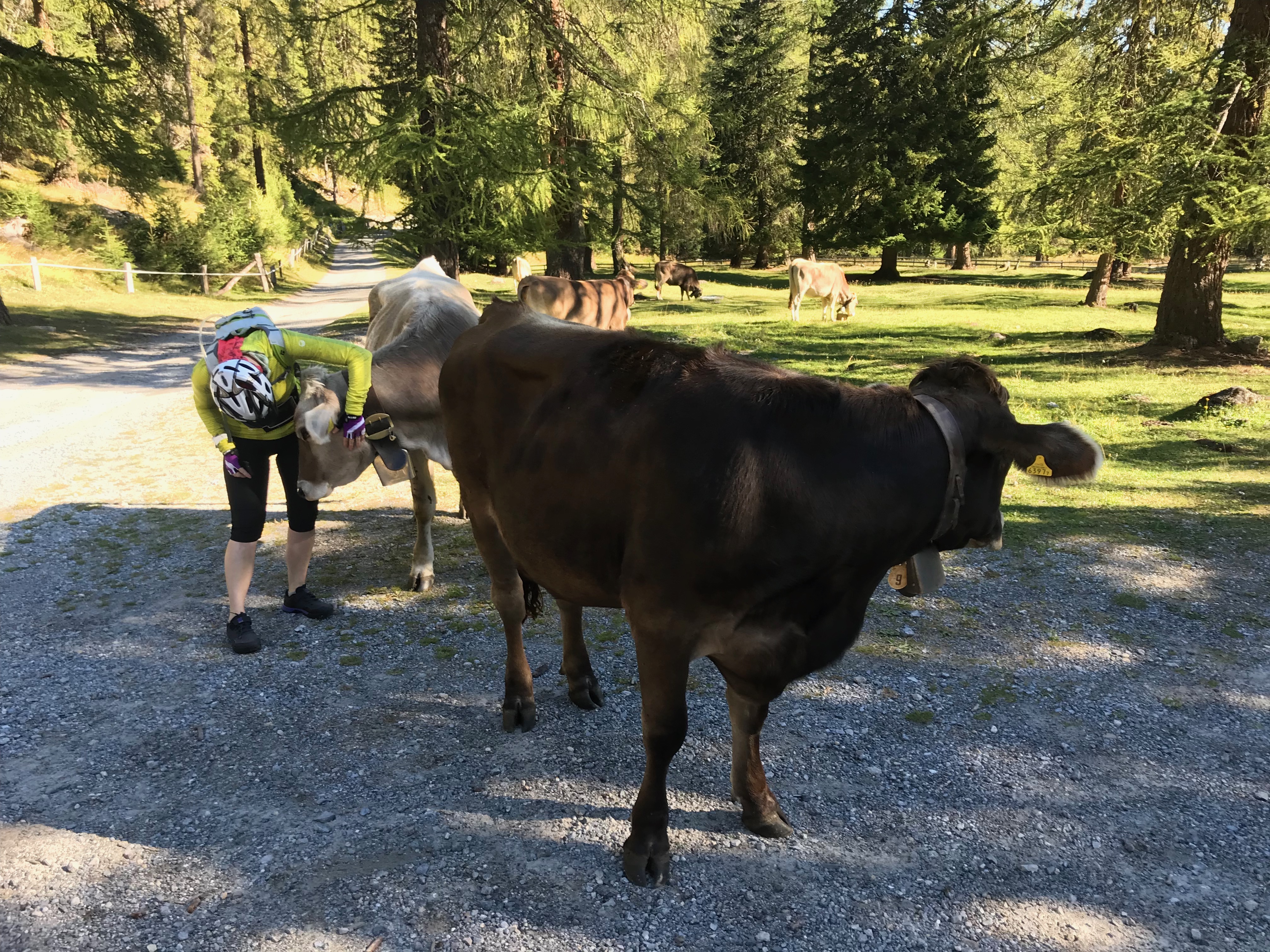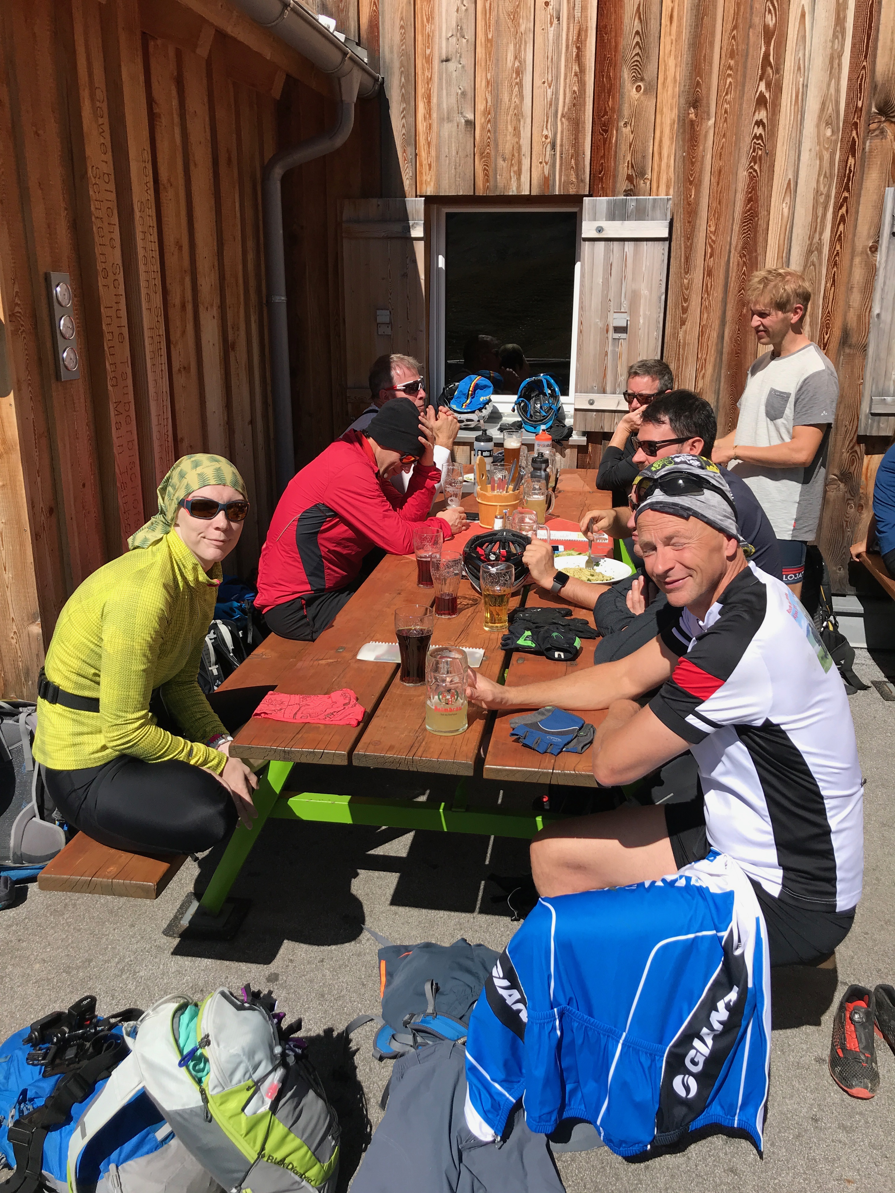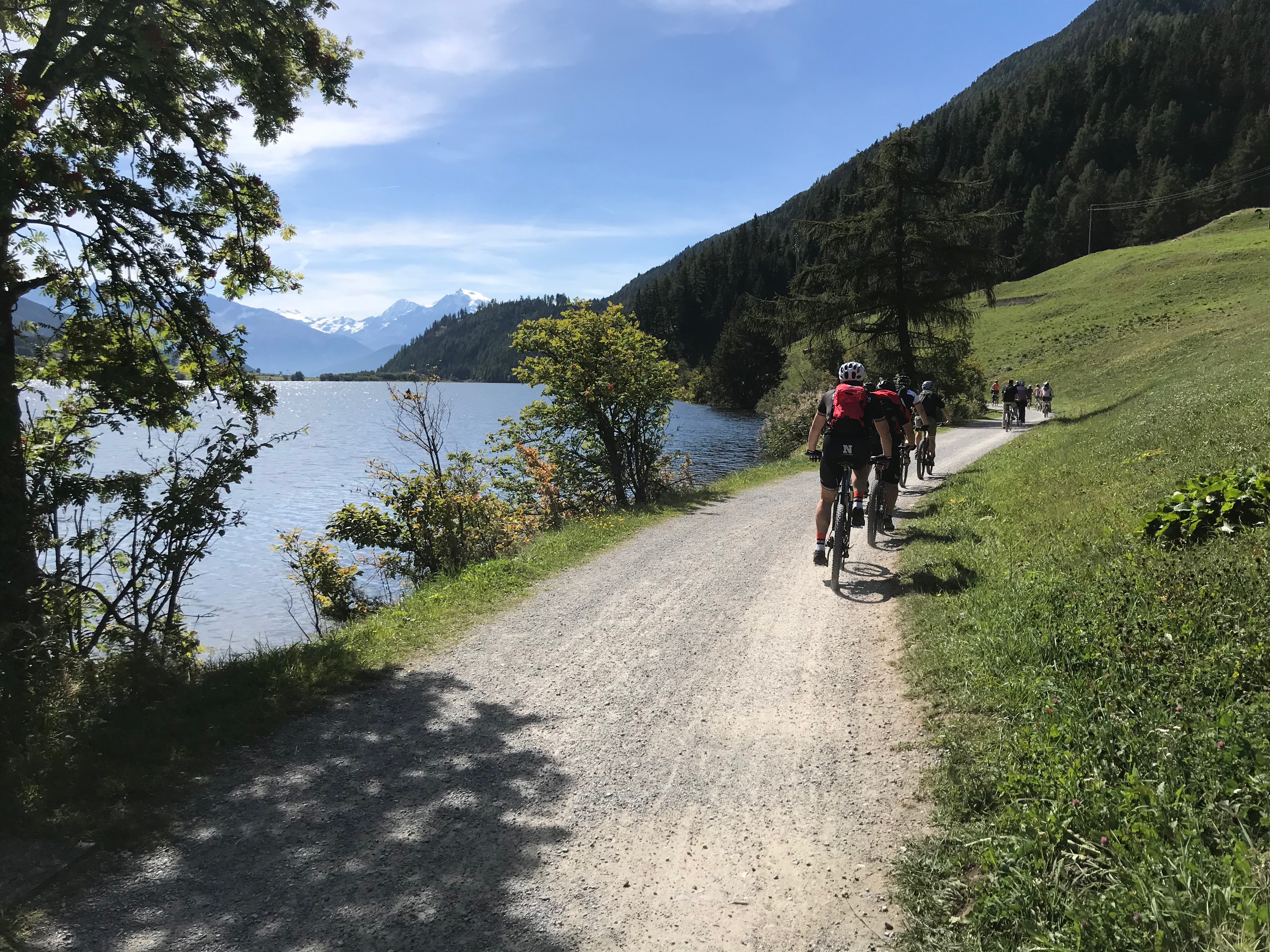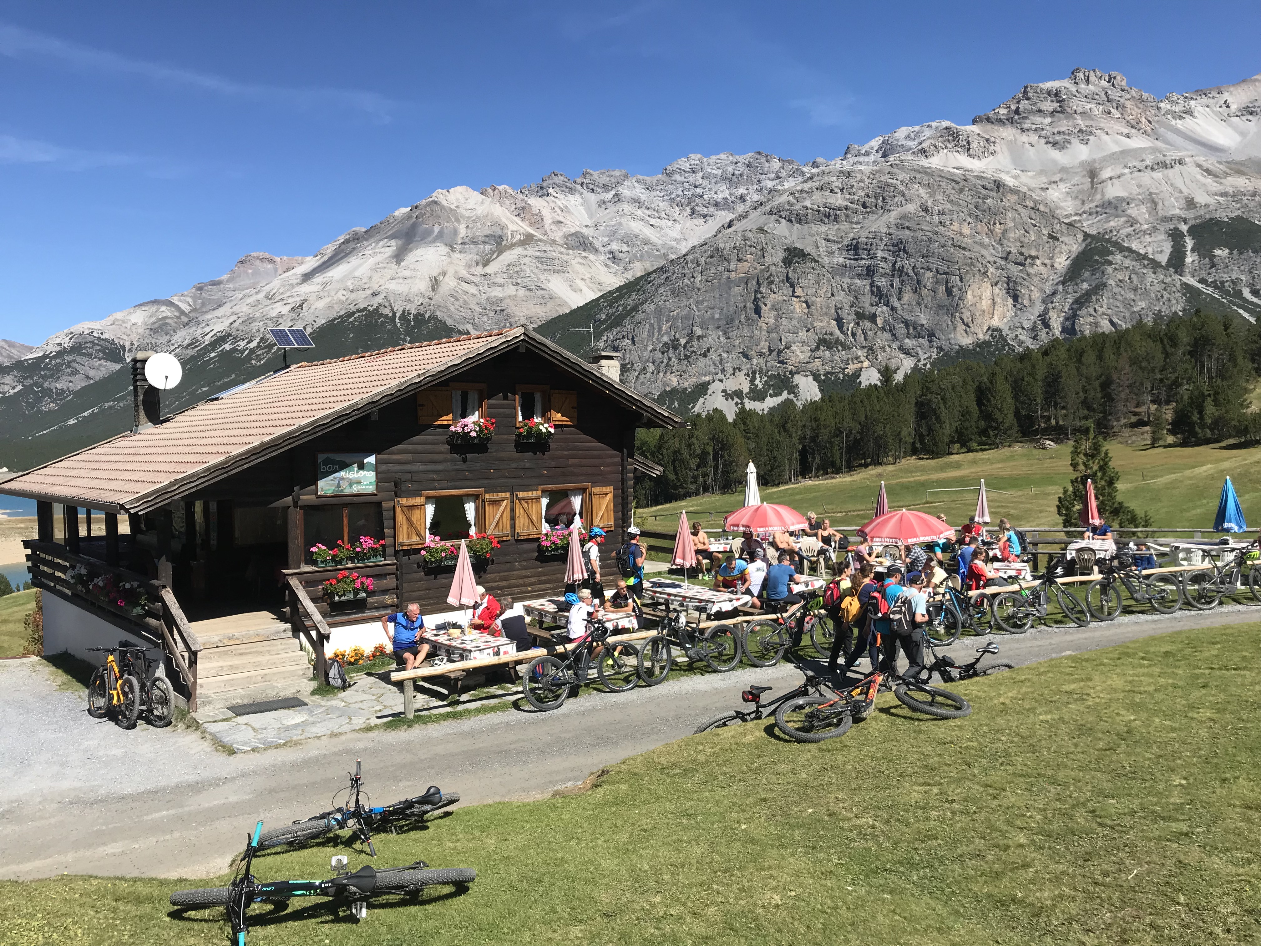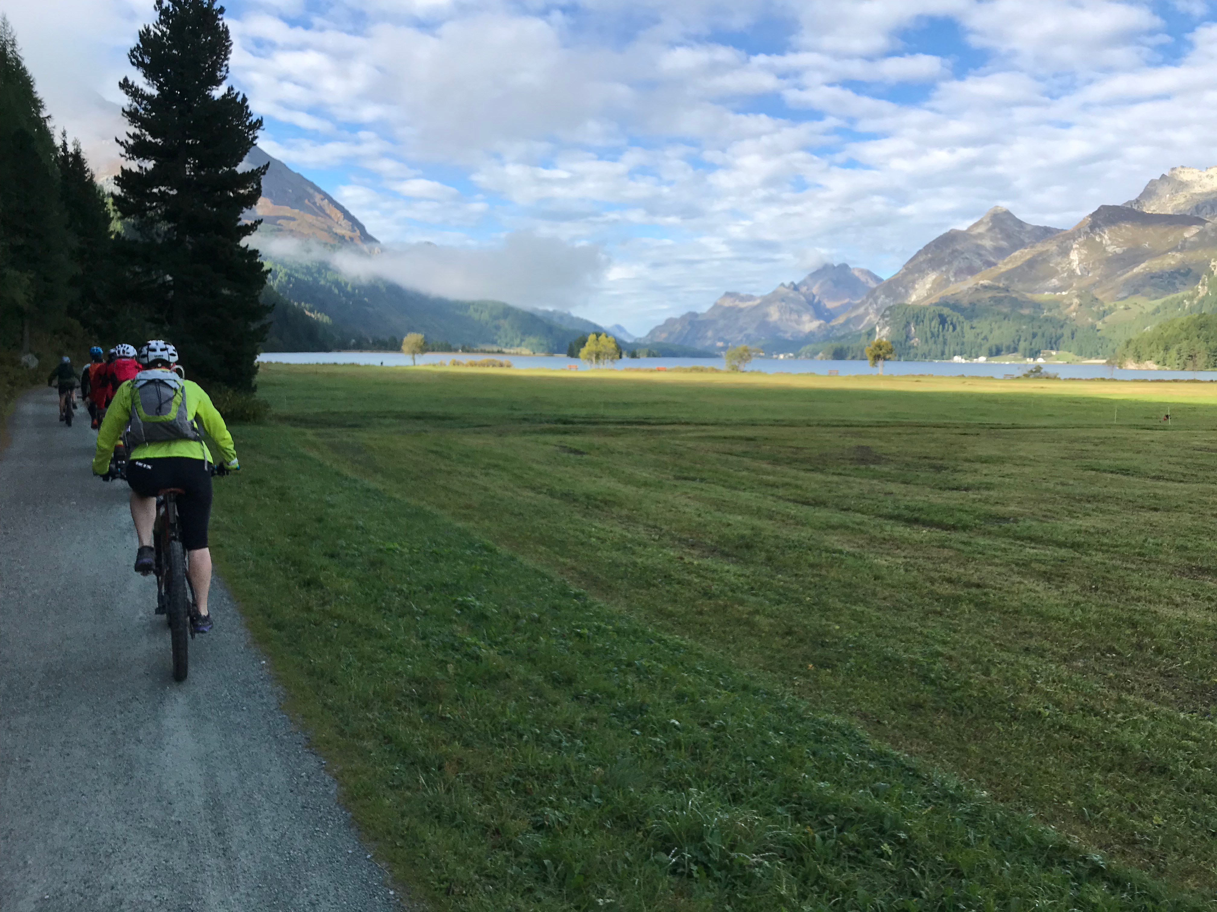 The fifth day was a real mountain day! We started on easy roads, starting to get slightly upwards. After 2-3 hours of climbing we reached a steep serpentine uphill. The one which any client had never managed to top without breaks. This fact didn’t change this time. After the climb we had a coffee break and after that we continued ascending on narrow mountain trails. Päivi had again a good day and she was doing very well! I, in contrast, felt that I had totally forgot how to ride a bike…but neverthless ascend ended and we started long and very enjoyable downhill towards our lunch break. Just before the lunch we had probably the best downhill during whole week, very enjoyable flowtrail in the middle of a beautiful mountain forest! Our lunch stop was in tradional Swiss mountain hut where we got tasty hams, salamis and cheeses with bread as well as deserts from each Swiss canton. Tasty! Soon after the lunch we got the only rain during the whole week. When we arrived to Sils, we were fully wet. Laundry service and warm shower were very welcome this evening! However, one surprise was still left. During our dinner we had a priviledge to listen really high class music! Short example can be listened and seen here in a summary video of day 5.