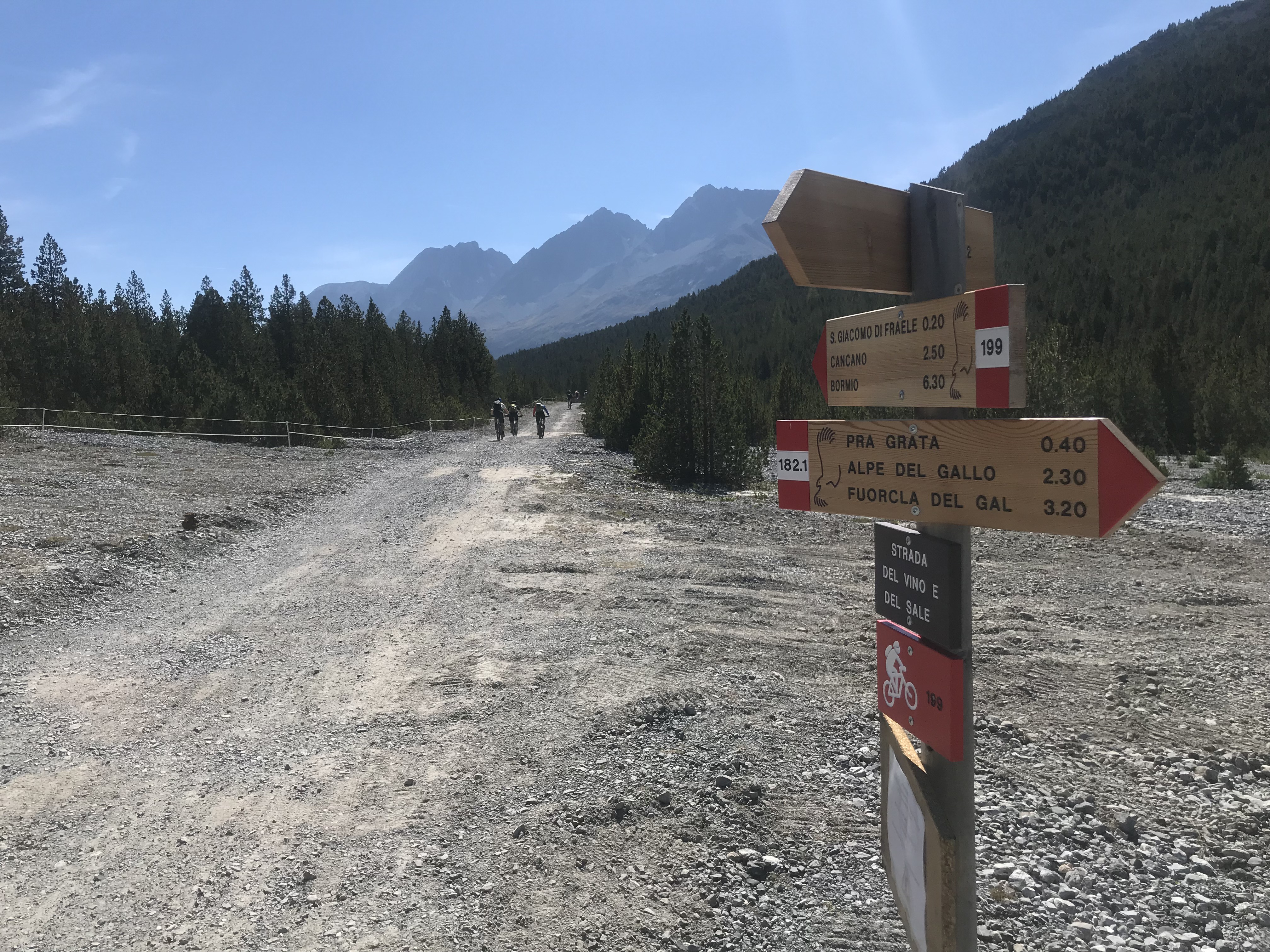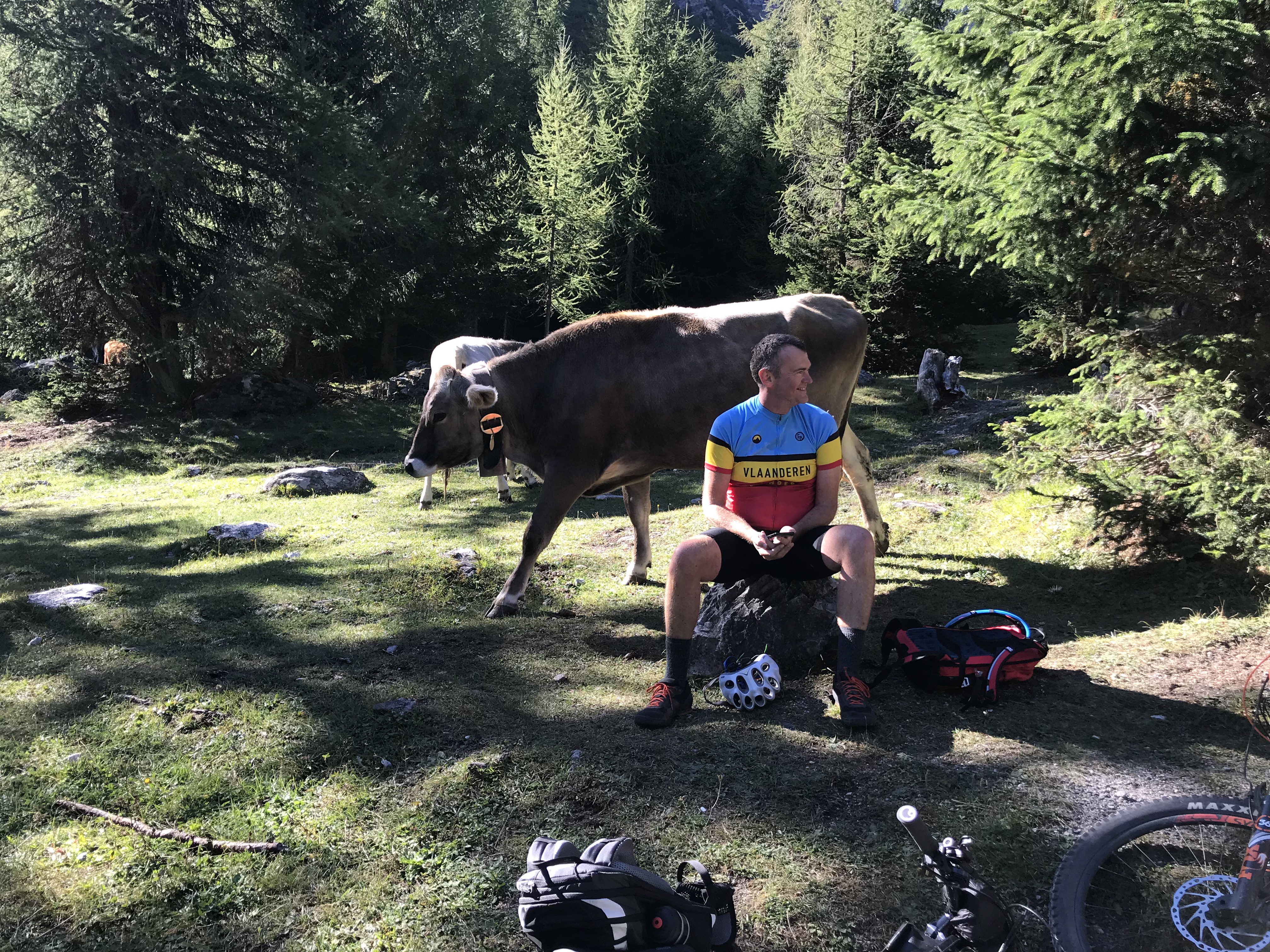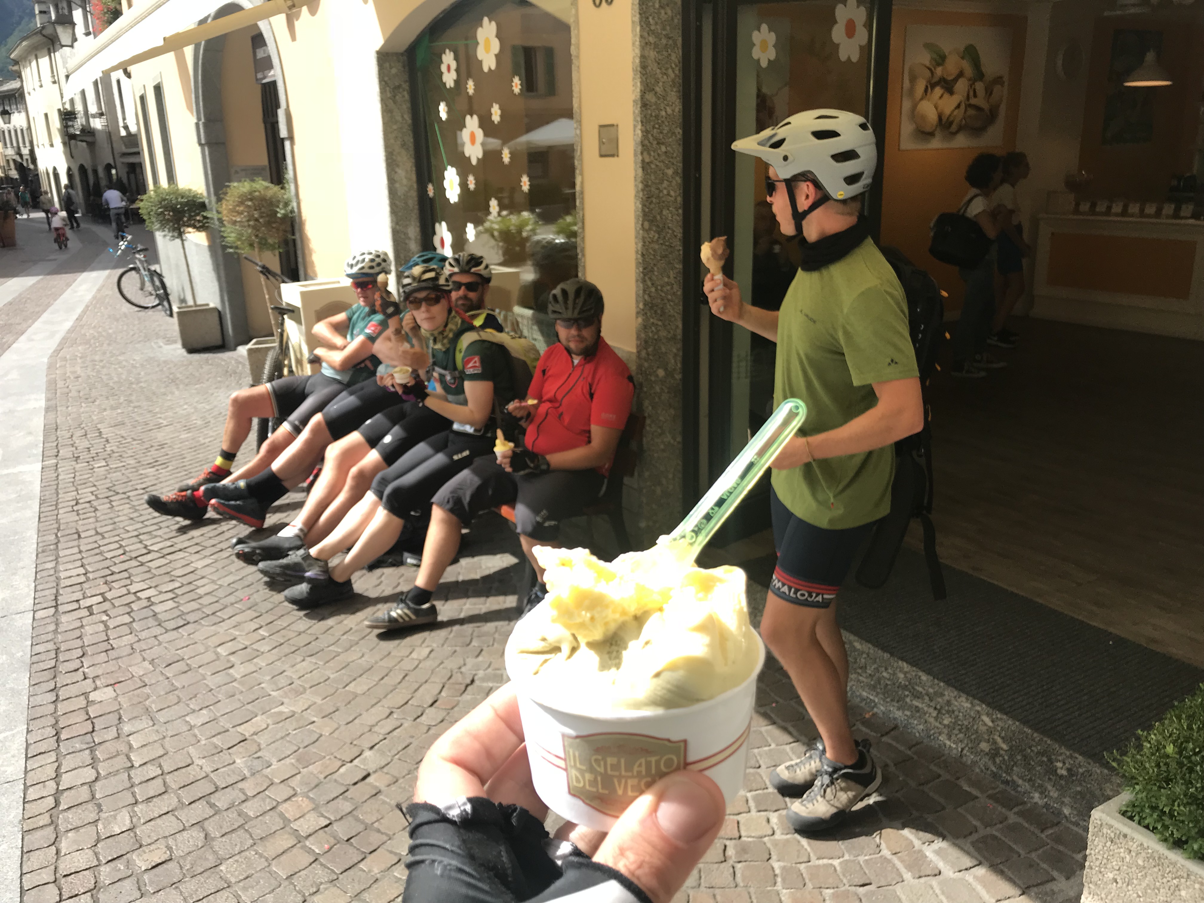 The day four started with huge uphill. We ascended through endless mountain forest until we were in the middle of the uphill having brake with friendly cows. So, then we continued another endless part of the uphill. But this was the first day when Päivi started to get healthy again and unluckily I started to get sick. As a result of this Päivi was finally climbing faster than me and some other members of the group…but nevermind, the landscape was so beautiful that it was easy to forget stress and fatigue of the endless uphill! And if the uphill was beautiful, following downhill was even more beautiful. We came down rocky narrow trails following small blue river in the middle of a deep green mediterranean forest! Unluckily, memory card of my action camera was full after this downhill and when I tried to empty it during the lunch, I accidentally destroyed just the videos from that downhill. Awful disaster! Anyway, we had a lunch in a nice mountain hut, which was located next to very beautiful lake. After the lunch we had another big uphill and after that we came down to the valley through the mountain forest on slippy gravel road. Our next overnight was in Livigno. So we got some gelato, Italian ice-cream! Video summary of the fourth day can be seen here.