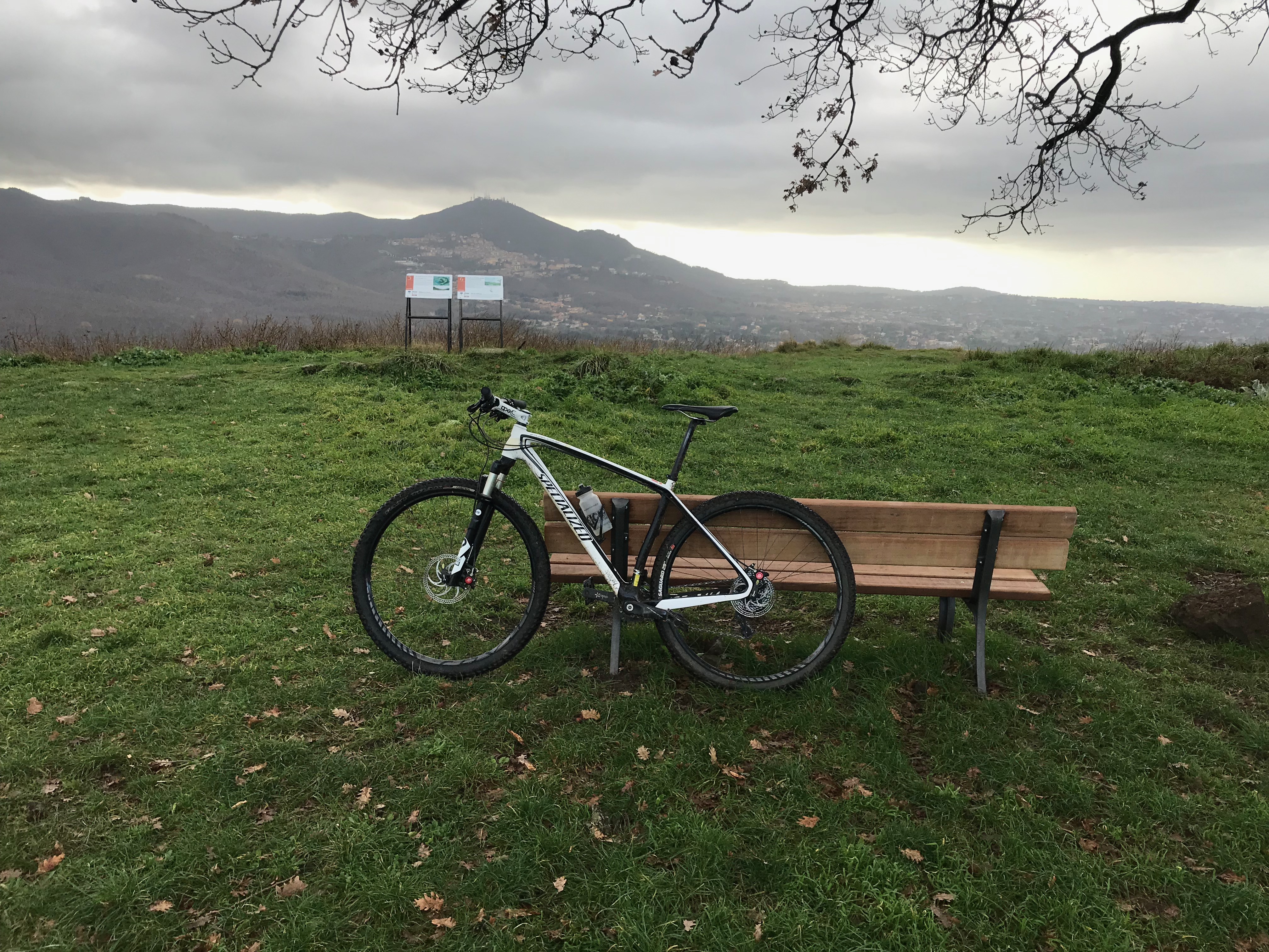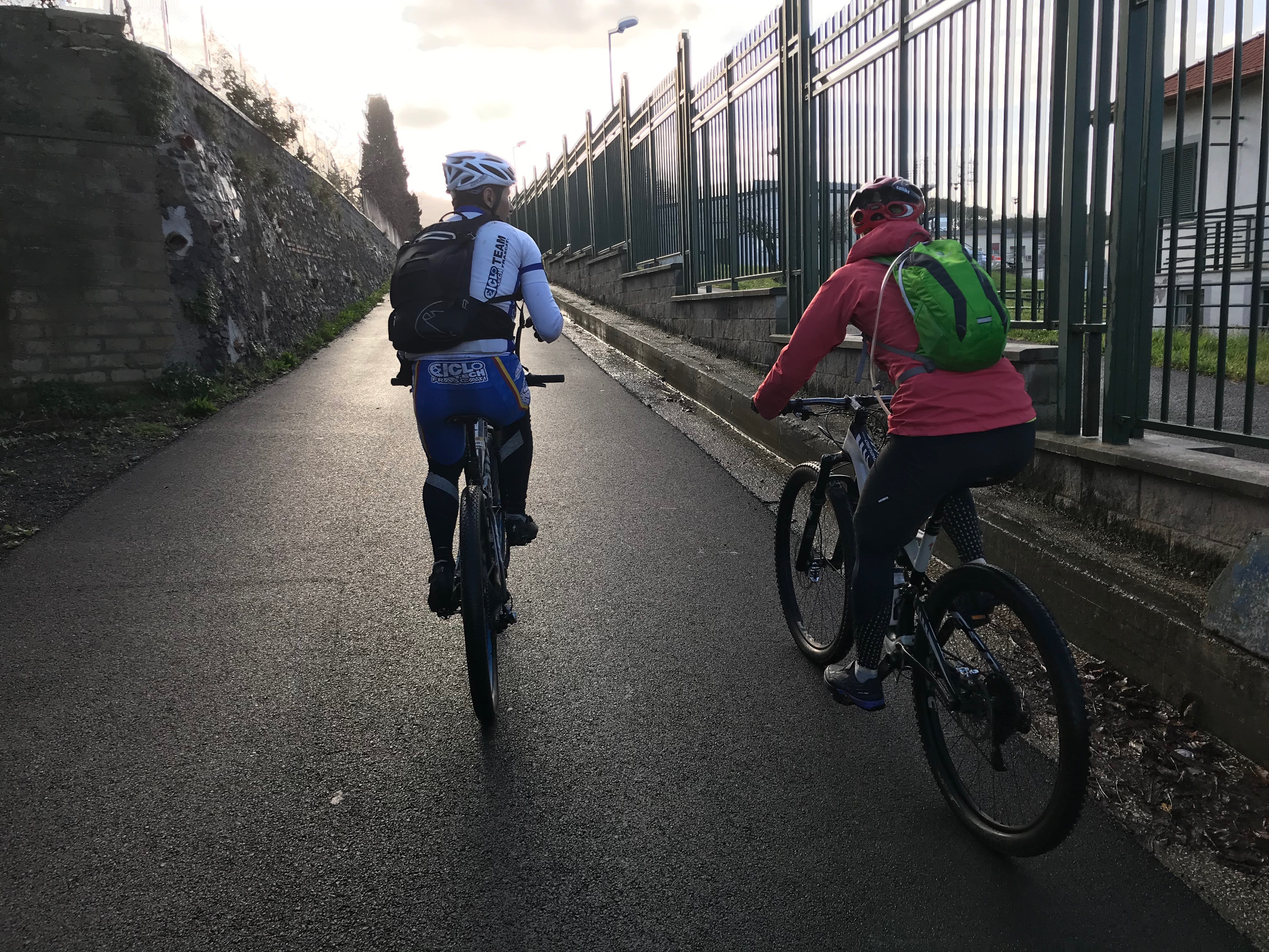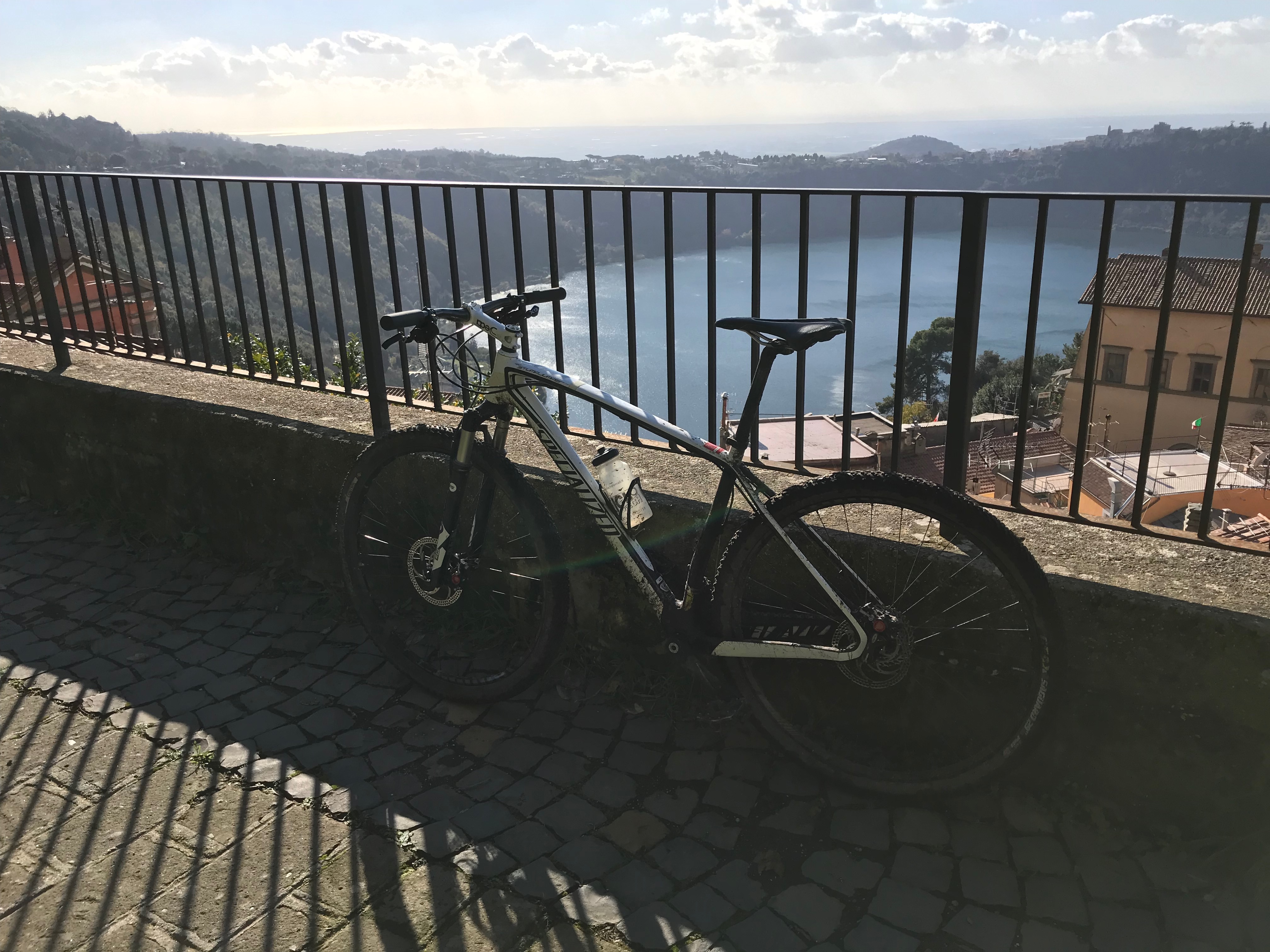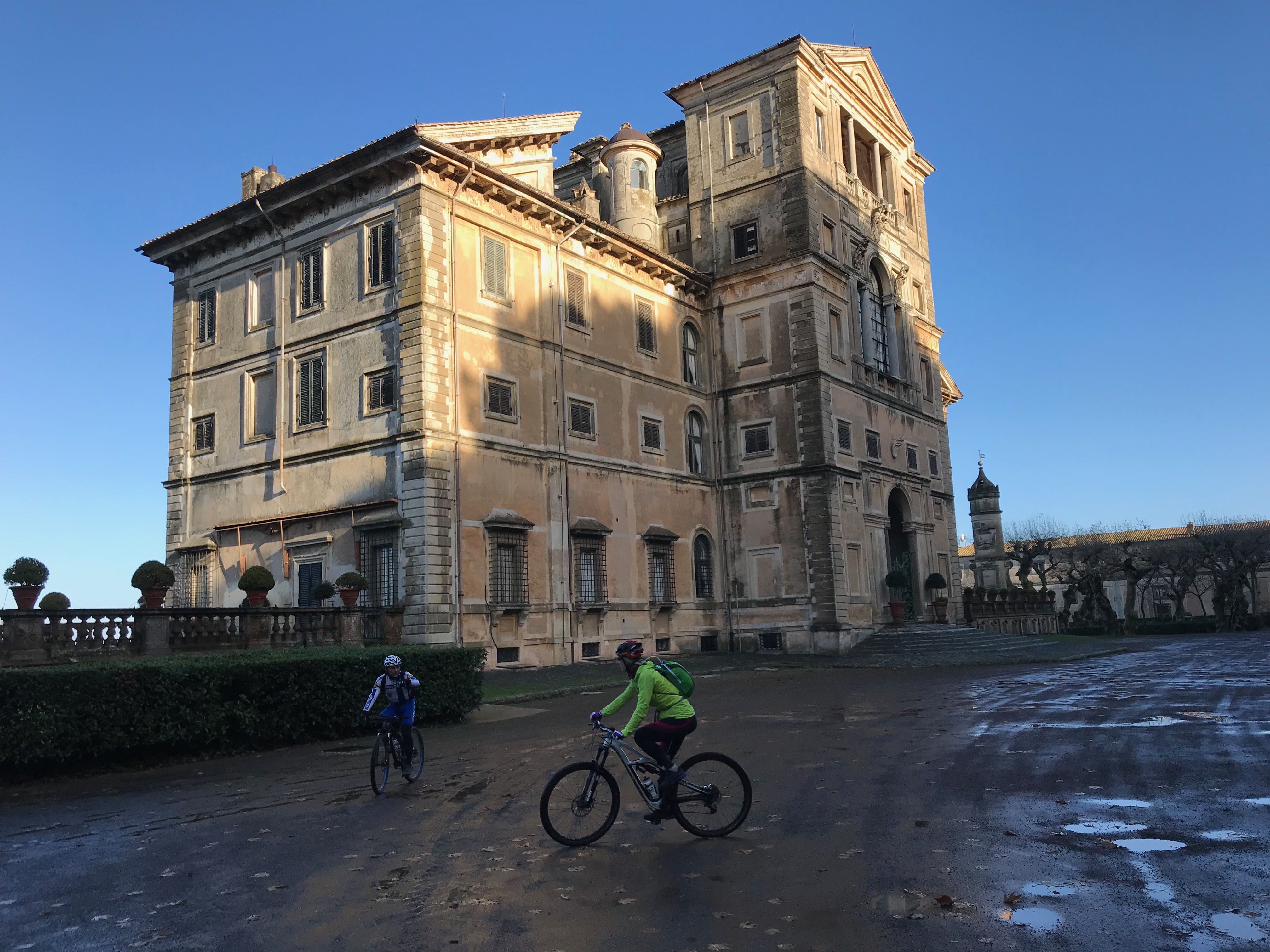 Kun pyörät oli valittu, lähdimme polkemaan. Ylämäkeen tottakai. Ensin kapusimme asfalttia pitkin Frascatiin, josta muutamien keskiaikaisten kivikatujen ja portaiden kautta pääsimme maastoon ja jatkoimme ylämäkeen. Jotenkin tuntui, että poljimme koko päivän ylämäkeen. Välillä oli lyhyehköjä laskuja ja sitten taas jatkui ylämäki. Tuli mieleen, että miten on mahdollista polkea koko ajan ylöspäin, kun teimme kuitenkin lenkin? No maasto oli joka tapauksessa mukavaa. Heti aluksi pysähdyimme yhdelle alueen nähtävyyksistä, Villa Aldombrandinille, joka on todella komea vanha huvila upealla sijainnilla. Villan pihalta on suorastaan mykistävät maisemat kohti Roomaa. Hetken valokuvailun jälkeen jatkoimme matkaa ja pian saimme polkea ikivanhaa roomalaista tietä. Wow! Vanhaa tietä polkeminen oli toki upeaa, mutta sateisen yön jäljiltä märät suuret litteät ja sileät kivet olivat todella liukkaita! Ehkä roomalaisten kulkupeleissä oli erilaiset rengasmateriaalit? Roomalaisen tien varrella oli myös vanha roomalainen asumus, mutta juuri siinä kohtaa kumpikaan meistä ei pystynyt pysähtymään, kun kitka oli renkaiden alla sen verran herkällä, joten tarkempi ihailu jäi väliin. Roomalaisen tien lisäksi poljimme pääosin erilaisia polkuja. Välillä metsissä ja välillä niityillä ja viiniviljelmien reunoilla. Näimme matkalla myös ratsastajia, jotka olivat liikkeellä varsin komeilla hevosilla. Seutu on suosittua paitsi maastopyöräilijöiden niin myös ratsastajien keskuudessa ja ilman konflikteja ei täälläkään kuulemma aina selvitä. No sellaista se tuppaa olemaan vähän joka paikassa. Nousua tosiaan riitti, mutta mitään teknisesti liian vaikeaa ei ollut. Minun kevyt etujousto oli mainio peli meidän reitillä. Matkan aikana pysähdyimme yhden kerran espressoille ja puolessa välissä Nemin pikkukaupungissa pidimme lounastauon.