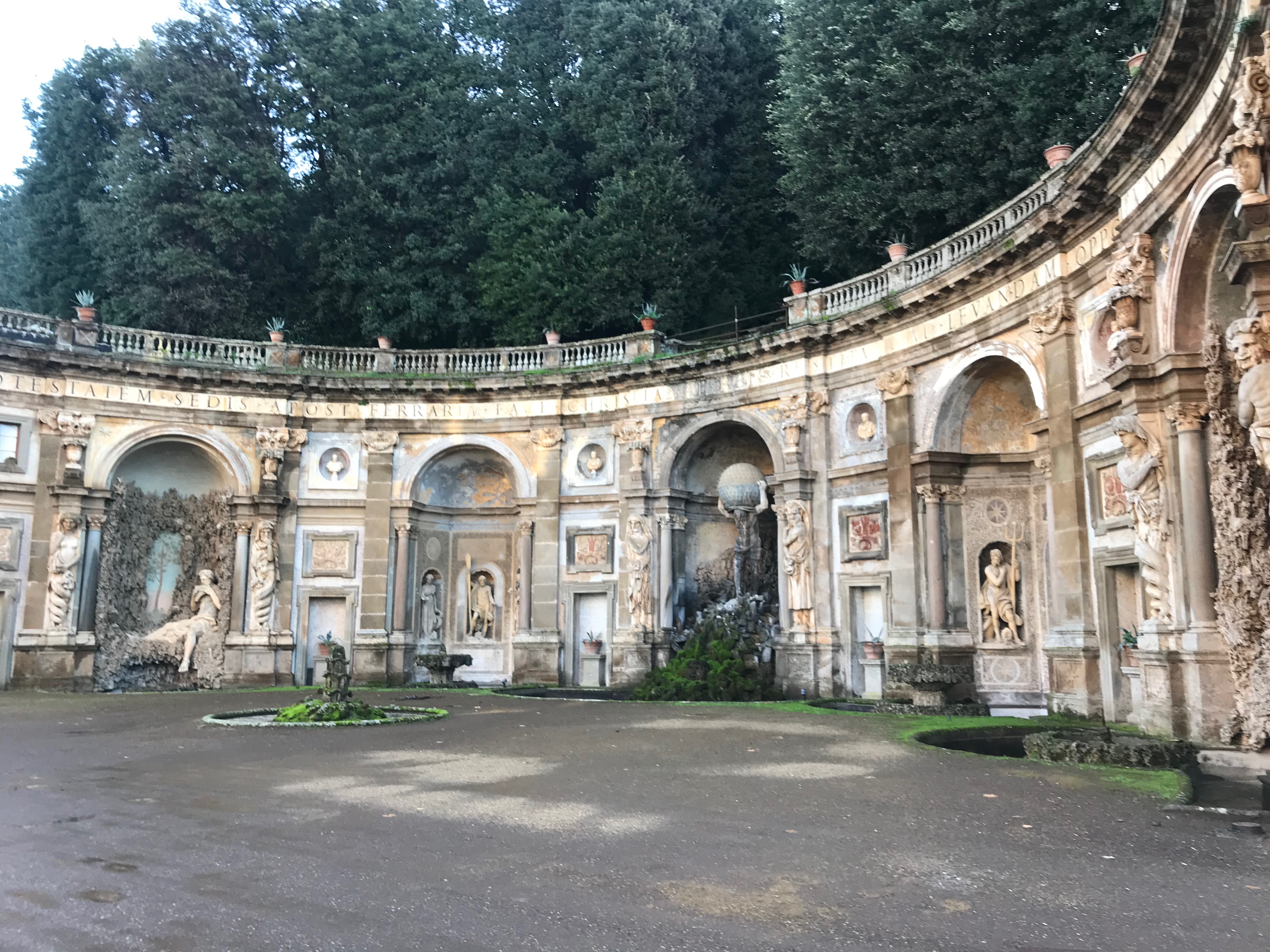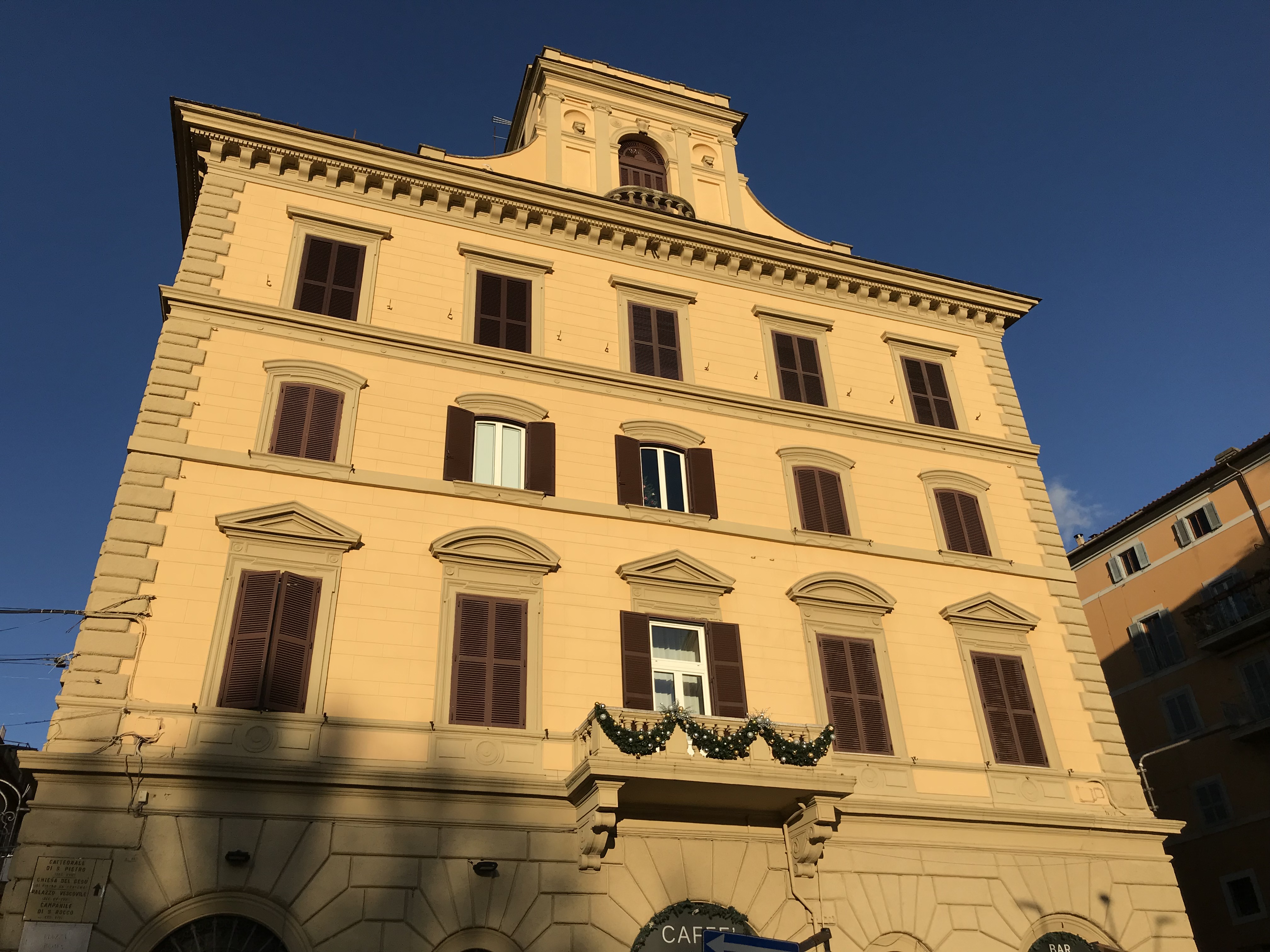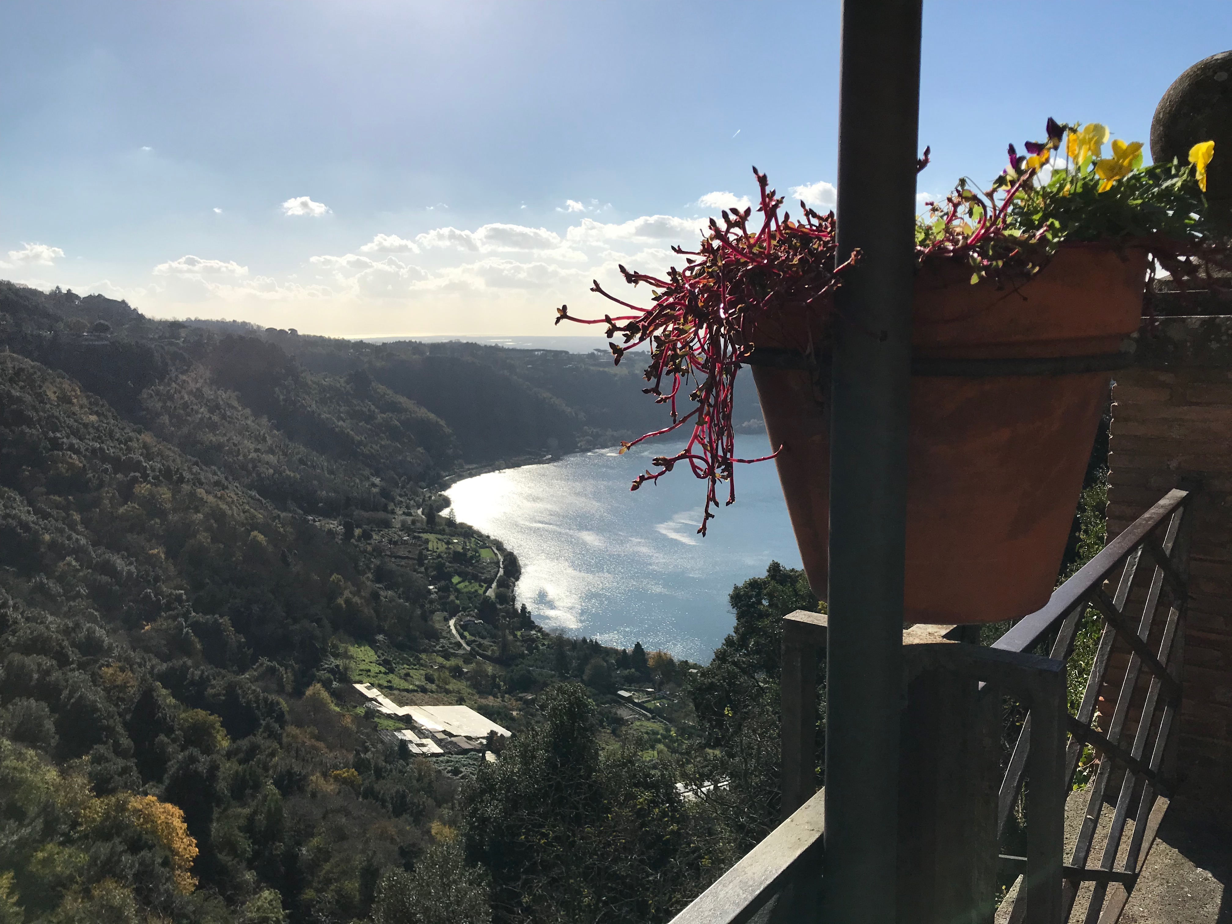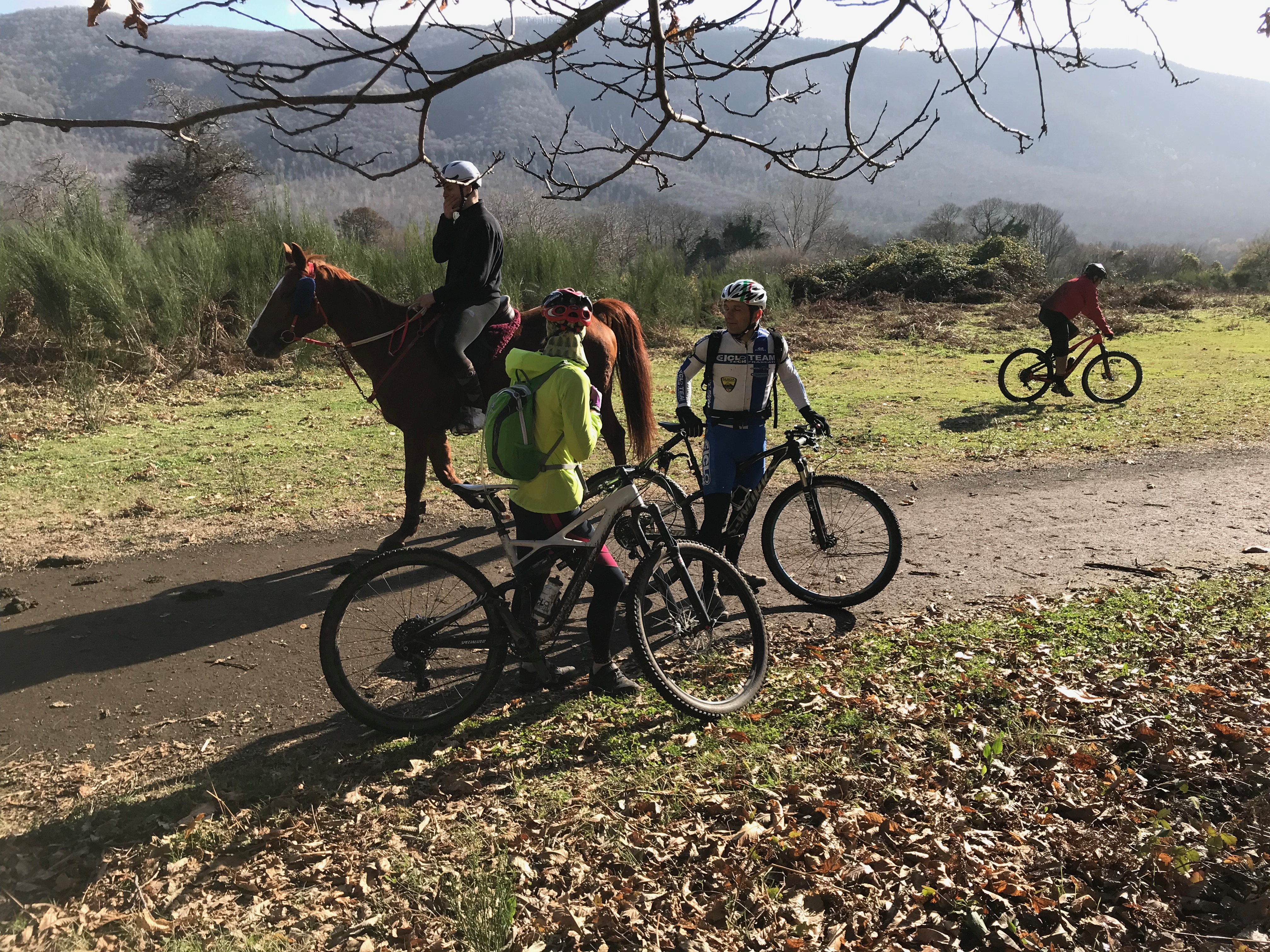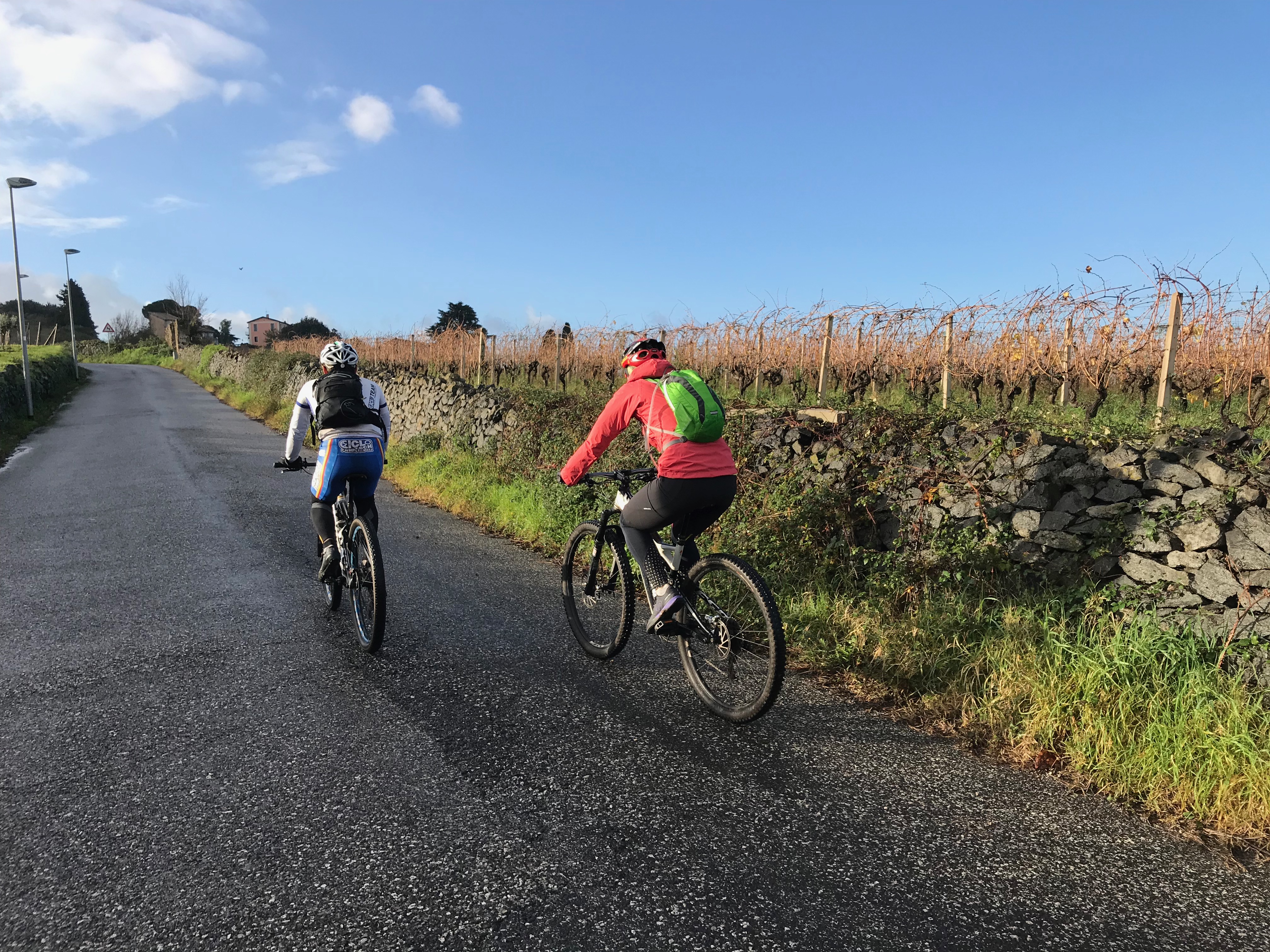 Kun pyörät oli valittu, lähdimme polkemaan. Ylämäkeen tottakai. Ensin kapusimme asfalttia pitkin Frascatiin, josta muutamien keskiaikaisten kivikatujen ja portaiden kautta pääsimme maastoon ja jatkoimme ylämäkeen. Jotenkin tuntui, että poljimme koko päivän ylämäkeen. Välillä oli lyhyehköjä laskuja ja sitten taas jatkui ylämäki. Tuli mieleen, että miten on mahdollista polkea koko ajan ylöspäin, kun teimme kuitenkin lenkin? No maasto oli joka tapauksessa mukavaa. Heti aluksi pysähdyimme yhdelle alueen nähtävyyksistä, Villa Aldombrandinille, joka on todella komea vanha huvila upealla sijainnilla. Villan pihalta on suorastaan mykistävät maisemat kohti Roomaa. Hetken valokuvailun jälkeen jatkoimme matkaa ja pian saimme polkea ikivanhaa roomalaista tietä. Wow! Vanhaa tietä polkeminen oli toki upeaa, mutta sateisen yön jäljiltä märät suuret litteät ja sileät kivet olivat todella liukkaita! Ehkä roomalaisten kulkupeleissä oli erilaiset rengasmateriaalit? Roomalaisen tien varrella oli myös vanha roomalainen asumus, mutta juuri siinä kohtaa kumpikaan meistä ei pystynyt pysähtymään, kun kitka oli renkaiden alla sen verran herkällä, joten tarkempi ihailu jäi väliin. Roomalaisen tien lisäksi poljimme pääosin erilaisia polkuja. Välillä metsissä ja välillä niityillä ja viiniviljelmien reunoilla. Näimme matkalla myös ratsastajia, jotka olivat liikkeellä varsin komeilla hevosilla. Seutu on suosittua paitsi maastopyöräilijöiden niin myös ratsastajien keskuudessa ja ilman konflikteja ei täälläkään kuulemma aina selvitä. No sellaista se tuppaa olemaan vähän joka paikassa. Nousua tosiaan riitti, mutta mitään teknisesti liian vaikeaa ei ollut. Minun kevyt etujousto oli mainio peli meidän reitillä. Matkan aikana pysähdyimme yhden kerran espressoille ja puolessa välissä Nemin pikkukaupungissa pidimme lounastauon.