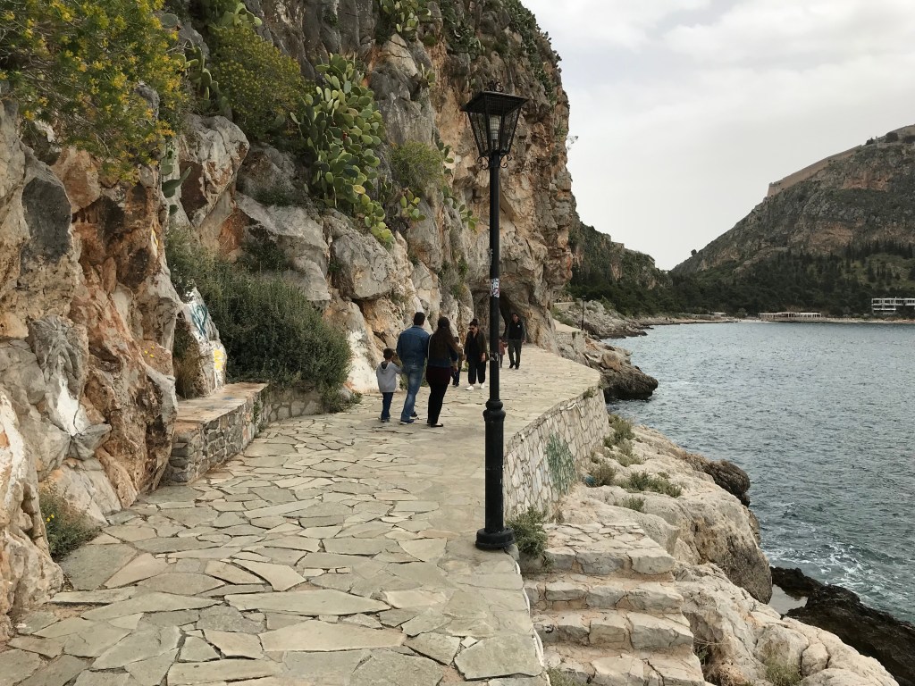 Nafplion lähellä on ihan mukavasti kiivettävää. Meidän koko Kreikkaa käsittelevässä topossa esitellään viisi eri kalliota, joissa kaikilla muilla paitsi Anatolilla, jossa kävimme, oli vielä useampi sektorikin. Vaikeustasoja löytyy näiltä kallioilta nelosista kaseihin. Nafplion kylää lähimpänä olevat kiipeilyreitit lähtevät rantaa pitkin kulkevalta kävelytieltä vain muutaman minuutin kävelymatkan päästä kylältä. Kyseisiä reittejä emme testanneet, mutta kivi näytti laadukkaalta, samoin pulttaus ja reittien profiilit.