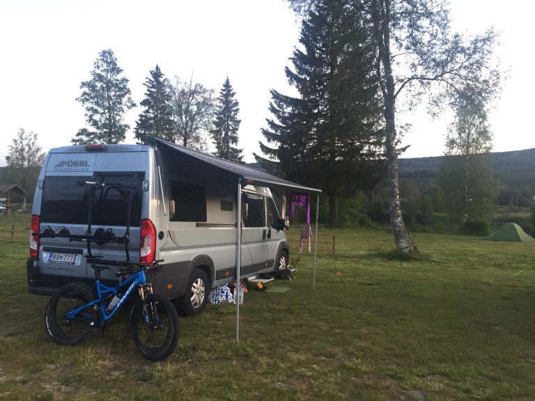 Oppdalissa yövyimme IMI Stolen nimisessä leirikeskuksessa, joka ei ollut varsinainen camping alue mutta tarjosi autopaikan lisäksi karavaanarille kaikki peruspalvelut. Sijainti oli meille hyvä, koska pyörällä pääsi 2km asfalttisiirtymällä lähes suoraan poluille. Pyrimme aina majoittumaan niin, ettei autoa tarvitsisi lenkeille lähtiessä siirtää vaan lapsen kanssa päivää viettävä vanhempi voisi jäädä aamutoimien jälkeen leiriin ilman mitään ylimääräistä säätöä.
