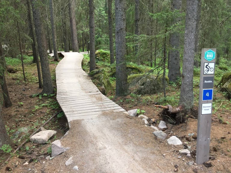 Suhteellisen pienelle alueelle on rakennettu kymmeniä kilometrejä laadukasta polkuverkostoa, josta löytyy reittejä neljälle eri tasolle (vihreä, sininen, punainen ja musta). Itselleni sininen taso oli juuri sopivan vaikeaa, ja vihreä toimi myös kivasti vauhdikkaampaan ajoon. Punaista olisi ollut hauska kokeilla, mutten uskaltanut mennä kokeilemaan miten hyppyreitä saa kierrettyä ja olisinko vaan muiden tiellä. Reitit oli viitoitettu niin hyvin, ettei ajon aikana tarvinnut pysähtyä lukemaan karttaa. Tätä arvostan, koska esim. Fiskarsissa hieman harmitti kun itse ajamiseen keskittyminen välillä kärsii reittiä hakiessa ja ensikertalaisena tuli jopa ajettua muutamaan otteeseen harhaan. Suunnistustreenejä lukuunottamatta en tykkää jos koko ajan joutuu kartta kädessä arpomaan ajosuuntaa. Ei saa pidettyä lämpöä yllä ja tulee vähän sellainen olo, että pyöräilyn sijaan ollaan metsässä enemmänkin puuhastelemassa.