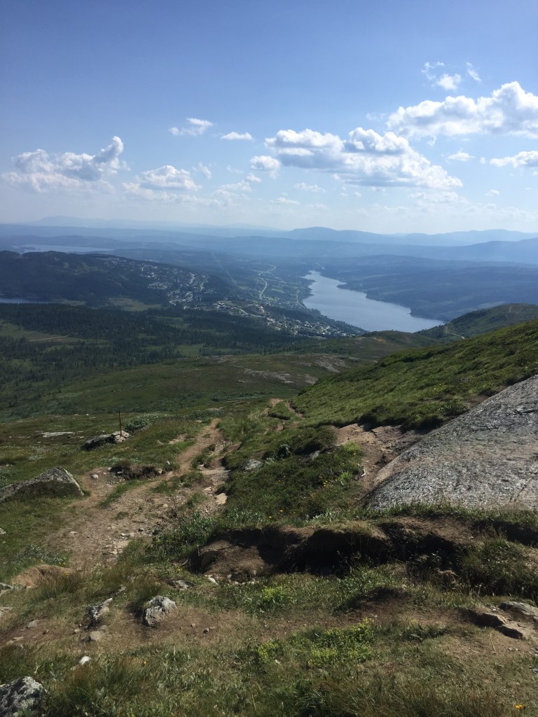 En itse oikein löytänyt Åresta mieluusta pyöräiltävää, mutta tunturin polkuverkosto tarjosi hyviä polkujuoksureittejä. Valikoin niistä omalle aamupäivävuorolleni keskivaikean 13 kilometrin lenkin, joka kulki alun nousun jälkeen hyvän matkaa avotunturissa ennen pitkää laskua alas kylään. Maisema ylhäältä oli komea, ja olisi täällä voinut useammankin reitin juosta mutta tällä kertaa kuumuus vei voiton naisesta.