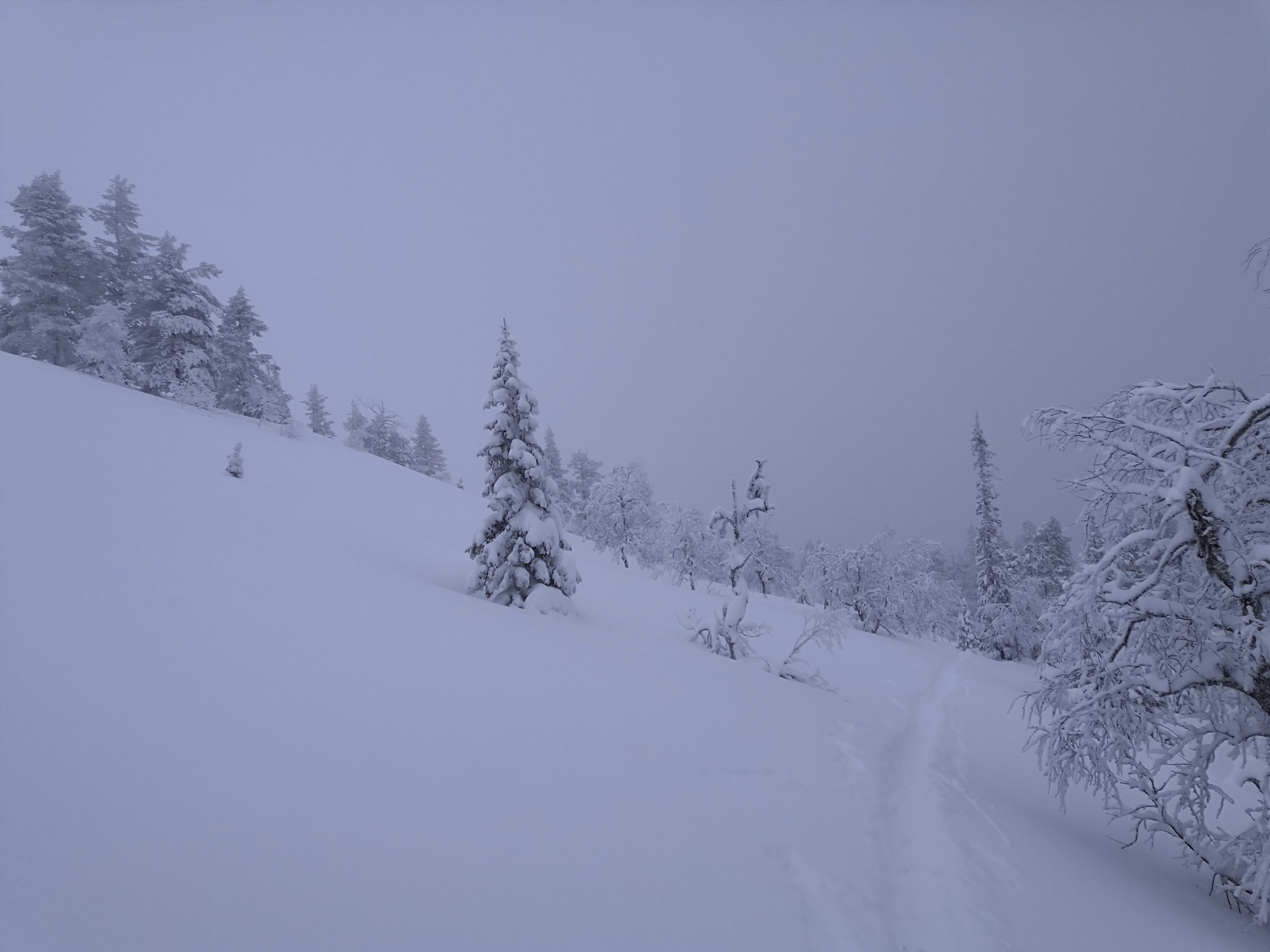 Nyt kun reissu oli todella lyhyt (kaksi yötä, kolme päivää), niin päätin käyttää keskimmäisen päivän Kesängin kiertoon. Päätöstä vahvisti vielä se, että Ylläksen hissit olivat kovan tuulen ja pyryn takia suurimmaksi osaksi kiinni. Metsässä ei myräkkä tuntunut ja lähdin kiertämään Kesänkiä myötäpäivään metsärajan alapuoella liikuskellen. Muutaman kerran käväisin vähän ylempänä, mutta tuuli ja tuisku ajoivat nopeasti takaisin metsän suojaan.