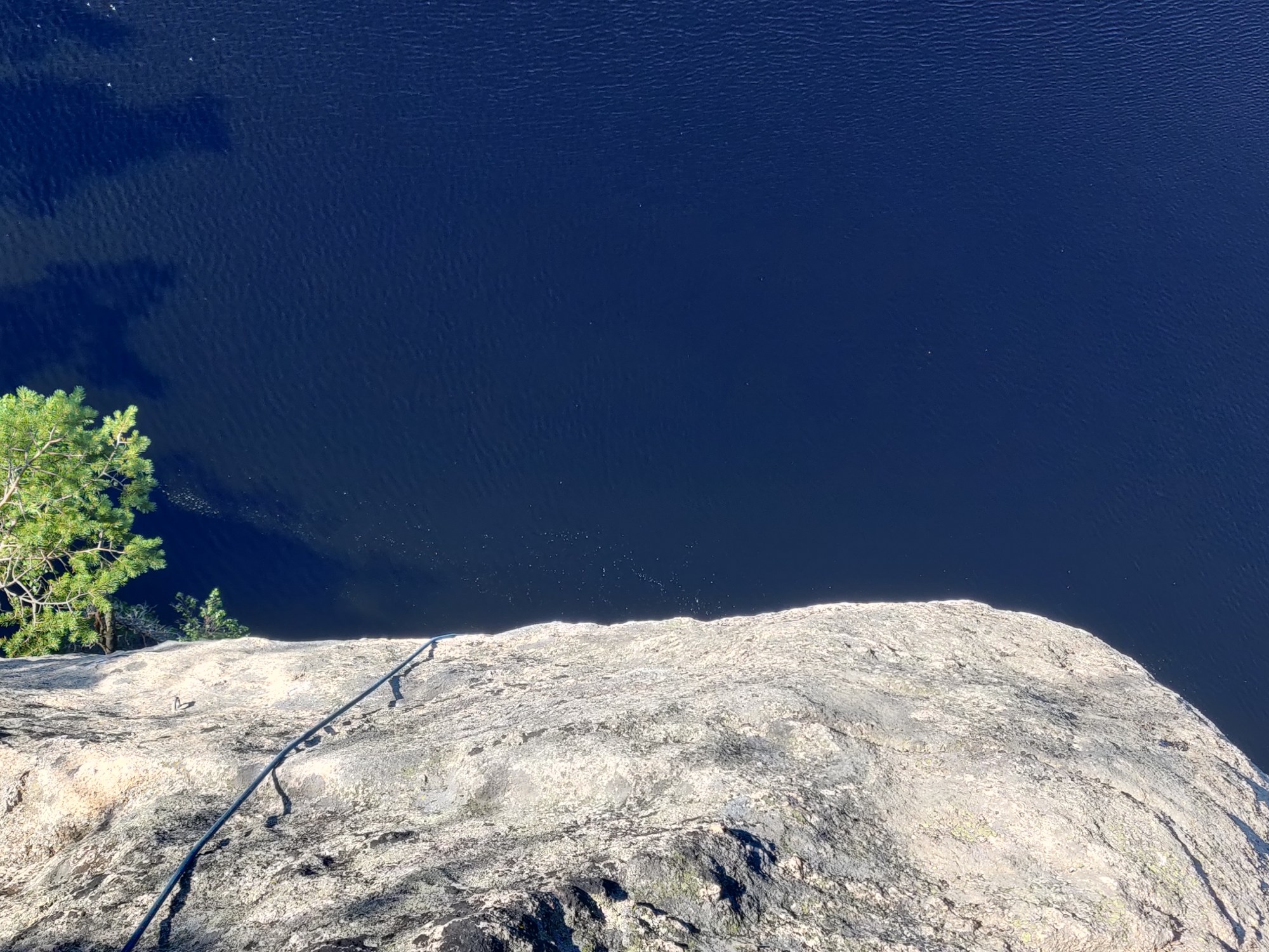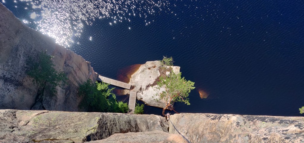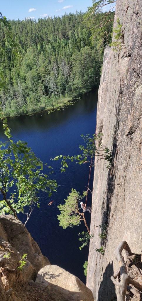 Nyt kun itse on saavuttanut keski-ikäisen miehen mitat ja täten päässyt eroon turhista yhteiskunnan kahleista sekä omista estoista, niin voin ihan rehellisesti yläköysitellä. Ja missä se olisi helpompaa kuin Olhavalla? Kävelet mäen päälle, teet ankkurin ja lasket kaverin vedenrajaan. Sitten vaan rauhassa istuskellen kelailet löysiä. Kaveri saa siinä maisemia katsellessasi reilut 40m maailmanluokan kiipeilyä. Miten tätäkään ei ole voinut tajuta aikaisemmin?