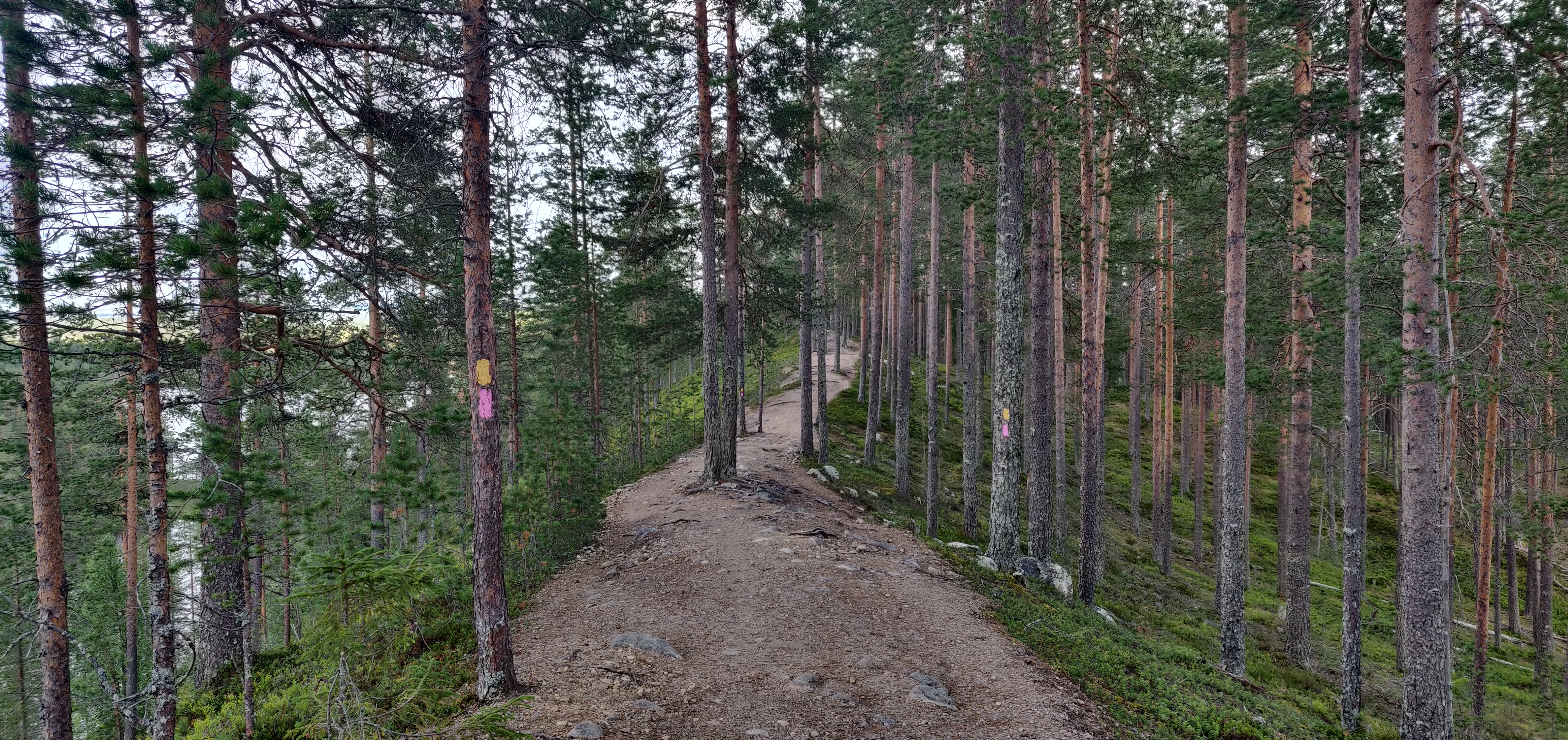 Yllätti positiivisesti. On latupohjaa, mutta käytännössä polkua. Kova jätkä ajaa ylös, mutta loppumäestä on aika hapokasta kivikkoa. Huippu on enemmän sorapolkua tai tietä, mutta silti ehdottomasti ajamisen arvoinen. Alaspäin polku on hauska ja ainakin tällä hetkellä minusta paras reitti alas – siis mukaan lukien bike parkin jonka yläasemalla myös pyörähdetään. Nopeaa tykitystä kunhan tajuaa oikaista ohi muutamat kinkamat pienempää polkua. Lopussa on vielä kovavauhtinen juuripolku luontokeskukselle saakka. Yllättävän pitkä ehjä kokonaisuus.