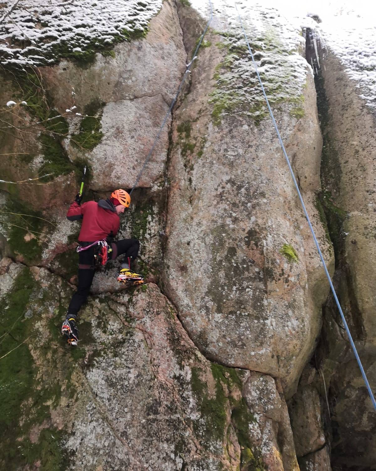 Kaivoin perjantaina kellarista pölyisen laatikon jossa on ollut pari viimeistä vuotta talvikiipeilykamat. Raudat alkaa olla aika done jo olivat todella tylsässä kunnossa. Hyvä kun pysyivät jalassa. Toiset hakut olivat jopa terässä. Pakkasin tavarat reppuun ja lauantai aamulla ihmeteltiin kaunista talvista maalaismaisemaa Mäntsälässä Aittakalliolle ajettaessa. Kunnon talvipäivä ja aitoa puhdasta pakkaslunta.