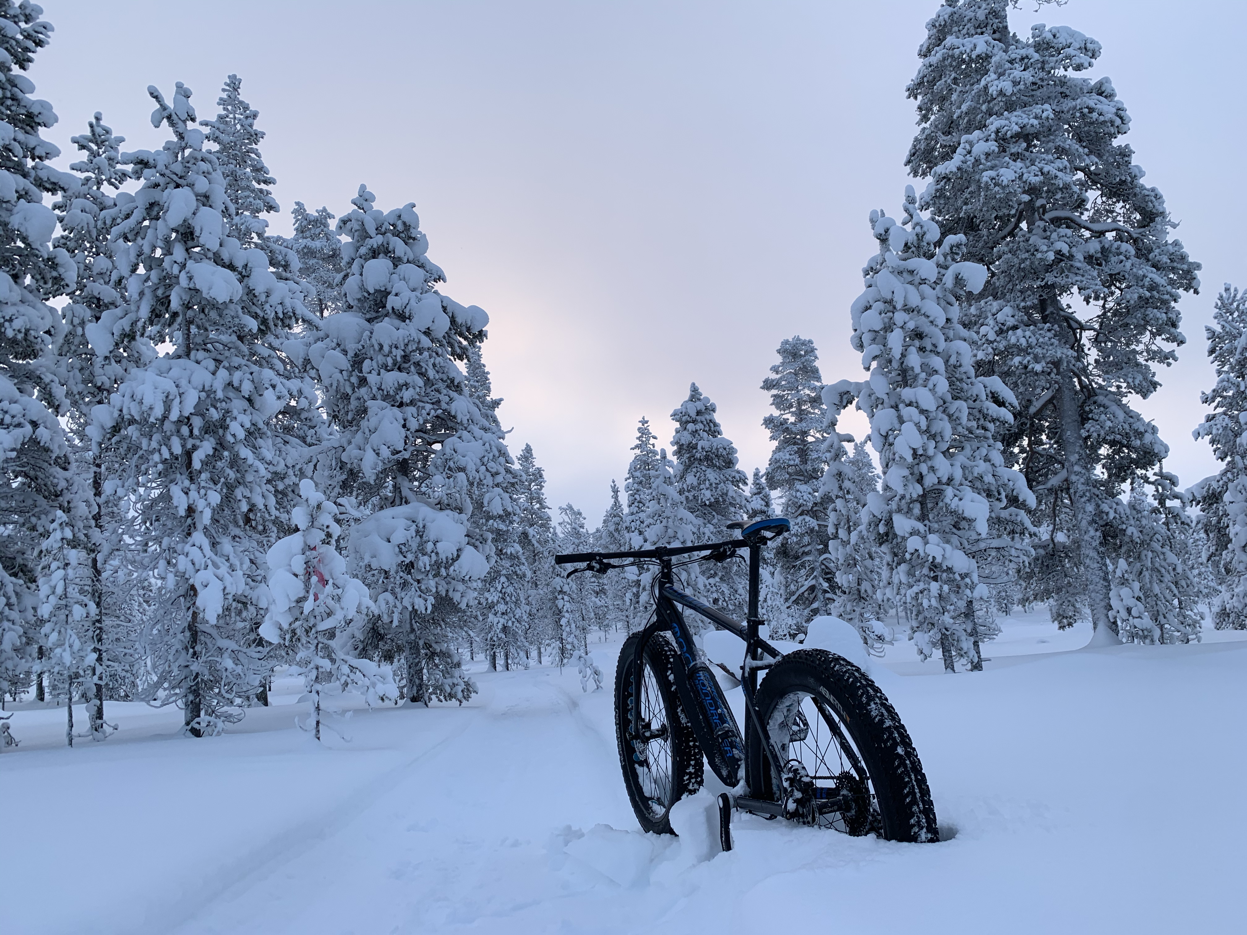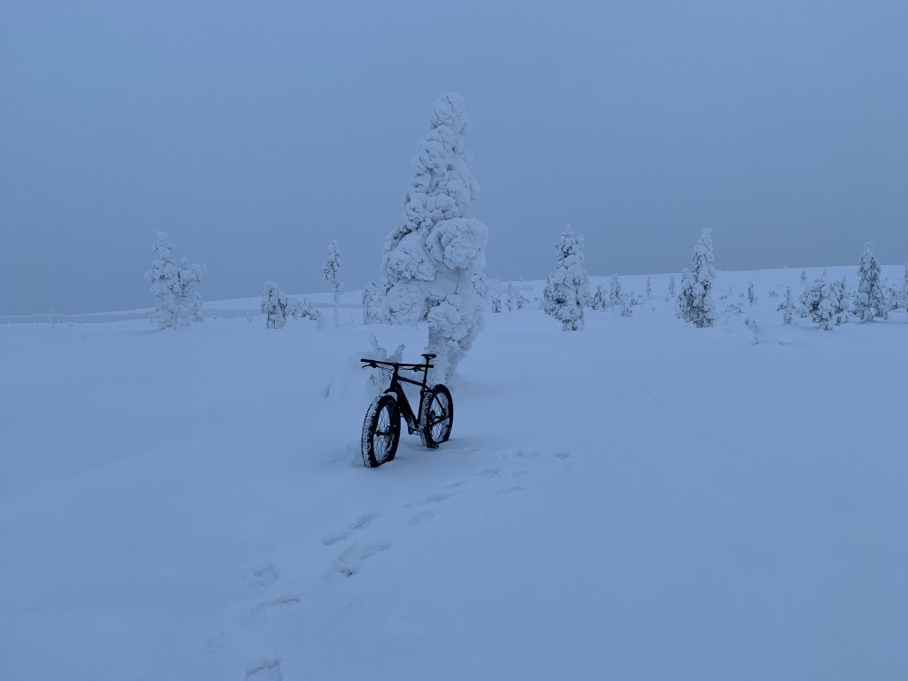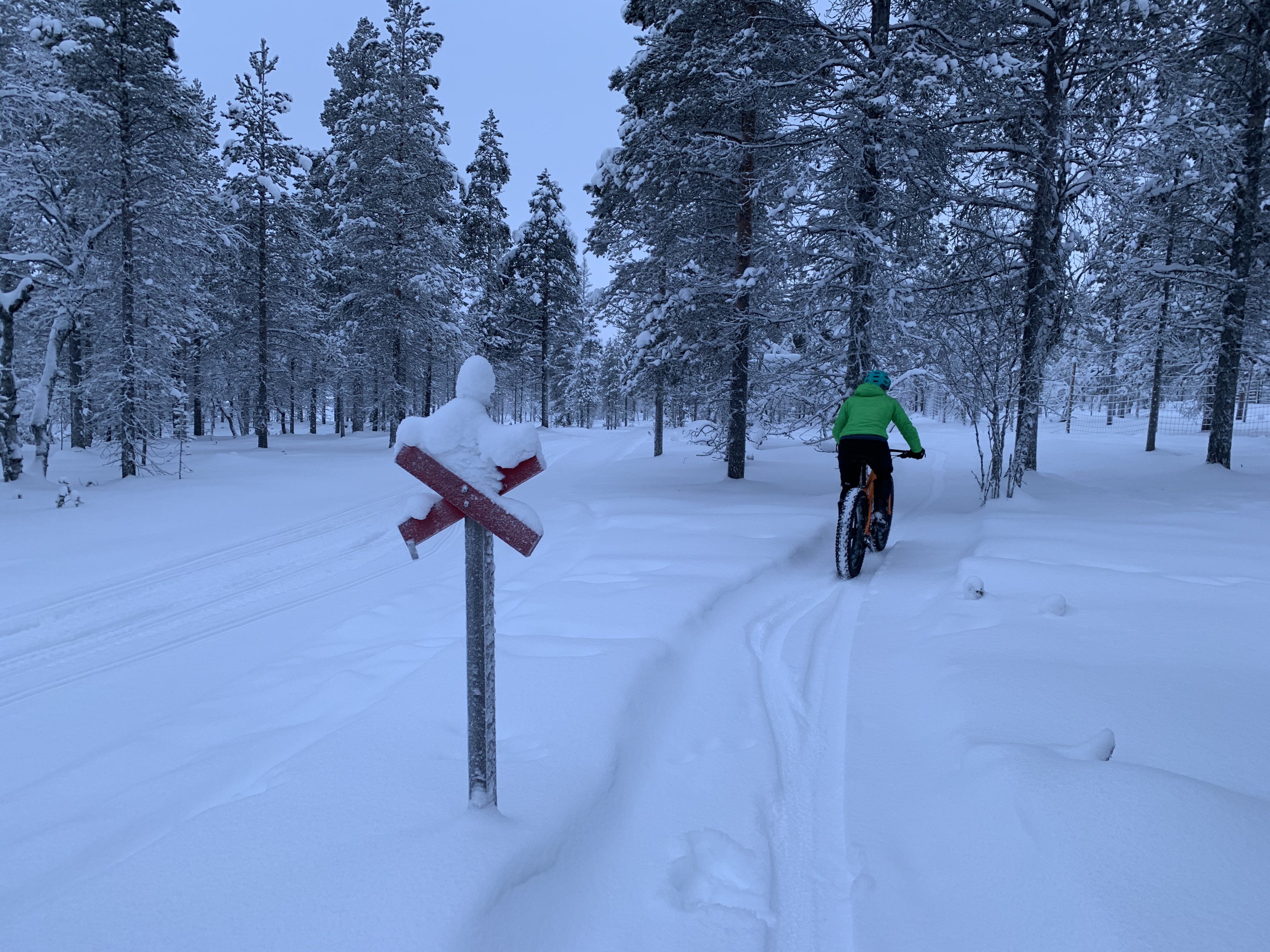 Talvipyöräilystä jäi vähän sekava mielikuva. Toki kelit eivät sitä millään muotoa suosineet. Aivan alkureissusta reitit olivat siedettävässä kunnossa, mutta kaksi viimeistä viikkoa meni lähinnä taluttamiseksi ainakin minun fätin 4″ renkailla, Päivin 4,8″ renkailla pääsi vähän paremmin. Saariselällä filosofia on ajaa reitit illalla, jotta ne kovettuvat yöllä, mutta jos yöllä tulee puoli metriä lunta, niin eihän ne mihinkään kovetu… Resursseista pulaa kuulemma, että ei voi ajaa myös aamulla. FB:stä päätelleen Kiilopäällä jengi oli tyytyväisempää pyöräreitteihin, mutta en sitten tiedä, kun ei siellä asti käyty. Ehkä kuitenkin reittien huoltoa pitäisi jotenkin kehittää, jos talvipyöräilyturismiin halutaan panostaa. Reittejä Saariselän ja Kiilopään välillä kuitenkin on paljon kunhan kelit suosivat.