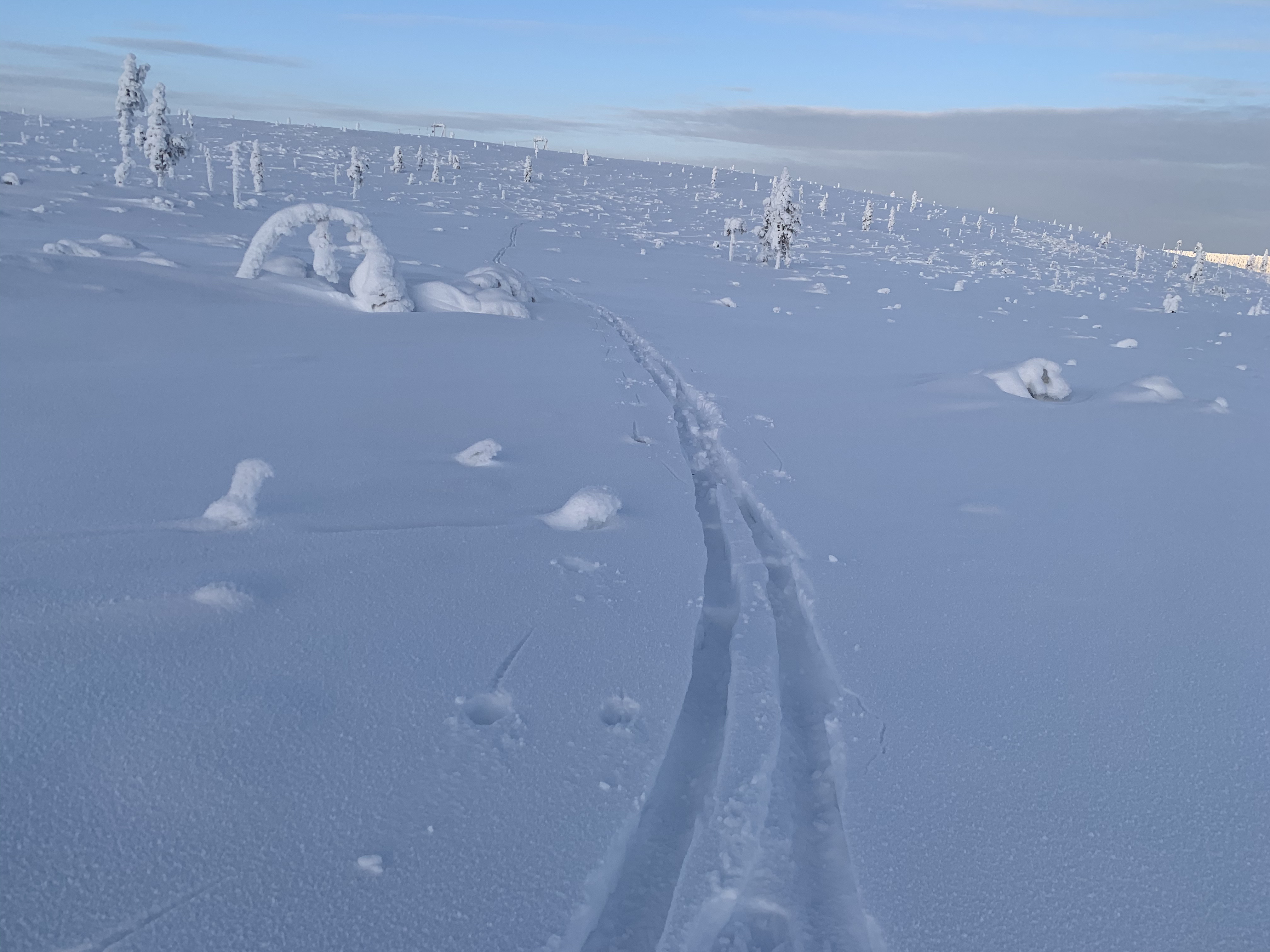Hiihtoladut nyt tietysti ovat Saariselällä hyvät ja niitä hoidetaan ahkerasti. Ei tosin tullut paljoa hiihdeltyä laskupuuterikelien vuoksi, mutta joka aamu latukone puski majapaikan ohi ja pyryistä huolimatta ladut näytti olevan vähintään kohtuullisessa kunnossa päivittäin. Toki hiihtäjiä oli nyt sen verran vähän, että kyllähän päivän mittaa ladut umpeenkin meni pahimpina pyrypäivinä.
