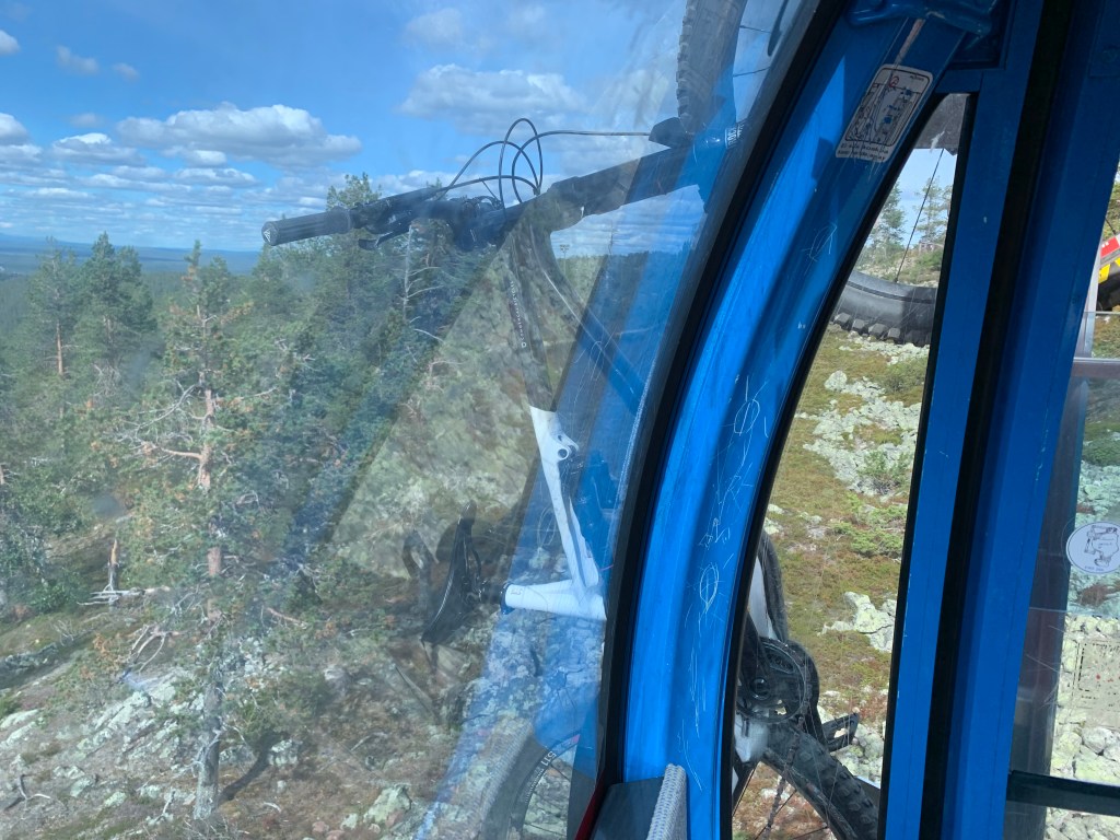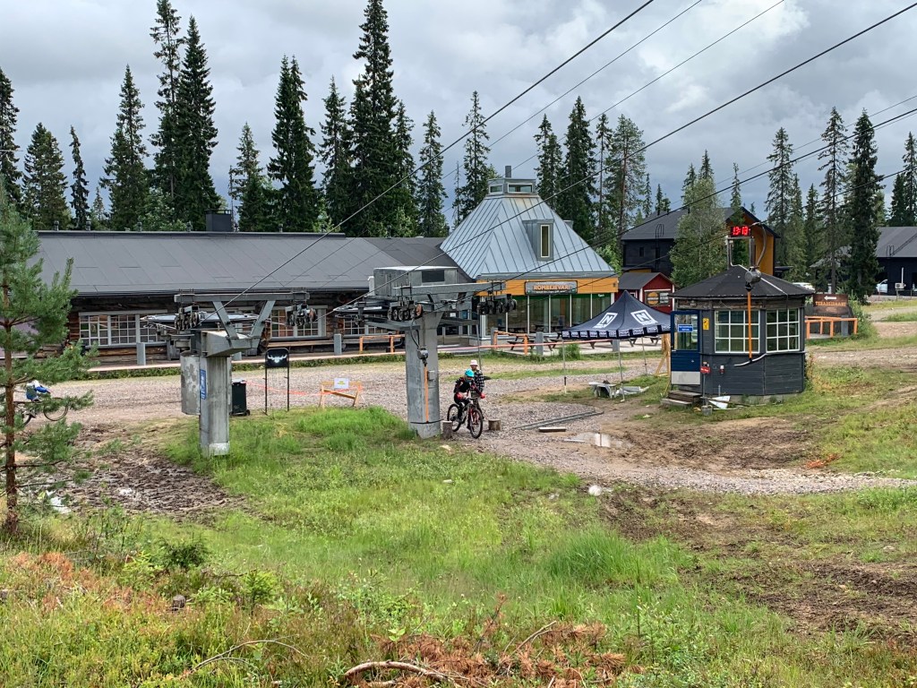 Iso-Syöte mainostaa itseään Suomen eteläisimpänä tunturina ja sitähän se varmasti jossain mielessä onkin. Komean kainuulaisen vaaramaiseman keskellä korkeimmalle kohoava Iso-Syöte varmasti täyttää jo ihan tunturinkin kriteerit vaikka toki huipulle johtava tie ja siellä oleva hotelli vähän tunturifiilistä latistavatkin. Toisaalta huippuhotelli ja sen ympärillä olevat muut majoitukset ovat varmasti komea paikka majoittua. Me majoituimme kuitenkin tunturin juurella aivan pyörähissin läheisyydessä. Ja hissistä on hyvä aloittaa Iso-Syötteen bike parkin arvioiminen. Hissin plussa ja miinus on sen nopeus. Plussa tietysti siksi, että huipulle pääsee nopeasti ja miinus siksi, että ainakin aloittelijalle hississä voi olla haastava pysyä etenkin kun ura on paikoitellen melko kapea. Lisäksi hissin syystä tai toisesta pysähtyessä, liikkeelle lähtö on todella haastavaa. Itsellä se ei onnistunut sen ainoan kerran, kun hissi pysähtyi. Pidin rennosti molemmin käsin kiinni ohjaustangosta ja hissin lähtiessä liikkeelle kapula ampaisi kuin tykin suusta maisemaan ja kuski jäi ihmettelemään mitä tapahtui. En tiedä millainen on-off-asetus Iso-Syötteen hissin liikkeellelähdössä on, mutta hieman pehmeämpi startti kyllä helpottaisi hississä pysymistä. Kaikesta huolimatta hissi on kuitenkin suhteellisen helppo kunhan keskittyy pysymään nousulinjalla, pitää kiinni varmuuden vuoksi kapulasta epätasaisempien kohtien röykytyksen vaaralta ja toivoo ettei hissi pysähdy.