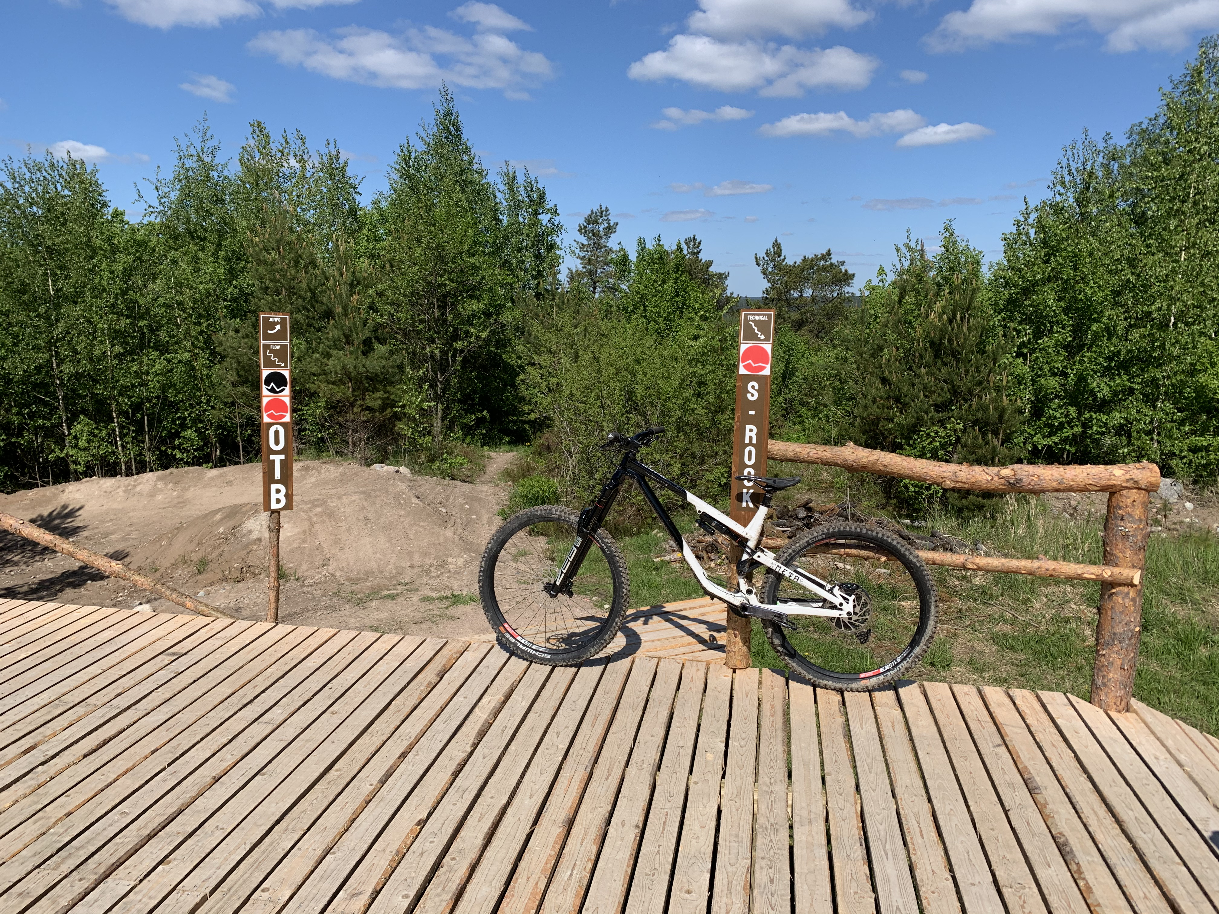 Sitten on ne mustat reitit. Jordie ja OG DH hissin vieressä huoltorakennuksen puolella ja Hybrid toisella puolella. Jordie ja OG DH ovat pääosin ihan mukavia reittejä. Alussa mukavia bermejä ja taitaa olla pöytähyppyreitäkin, sitten pieni pudotus kalliolta laskettelurinteelle ja sen takana mukavaa polkua hissin viereisessä metsässä, mutta sitten ne gäppihyppyrit joita tuskin uskallan ikinä laskea. Jordiella on myös komea puulaiturirolli, jonka alkuosa on miltei pystysuora tai ainakin tuntuu siltä. Pari kertaa olen käynyt katselemassa, mutta vielä on alas tulematta. Täytynee käydä harjoittelemassa kotikulmien kivirolleilla ennen seuraavaa yritystä. Hybridia en ole edes käynyt katselemassa, mutta haasteena siellä ovat ne gäpit samoin kuin uudella mustalla, joka on tulossa ensi kesäksi OTB:n uusitun loppuosan viereen.