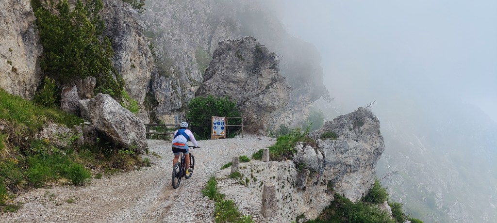 Ajaminen on tietysti enemmän retkimeiningillä ja itse reitin kokemista. Suoritus ei ole niin keskiössä muuten kuin vauhdikkaammilla osuuksilla. Alaspäin ajaessa raskaampi ja hyvin jousitettu pyörä tuo turvaa ja tasaisuutta. Vuokrapyörälläkin uskalsi vähän fiilistellä leveimmillä osuuksilla ja ajamisen ilo välittyy kyllä vaikkei sitä ominta juttua olekaan. Loppulasku Gardalle ja Tremalzon harjanne olivat upeita ja kelle vaan pyöräilijälle kokemuksia. Sähkö mahdollistaa tämän monelle.